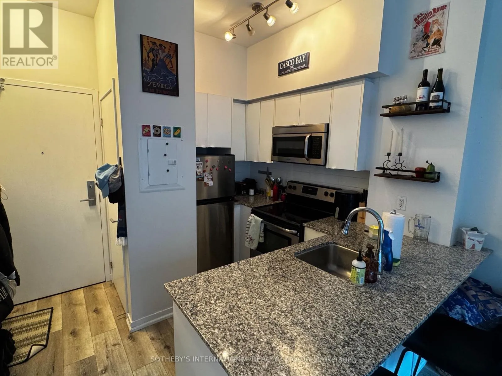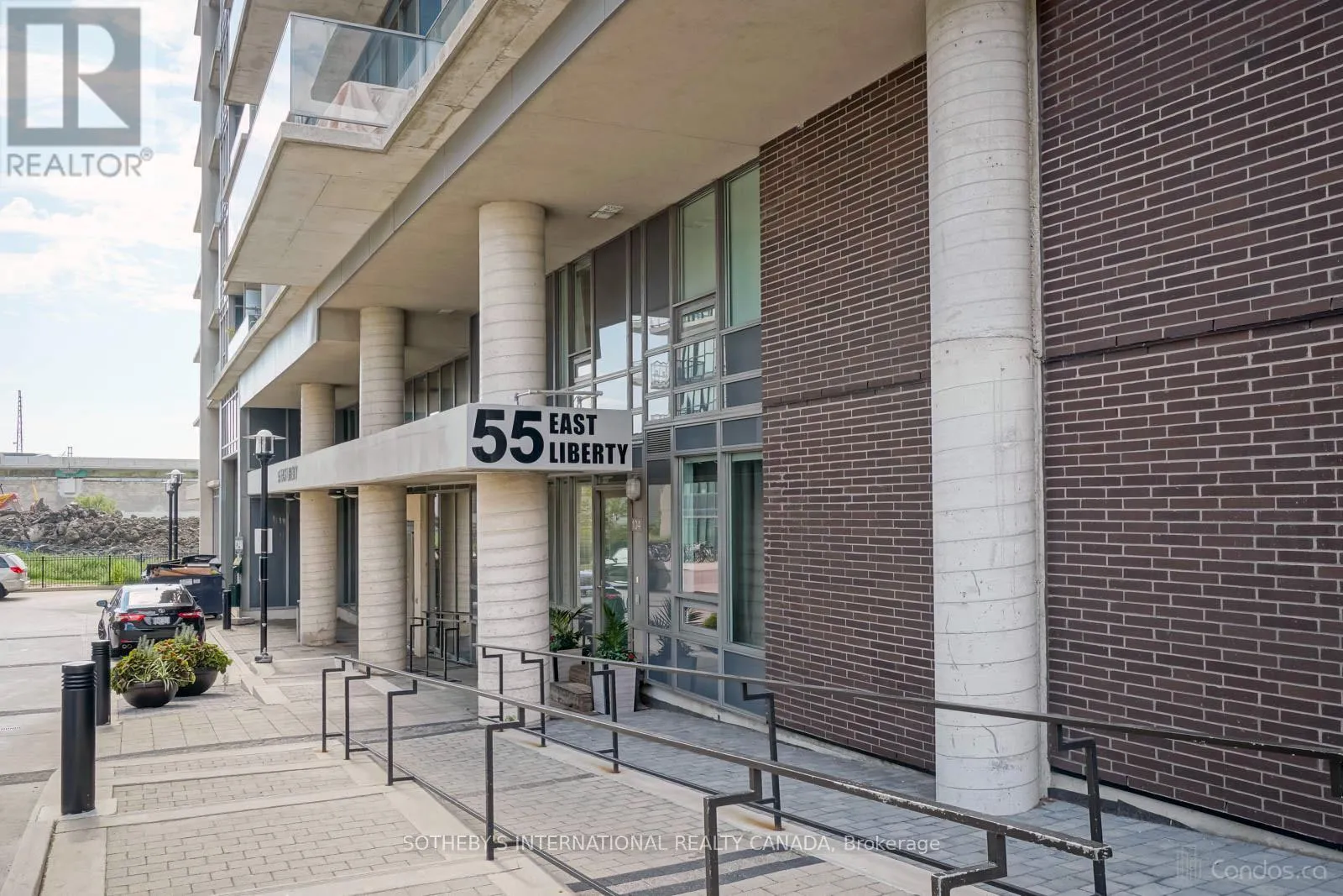 Cross Streets: King and Stratchan. ** Directions: Use GPS. Welcome to Bliss Condos, a stylish ground level studio offering soaring ceilings and massive windows that fill the space with exceptional natural light. The layout is thoughtfully designed with absolutely no wasted space, creating a seamless flow between living, sleeping, and dining areas ideal for modern city living. The north facing balcony extends the living space outdoors and adds excellent everyday functionality for relaxing or entertaining.The modern kitchen features full size stainless steel appliances, a breakfast bar, and granite countertops, combining clean design with practical efficiency. A well appointed four piece bathroom, ensuite laundry, and the use of one locker add everyday comfort and convenience.Residents enjoy premium amenities including an indoor pool, fitness room, party and meeting room, and a 24 hour concierge, along with a rooftop deck, guest suites, car wash, and visitor parking. Perfectly situated in the heart of Liberty Village, this location is steps to Metro, GoodLife, Starbucks, LCBO, TTC and GO Transit, with King West, restaurants, grocery stores, and the waterfront all close by. A bright, efficient studio offering lifestyle, convenience, and strong urban appeal. (id:27476)