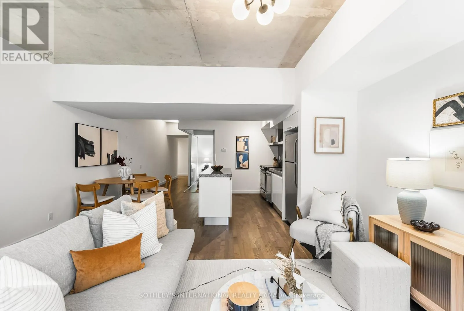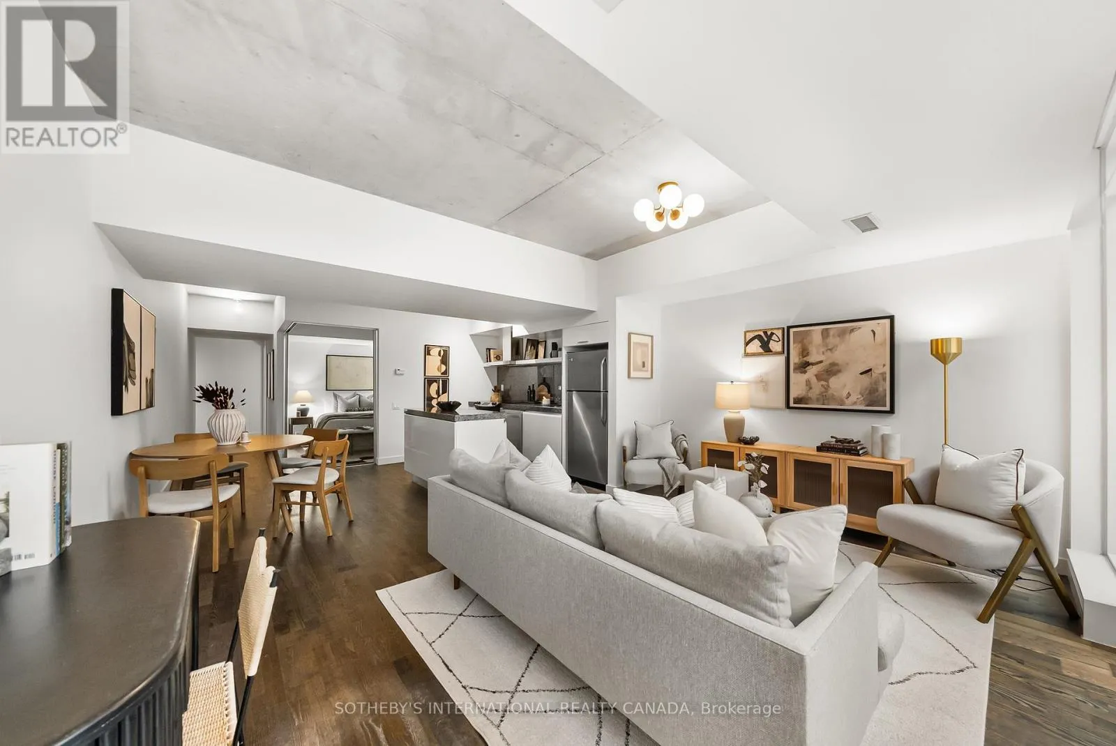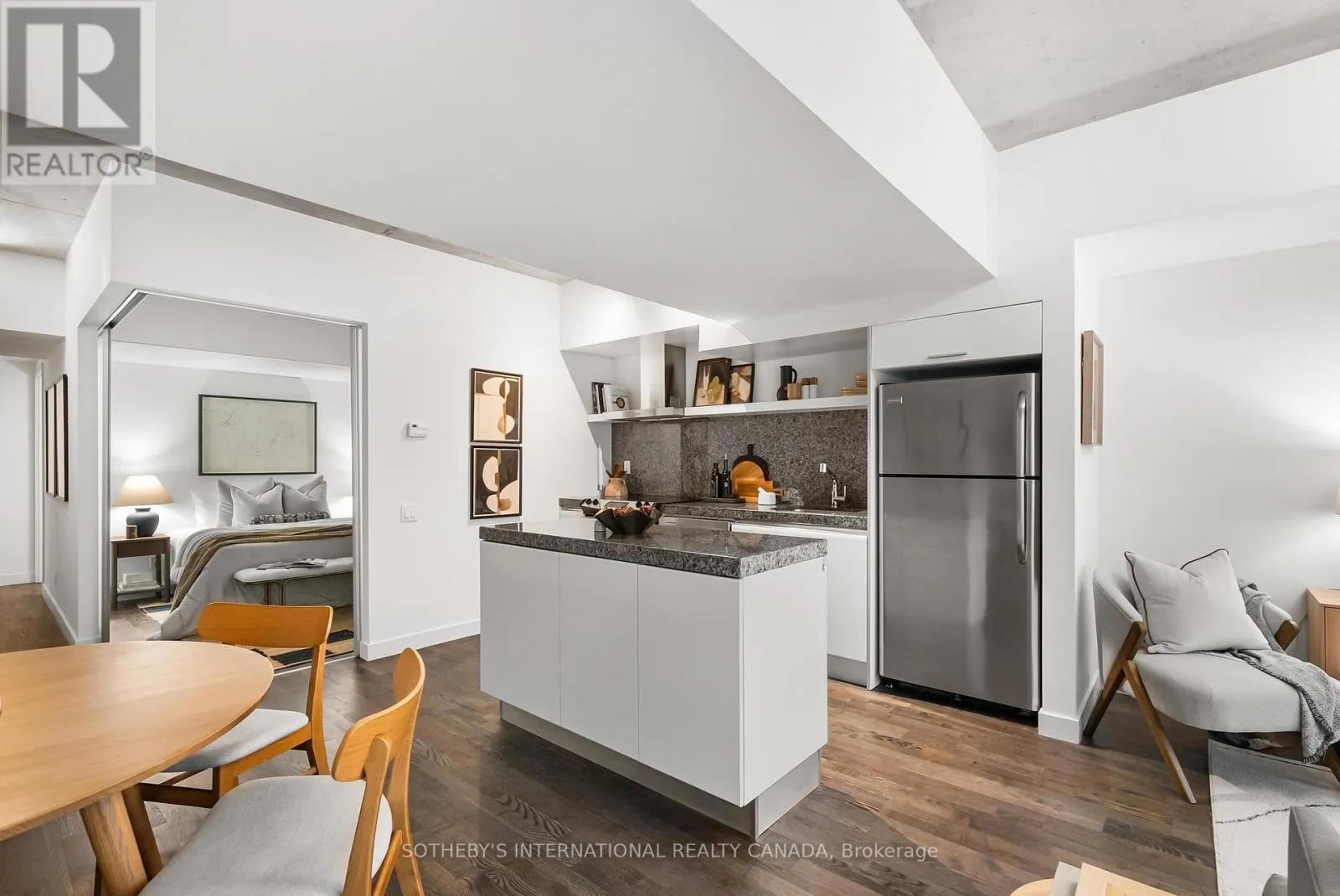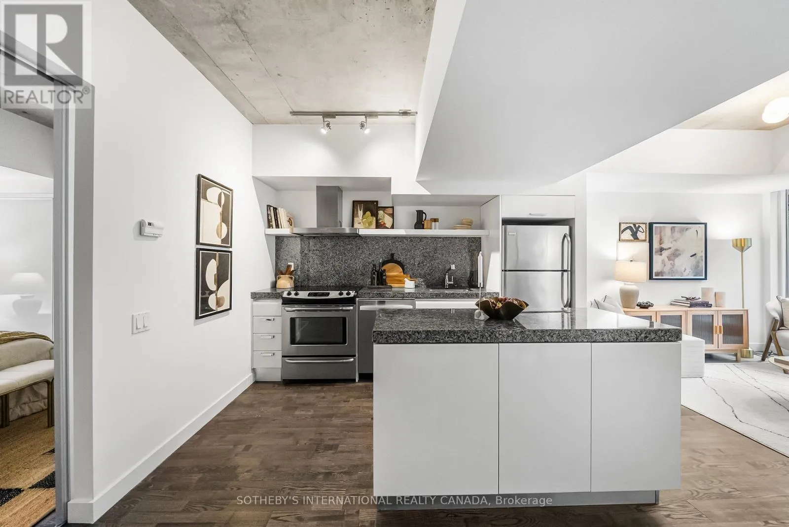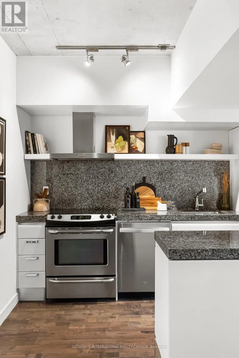 Cross Streets: King and Portland. ** Directions: Please, follow your GPS. Discover 828 square feet of refined, contemporary living in this spacious 1-bedroom loft at 75 Portland - an architectural landmark designed with Philippe Starck's unmistakable vision. Set on the main level and quietly tucked away from the energy of King and Portland, this suite offers a rare sense of calm in the heart of downtown's most vibrant neighbourhood. Inside, the loft unfolds with effortless flow. A sleek, oversized kitchen with a centre island anchors the home, creating a natural space for gathering and entertaining. The open-concept layout offers generous room for a home office while maintaining a warm, inviting atmosphere throughout. Step outside to a private 100 sqft terrace with BBQ gas line - an intimate outdoor retreat that feels like an extension of the living space. Perfect for slow mornings, relaxed evenings, or alfresco moments that elevate everyday living. The tranquil bedroom features wall-to-wall closets that blend clean design with exceptional storage. A well-appointed four-piece bath completes the suite with a thoughtful, timeless finish. As one of King West's most design-forward communities, 75 Portland offers residents access to its bold open-air courtyard and Starck's signature 100-foot indoor-outdoor communal table - amenities that blur the boundaries between architecture, art, and urban life. Placed within one of King West's most walkable pockets, you're steps to Victoria Memorial Square, St. Andrew's Dog Park, Stanley Park, and the endless cafés, boutiques, restaurants, and fitness studios of King West, Queen West, and The Well. Here, design, convenience, and city living converge in a way that feels both vibrant and deeply peaceful. A truly rare offering - come experience it for yourself. (id:27476)