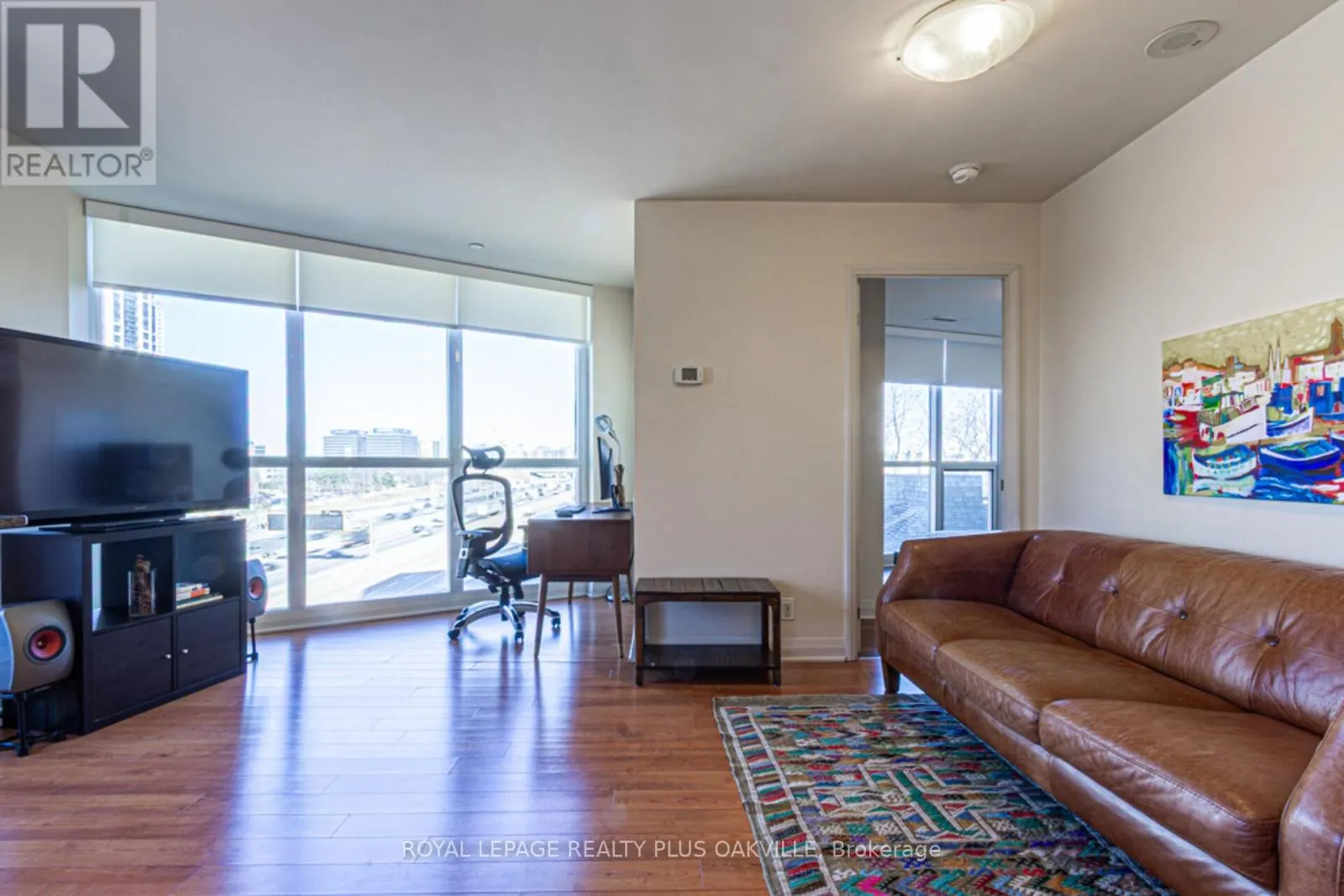 Burnhamthorpe/Hwy 427 This 5th floor, 1-bedroom + den condo in Valhalla offers just under 700 sq ft of living space with an open-concept layout and floor-to-ceiling windows. The den, measuring 8 x 8 feet, can serve as an office or potential second bedroom. The main living area includes an additional office nook, while the kitchen features a large movable island and pantry. The bedroom, which fits a queen bed, has a walk-in and a linen closet. Recent updates include bedroom laminate flooring (2016), a Bosch washer and dryer (2018), a Bosch dishwasher (2022), pull down window blinds (2024) and front entrance sliding mirror closet doors (2025). Valhalla provides numerous amenities for residents. The building offers 24-hour concierge service, multiple gyms, an indoor pool and hot tub, yoga rooms, saunas, a theatre room, a billiard room, a children's play room, and two party rooms. Three guest suites are available for rental, and the building is pet-friendly, allowing two pets per unit. The condo's location near the parking spot and storage on the 3rd floor adds convenience. With low-cost internet options and a policy against short-term rentals, Valhalla combines comfort and practicality for its residents. (id:27476)