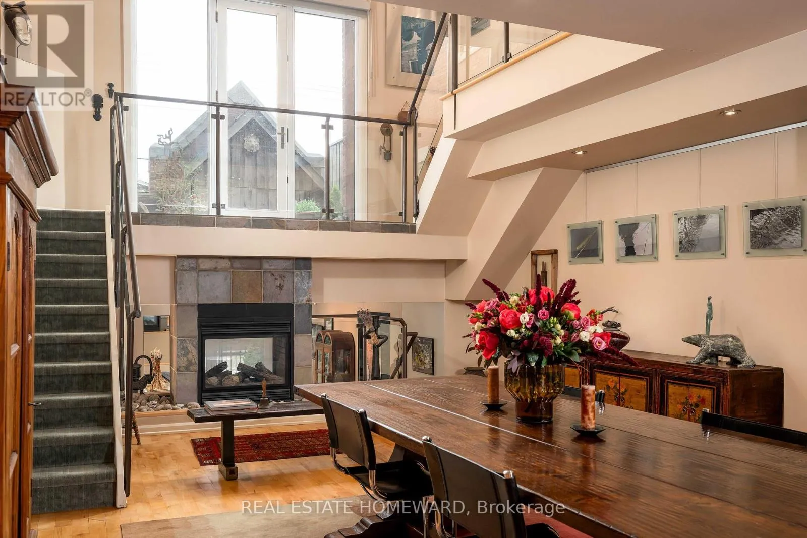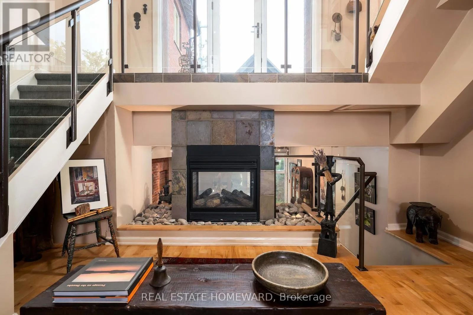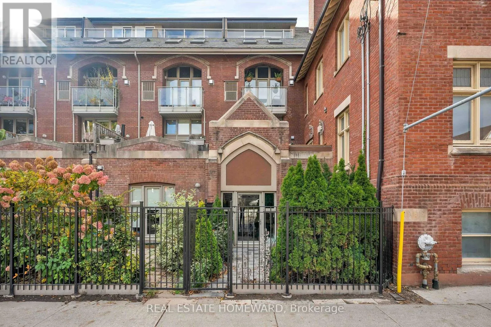 Cross Streets: Pape Avenue & Danforth Avenue. ** Directions: South of Danforth West side of Pape. Unique church loft spanning over 2,250 square feet in desirable Riverdale neighbourhood. Once the Riverdale Presbyterian Church, this is remarkable 2004 Bob Mitchell conversion. Exposed brick walls and sculptural staircases are combined with warm hardwood floors and a two sided gas fireplace. Open and bright with floor-to-ceiling windows from the upper & lower levels yet also private. Enjoy your own private street level patio entrance and second level enclosed terrace. The main floor has a second bedroom with sliding doors and bath ideal for guests and additional entertaining room. The kitchen is outfitted with marble counters, a geometric island & breakfast bar which leads to dramatic dining area framed with 17 ft ceilings and exposed brick walls. A few steps down and you enter an inviting living area with access to additional below grade room ideal for wine tasting, workout space, or reading room. Upstairs is a expansive primary suite containing a 4- pc ensuite, walk-in closet, and open office. This is the largest suite in the building, and one of the most unique and appealing offerings you will find. Steps to incredible schools, parks, subway, shops and restaurants. (id:27476)
