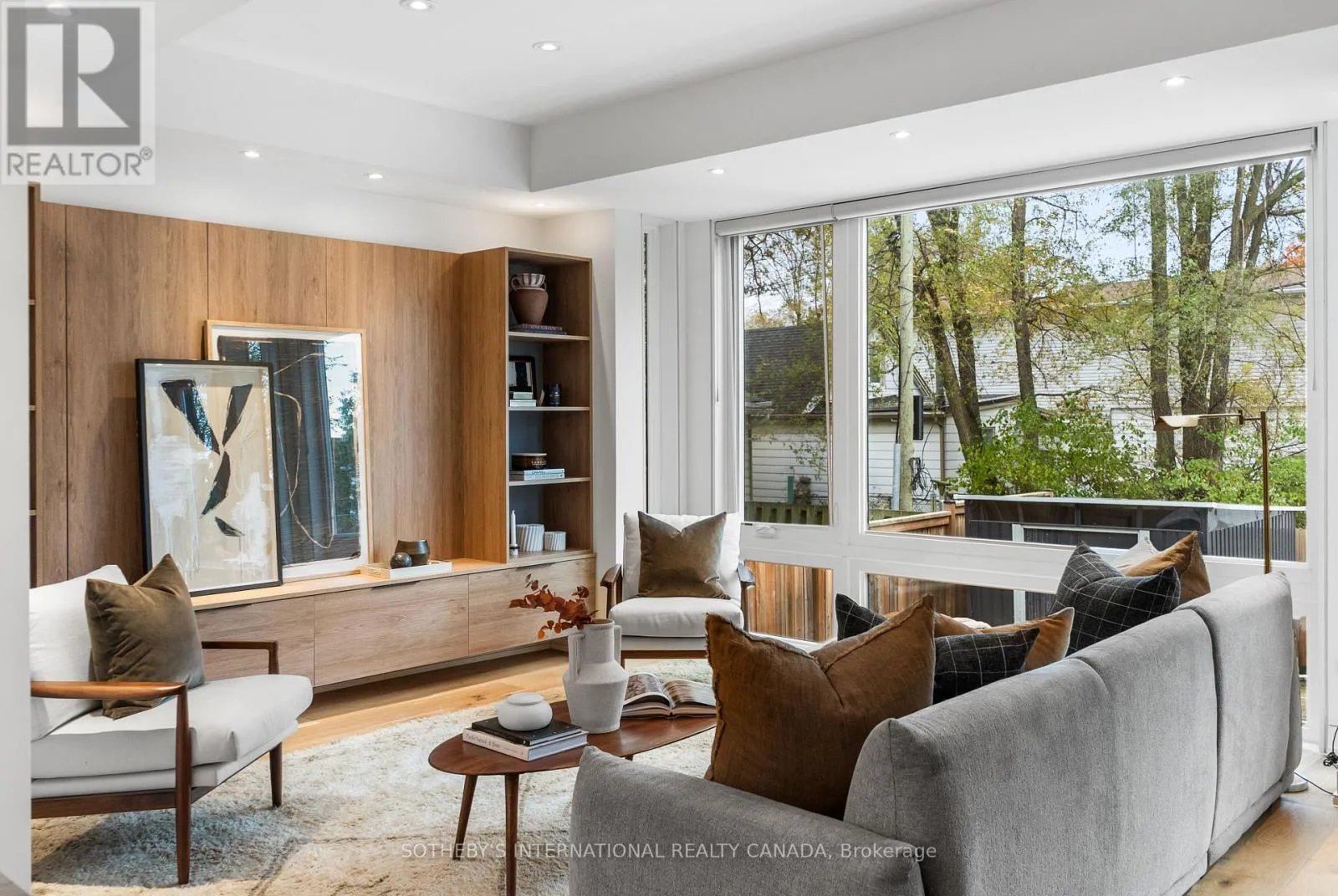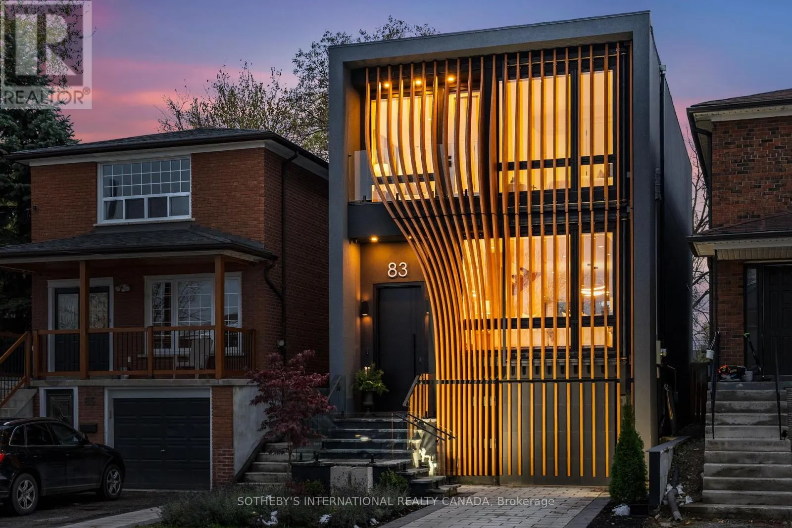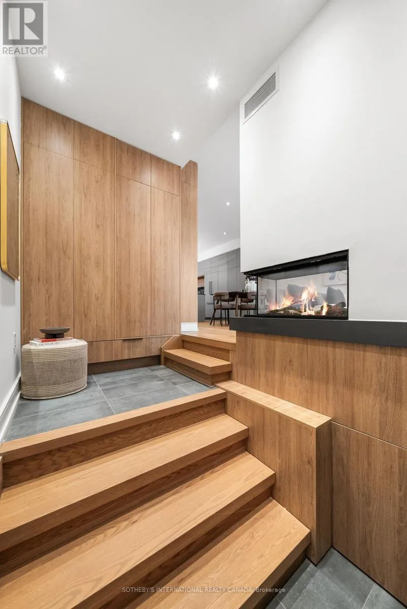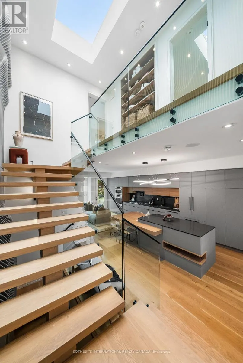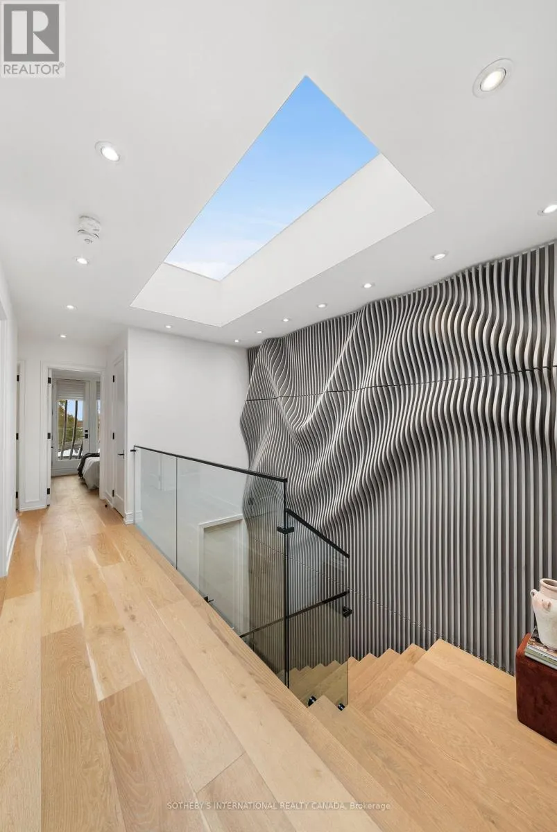 Cross Streets: Coxwell Ave & Cosburn Ave. ** Directions: Please, follow your GPS. From the moment you arrive, 83 Virginia Avenue stands apart with its striking wood façade and carefully considered design. Inside, the spaces are filled with light, natural materials, and a sense of balance that makes the home both sophisticated and comfortable. The main floor flows effortlessly between living, dining, and kitchen areas framed by floor-to-ceiling windows and rich hardwood flooring. A gas fireplace adds warmth, while the custom kitchen combines quartz counters, integrated dining, and built-in cabinetry designed for everyday living. At the rear of the home, the family room features warm custom-built-ins and opens through a glass door to a lovely private garden with a beautiful garden shed. A sculptural staircase ascends beside a dramatic 27-foot feature wall crowned by a skylight, drawing natural light deep into the home. Upstairs, the primary suite offers a calm retreat with custom wall-to-wall built-in closets, floor-to-ceiling windows, and a spa-inspired ensuite with a walk-in shower and deep soaking tub. Three additional generously sized bedrooms and a well-appointed laundry room- illuminated by its own skylight- complete the second level. The lower level extends the living space with a bright recreation room featuring a wet bar, built-in storage, and a large glass door that opens directly to the backyard. A convenient side-door entry enhances functionality, and a private guest bedroom and full bath provide comfort and flexibility for visitors. A built-in garage and private drive offer parking for three vehicles. Every finish, fixture, and proportion reflects careful thought- creating a home that feels both refined and welcoming. (id:27476)