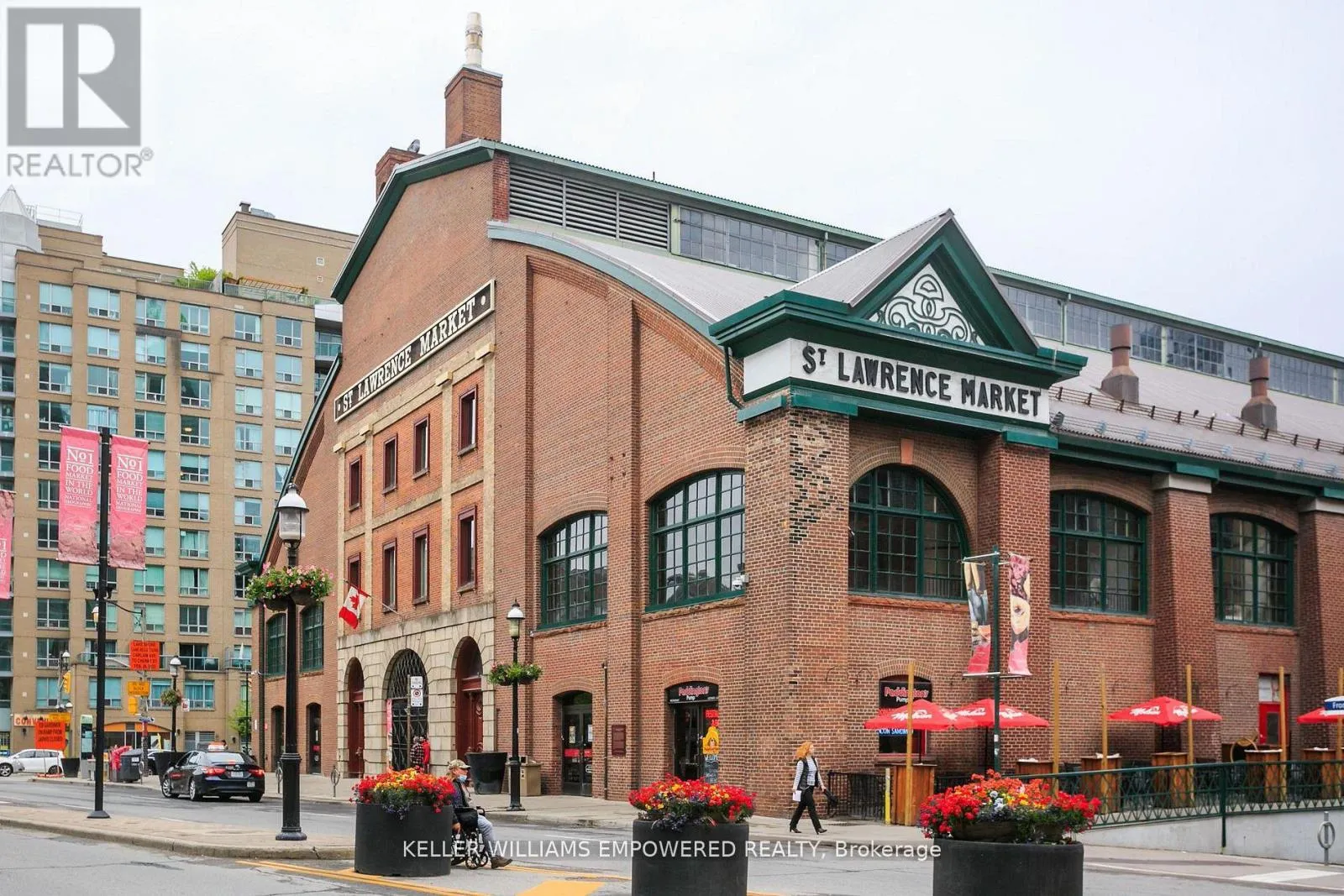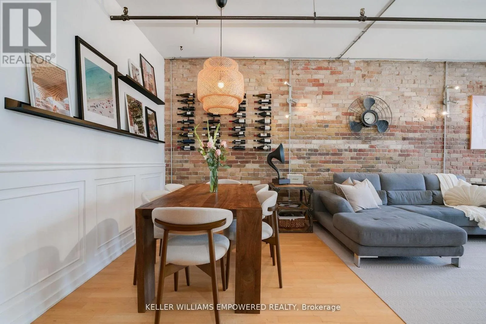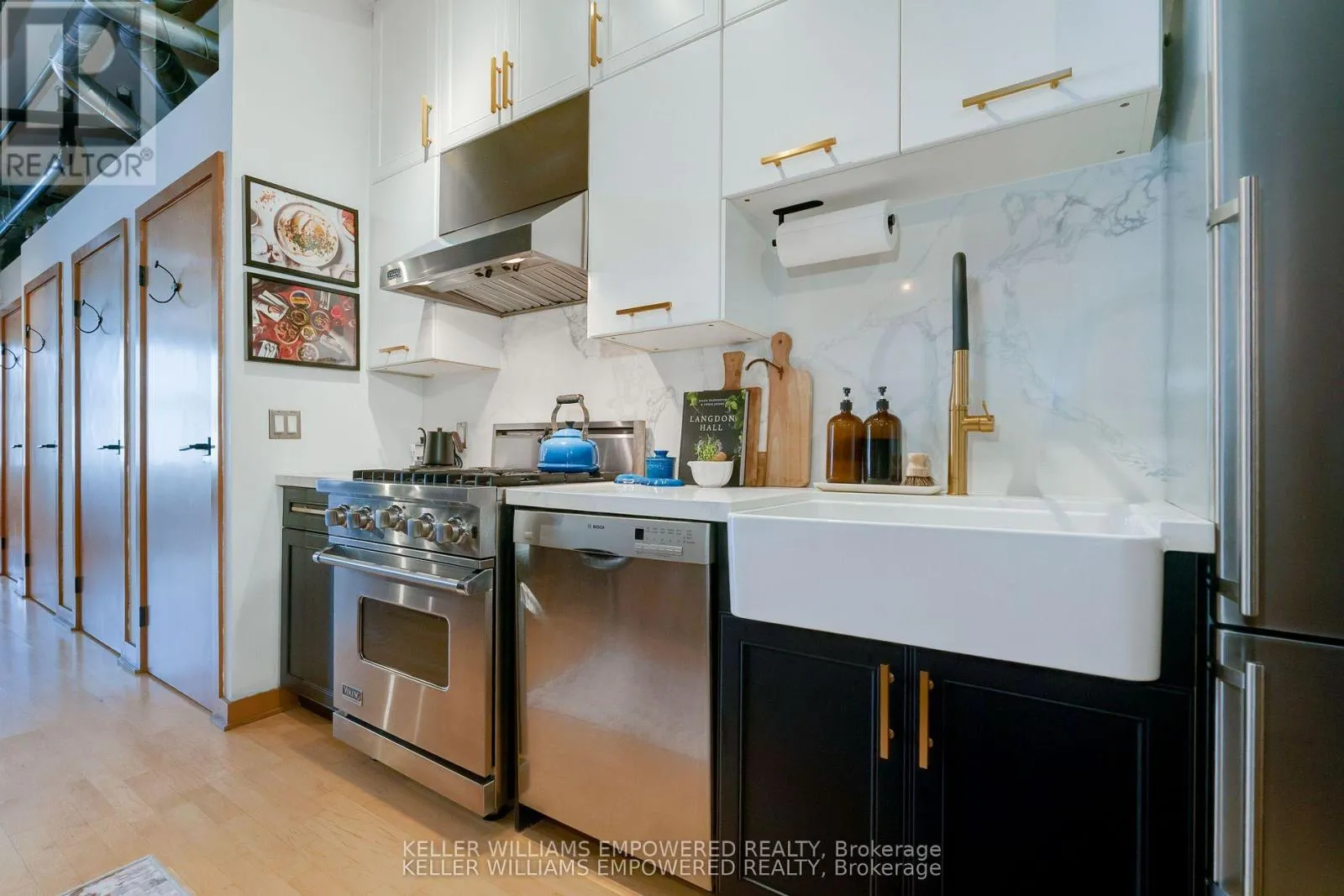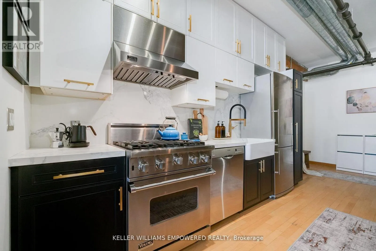 Queen St. E/George St. Welcome to Suite 5 at the iconic Boiler Factory Lofts, a boutique heritage conversion with only 11 units where authentic hard loft living meets warmth and character. This is the kind of space you usually see in movies or magazines--charming and architecturally unique--offering exceptional long-term value with the upcoming Ontario Line Subway and a redesigned park directly across the street. Approximately 900 sq.ft. of inspiring loft living features exposed brick and beams, soaring 10-ft ceilings, oversized factory-style windows filled with natural light, and a dramatic 30-ft statement chalkboard wall. The fully upgraded kitchen is built for serious cooking and entertaining, complete with ceiling-height cabinetry, a Viking professional gas range and hood, Blomberg fridge, Grohe semi-professional faucet, and Franke fireclay farmhouse sink. Thoughtful layout includes a spacious bedroom that easily fits a king-size bed, formal dining area, two closets, ensuite storage, and laundry closet. Step outside to your private 245-sq.ft. rooftop terrace-an urban oasis with striking skyline views, perfect for unforgettable evenings. Convenient parking on Britain Street with direct rear access. Walk Score of 98, just steps to St. Lawrence Market, Eaton Centre, Distillery District, Financial Core, parks, and quick access to the Gardiner and DVP. A rare offering for those who refuse to settle for cookie-cutter. (id:27476)