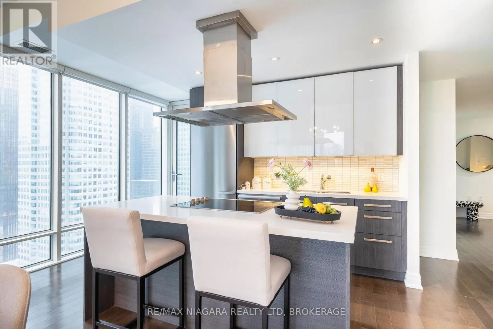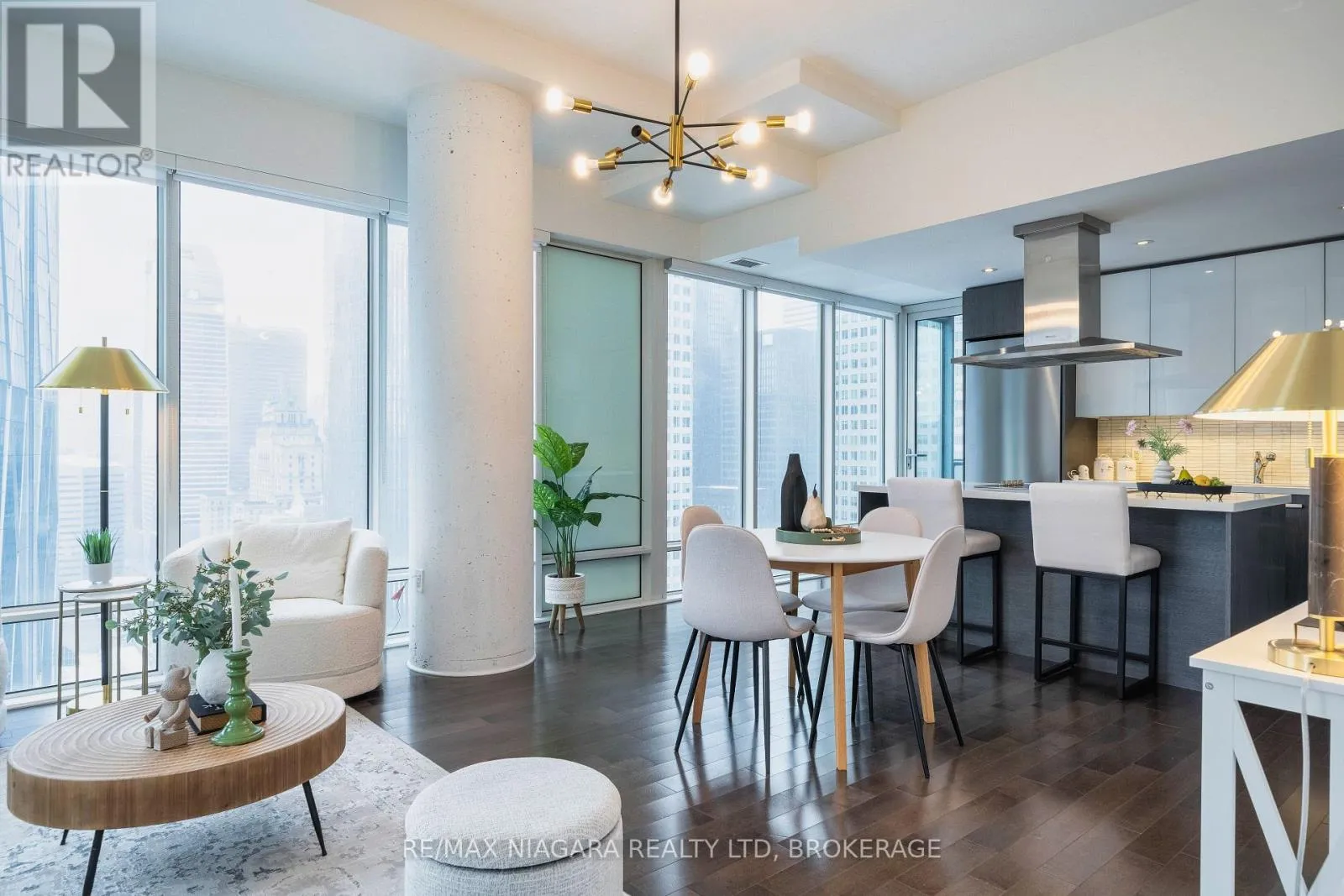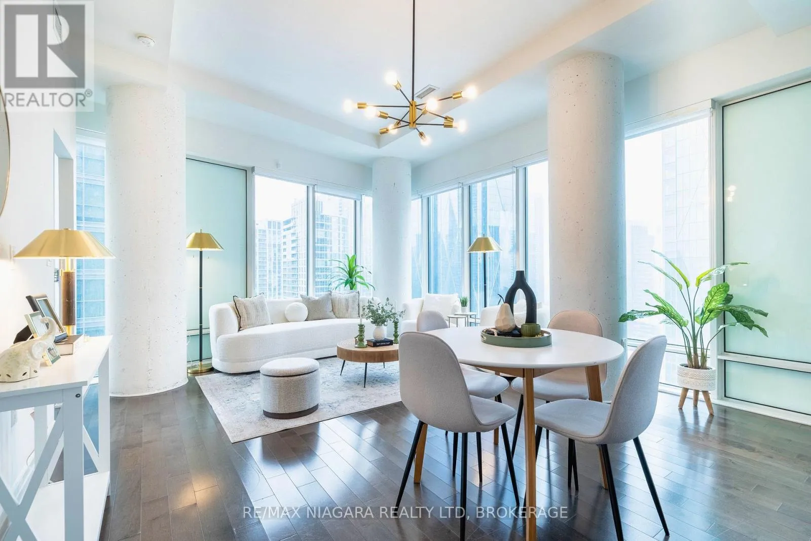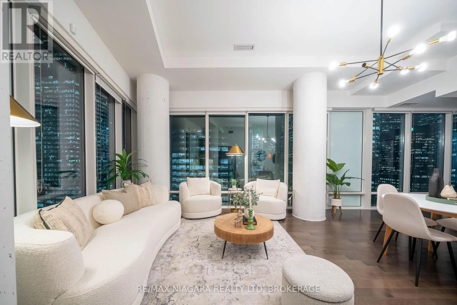 Yonge & Front Welcome to 8 The Esplanade, an iconic address offering refined urban living in the heart of downtown. This executive two-bedroom plus den residence provides over 1,000 square feet of thoughtfully designed interior living space, complemented by a private balcony. Soaring ceilings and expansive picture windows bathe the suite in natural light while framing impressive city views.Upon entry, the home reveals a bright, open-concept layout enhanced by floor-to-ceiling windows and premium finishes throughout. The residence features hardwood flooring, a contemporary kitchen equipped with high-end stainless steel appliances, an elegant backsplash, and a centre island ideal for casual dining or entertaining. Additional enhancements include custom closet organizers and recessed pot lighting.The well-appointed layout includes two generously sized bedrooms with ample storage, as well as a spacious den perfectly suited for a home office or professional workspace. Residents enjoy access to an exceptional collection of amenities, including 24-hour concierge service, an indoor pool, a fully equipped fitness centre, a party room, guest suites, and more.Surrounded by world-class dining, shopping, transit, and entertainment, this residence offers unparalleled convenience. Ideally situated steps from Union Station, the PATH, the Waterfront, St. Lawrence Market, and numerous downtown attractions, this is sophisticated city living at its finest. ***One indoor parking spot and one locker are included*** (id:27476)