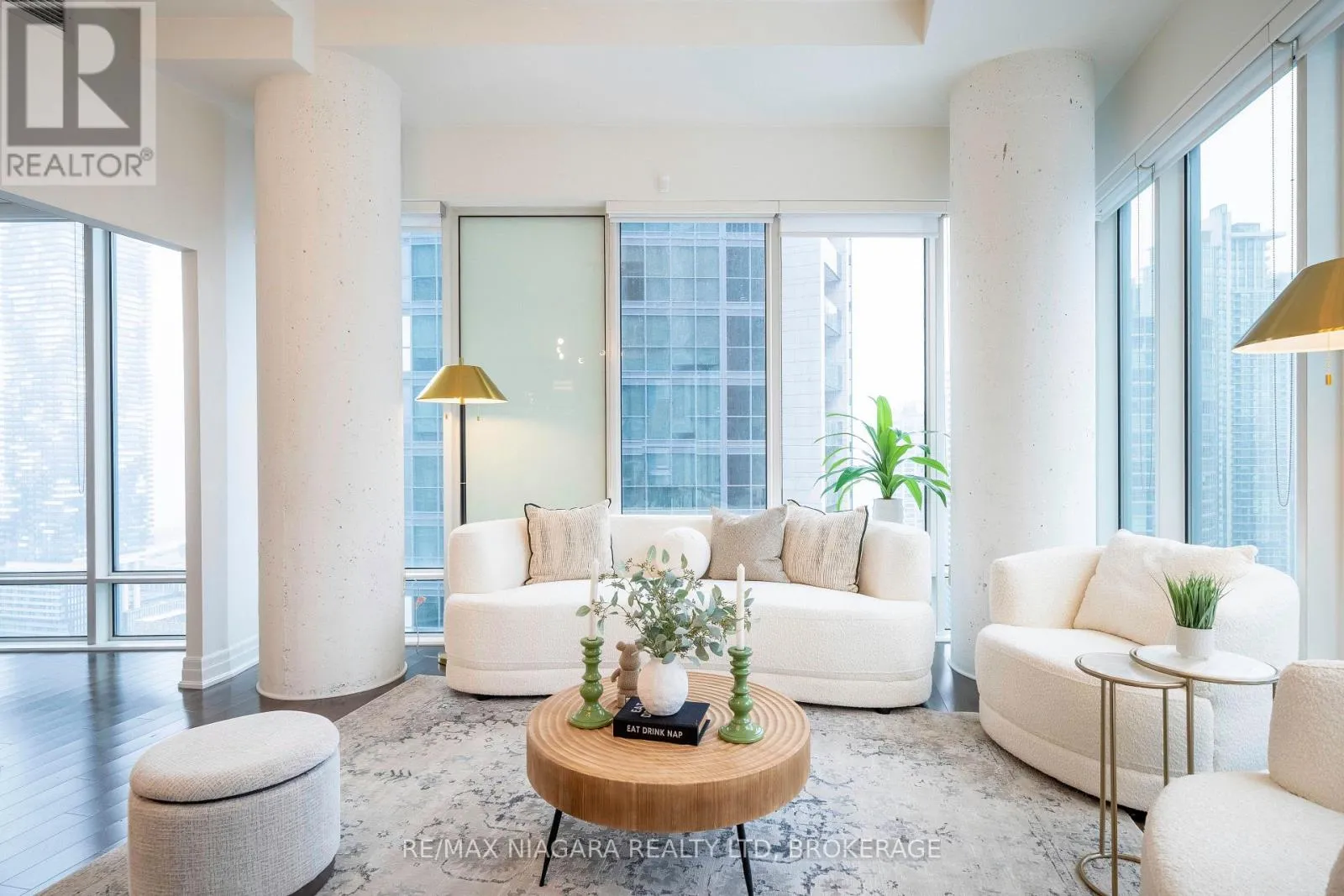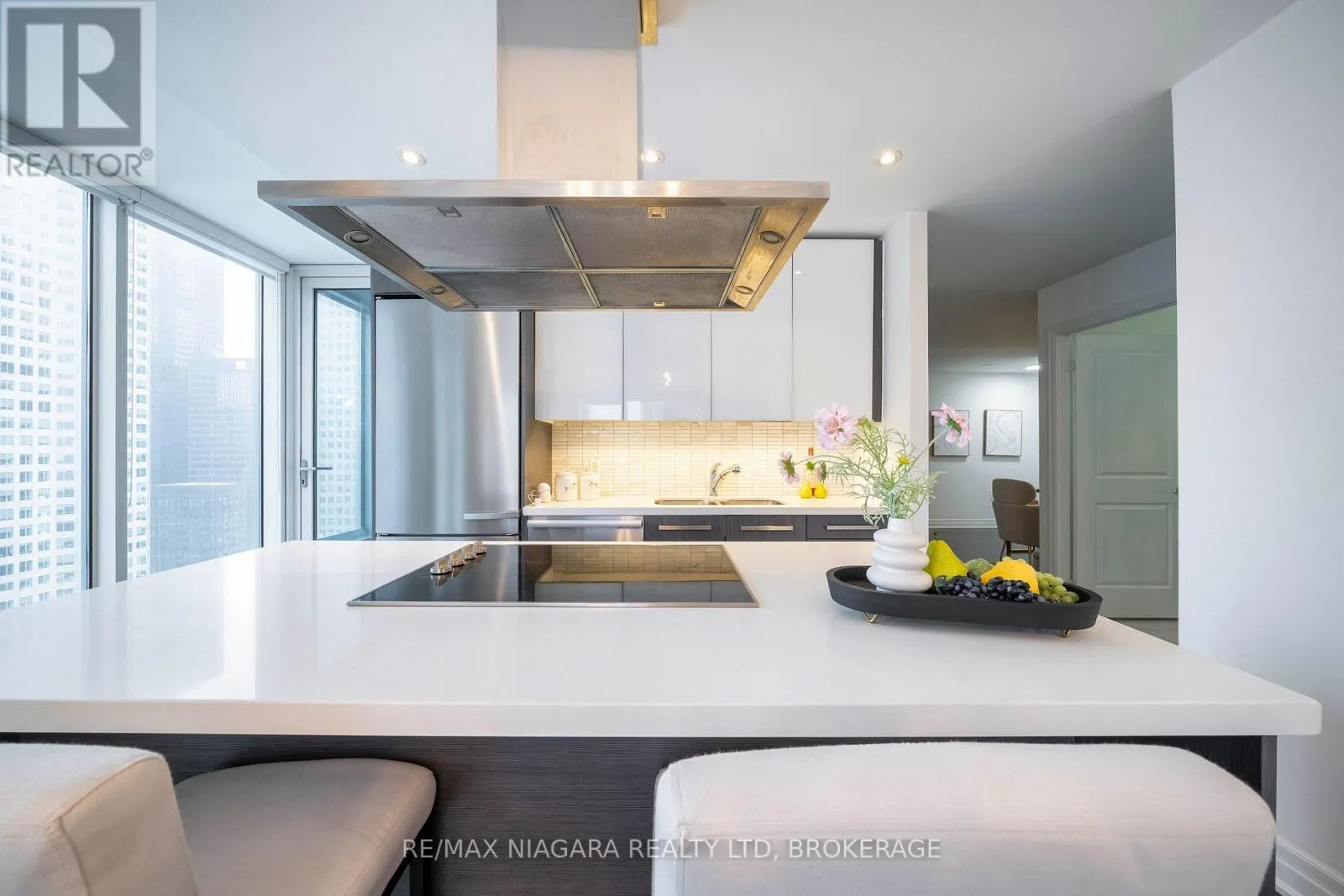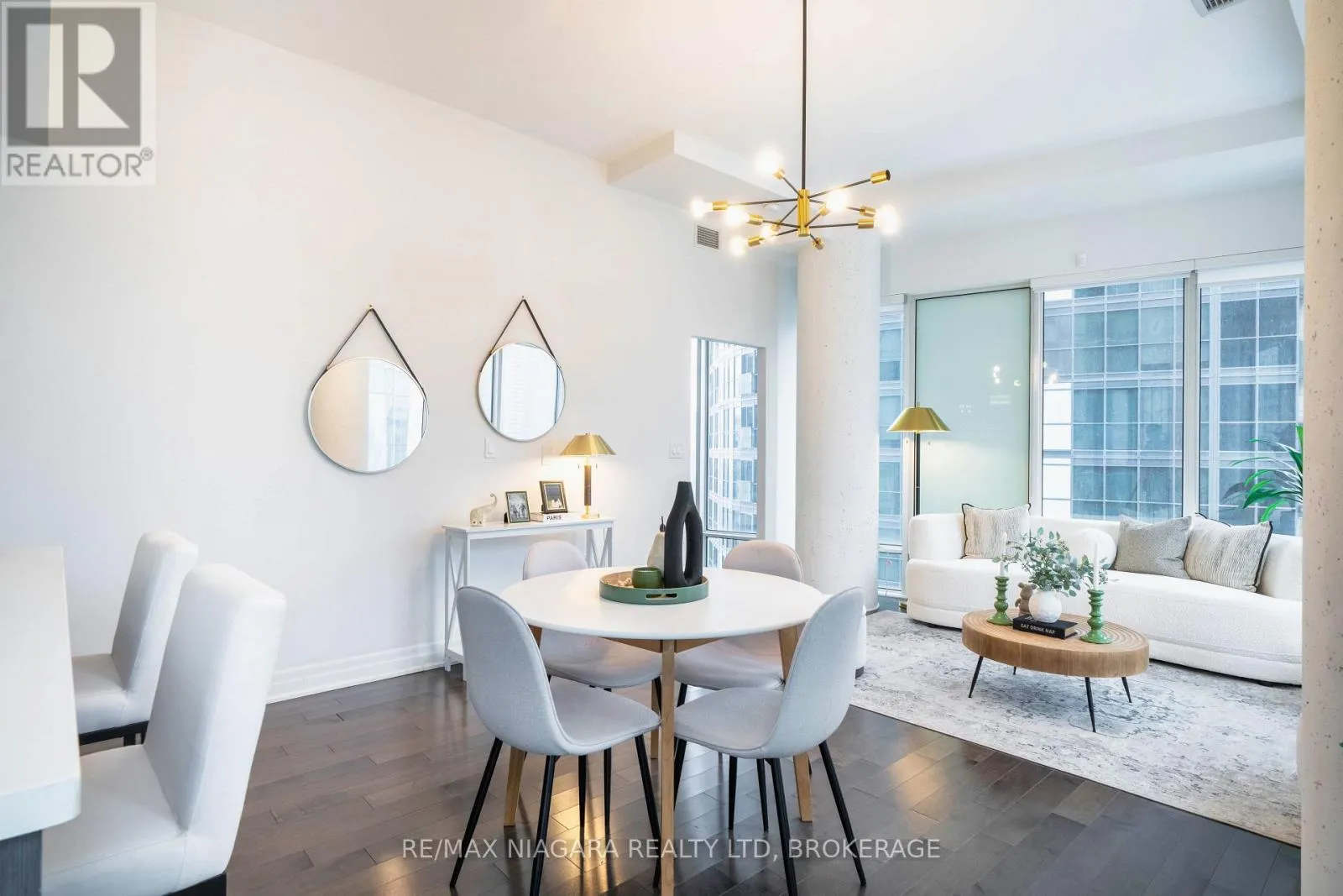 Yonge & Front Welcome to 8 The Esplanade, an iconic address offering refined urban living in the heart of downtown. This executive two-bedroom plus den residence provides over 1,000 square feet of thoughtfully designed interior living space, complemented by a private balcony. Soaring ceilings and expansive picture windows bathe the suite in natural light while framing impressive city views.Upon entry, the home reveals a bright, open-concept layout enhanced by floor-to-ceiling windows and premium finishes throughout. The residence features hardwood flooring, a contemporary kitchen equipped with high-end stainless steel appliances, an elegant backsplash, and a centre island ideal for casual dining or entertaining. Additional enhancements include custom closet organizers and recessed pot lighting.The well-appointed layout includes two generously sized bedrooms with ample storage, as well as a spacious den perfectly suited for a home office or professional workspace. Residents enjoy access to an exceptional collection of amenities, including 24-hour concierge service, an indoor pool, a fully equipped fitness centre, a party room, guest suites, and more.Surrounded by world-class dining, shopping, transit, and entertainment, this residence offers unparalleled convenience. Ideally situated steps from Union Station, the PATH, the Waterfront, St. Lawrence Market, and numerous downtown attractions, this is sophisticated city living at its finest. ***One indoor parking spot and one locker are included*** (id:27476)