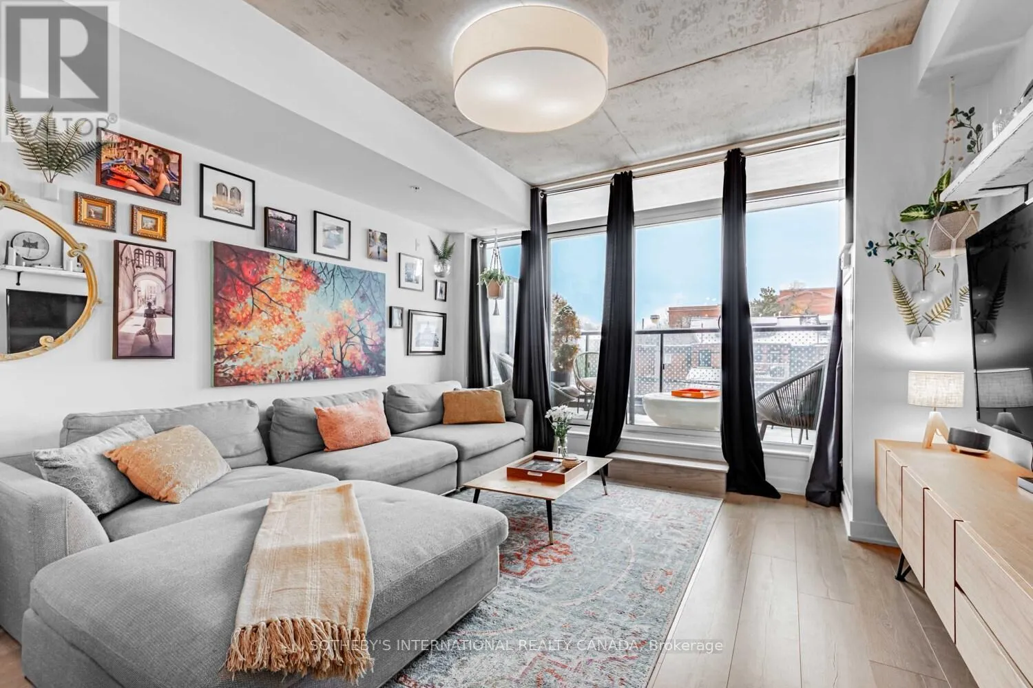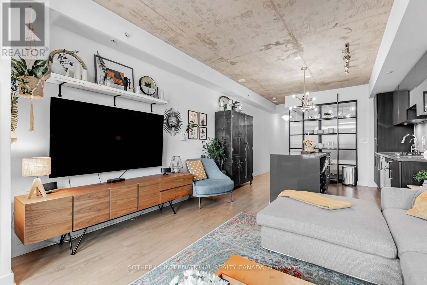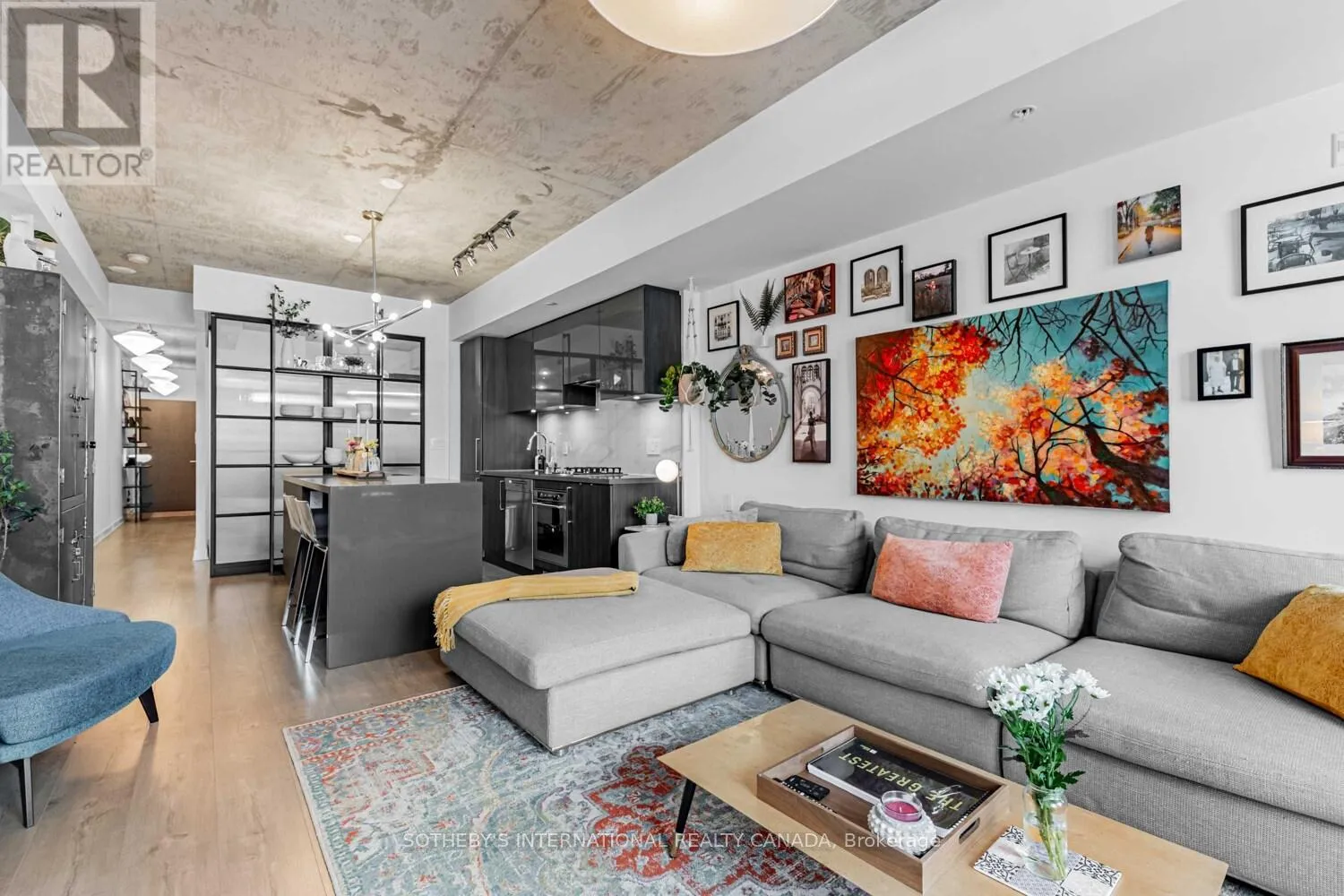 Cross Streets: Queen St W/Ossington Ave. ** Directions: Use GPS. Set within the renowned 109OZ, a sought-after boutique loft building built in 2018, this exceptional 1 Bedroom + Den residence is a rare offering in the heart of Ossington Village. With only 87 suites across six intimate levels, 109OZ is celebrated for its design-forward architecture, strong sense of community, and prime Trinity Bellwoods location near Queen Street West and Ossington Avenue.Offering approximately 710 sq.ft., this thoughtfully designed suite is bright, carpet-free, and filled with natural light. Upgraded flooring enhances the open-concept living and dining area, seamlessly connecting to a chef-inspired kitchen featuring stone countertops, built-in appliances, a breakfast bar, and a reverse osmosis water system. The versatile den, complete with custom built-in closet, is currently used as a bedroom and offers excellent flexibility for guests, a home office, or additional living space. The primary bedroom features custom closet built-ins and direct access to a spa-inspired four-piece bathroom.Step outside to the east-facing open balcony, where city views stretch toward the CN Tower, creating an ideal setting for morning coffee or evening relaxation. Improved beyond expectations, the suite is currently utilized as a high-end executive rental.Includes one owned underground parking space and a locker. The building allows EV charging, with four chargers available, and offers concierge service, visitor parking, BBQ-permitted outdoor areas, party and meeting rooms. With Ossington Avenue right outside your door, enjoy immediate access to Toronto's most celebrated restaurants, cafés, nightlife, and independent boutiques. Trinity Bellwoods Park, bike trails, and transit along Queen Street West are just minutes away. A residence that embodies style, comfort, and connection - bright, boutique, and distinctly Ossington. (id:27476)