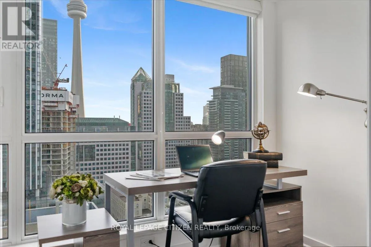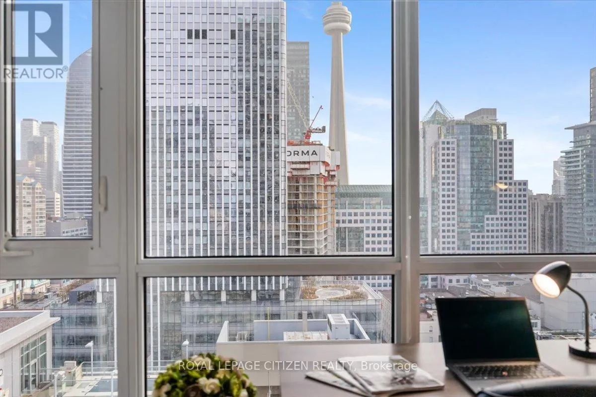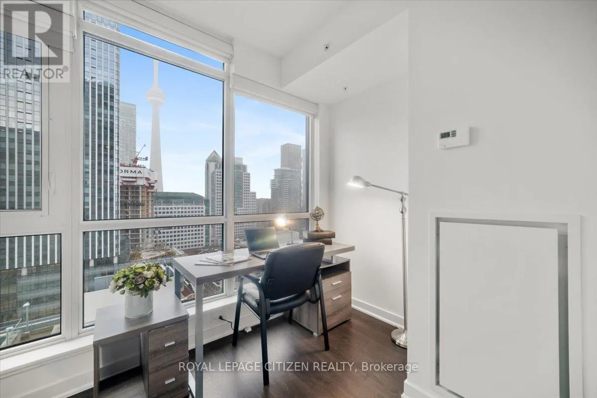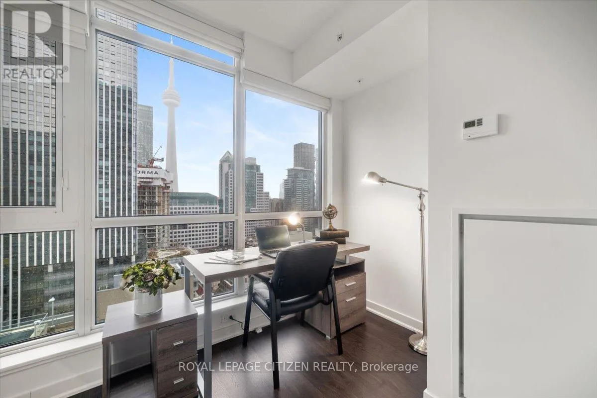 Richmond St W & University Ave Experience elevated urban living in this stunning 1 Bedroom + Den condo located in the heart of Downtown Toronto's Entertainment and Financial Districts. Just steps to Osgoode Subway Station, this prime location offers unbeatable access to shops, restaurants, universities, and everyday conveniences. This luxury unit features a bright, open-concept layout with laminate flooring throughout and a sleek, modern kitchen equipped with built-in appliances. This unit has a spacious bedroom with walk-in closet, while the versatile den boasts floor-to-ceiling windows and a south-facing the iconic CN Tower and stunning city views, making it perfect for a home office or guest space. Enjoy stunning sunrises and sets on your private balcony in the sky. Residents enjoy 24-hour concierge service and premium amenities including a fully equipped gym, recreation lounge, billiards room, guest suites and sauna. Ideal for professionals, investors, or decerning consumers seeking style, comfort, and a vibrant downtown lifestyle, all in one exceptional home. Professionally painted and cleaned. Just move in and make it your own!!! (id:27476)