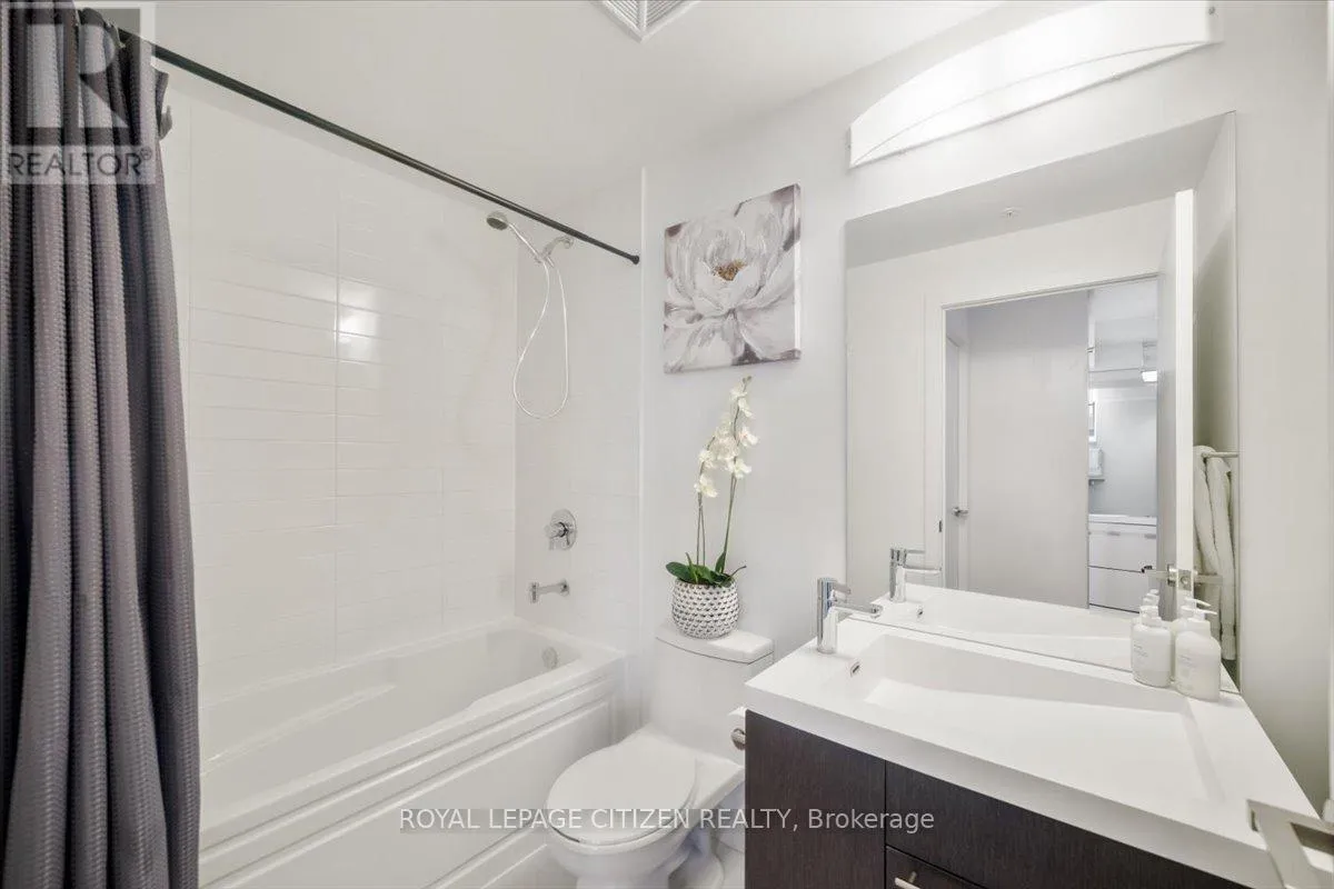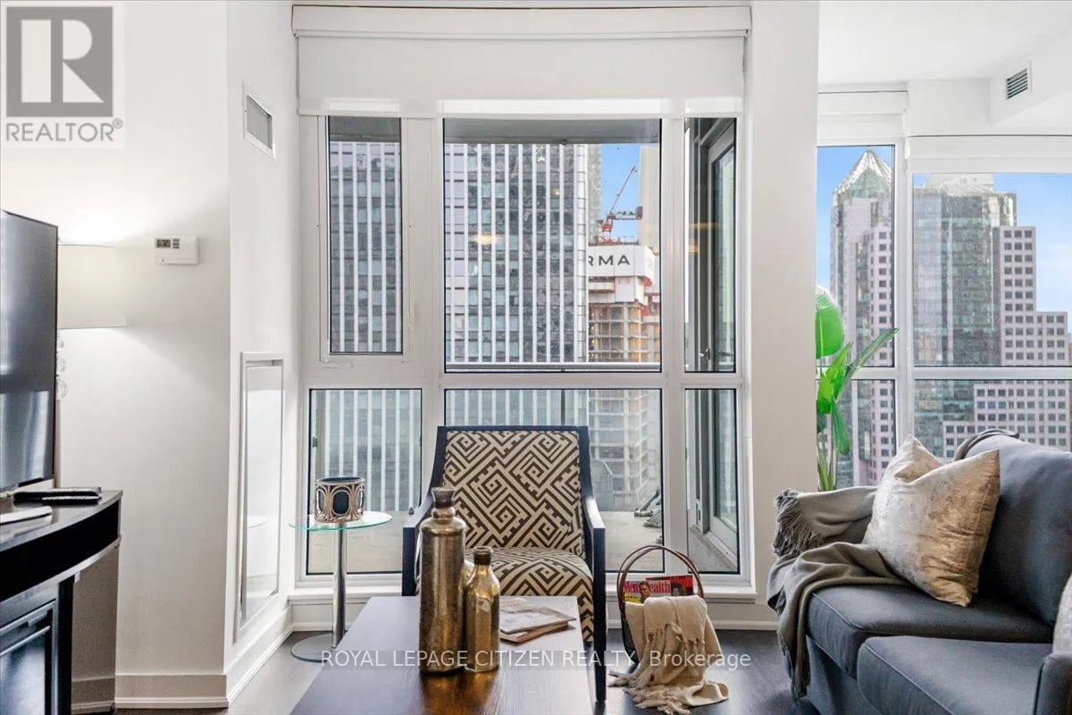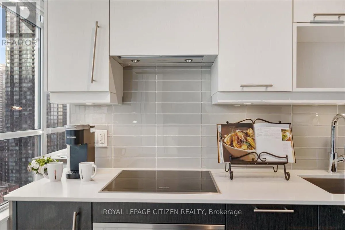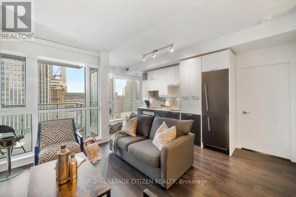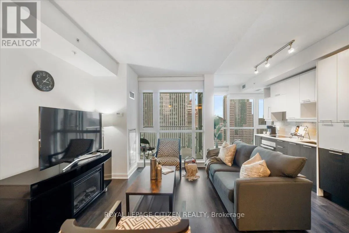 Richmond St W & University Ave Experience elevated urban living in this stunning 1 Bedroom + Den condo located in the heart of Downtown Toronto's Entertainment and Financial Districts. Just steps to Osgoode Subway Station, this prime location offers unbeatable access to shops, restaurants, universities, and everyday conveniences. This luxury unit features a bright, open-concept layout with laminate flooring throughout and a sleek, modern kitchen equipped with built-in appliances. This unit has a spacious bedroom with walk-in closet, while the versatile den boasts floor-to-ceiling windows and a south-facing the iconic CN Tower and stunning city views, making it perfect for a home office or guest space. Enjoy stunning sunrises and sets on your private balcony in the sky. Residents enjoy 24-hour concierge service and premium amenities including a fully equipped gym, recreation lounge, billiards room, guest suites and sauna. Ideal for professionals, investors, or decerning consumers seeking style, comfort, and a vibrant downtown lifestyle, all in one exceptional home. Professionally painted and cleaned. Just move in and make it your own!!! (id:27476)