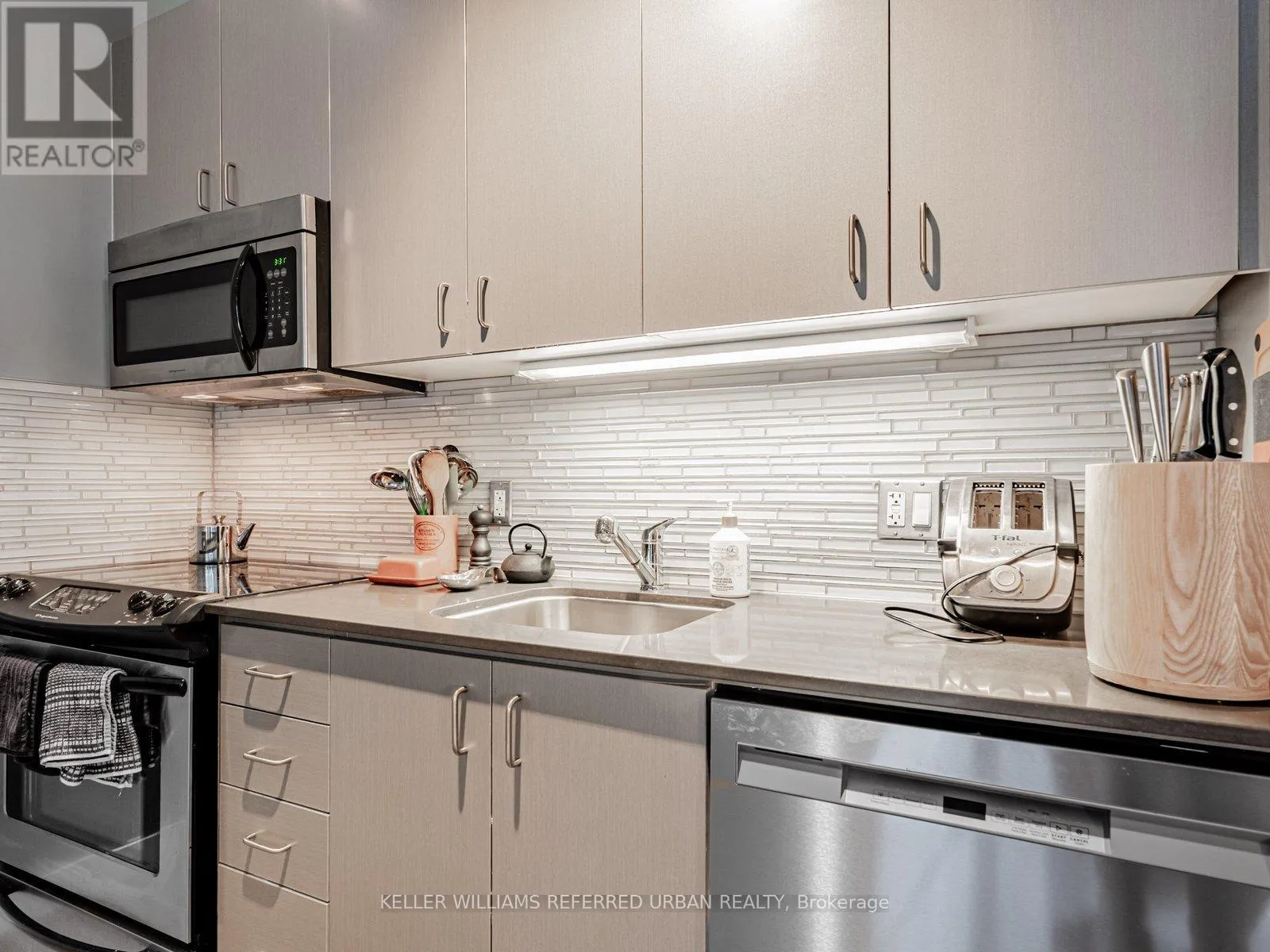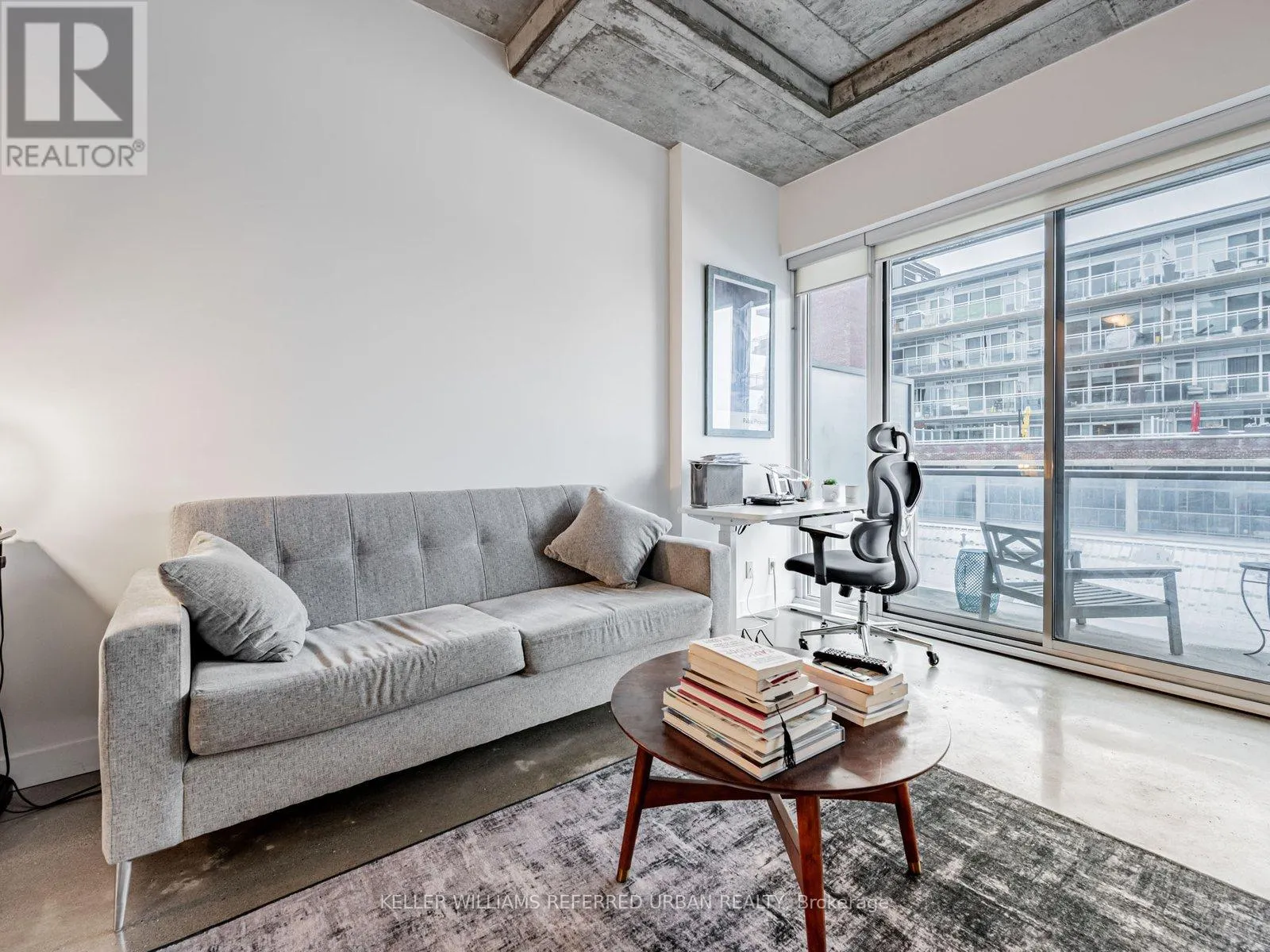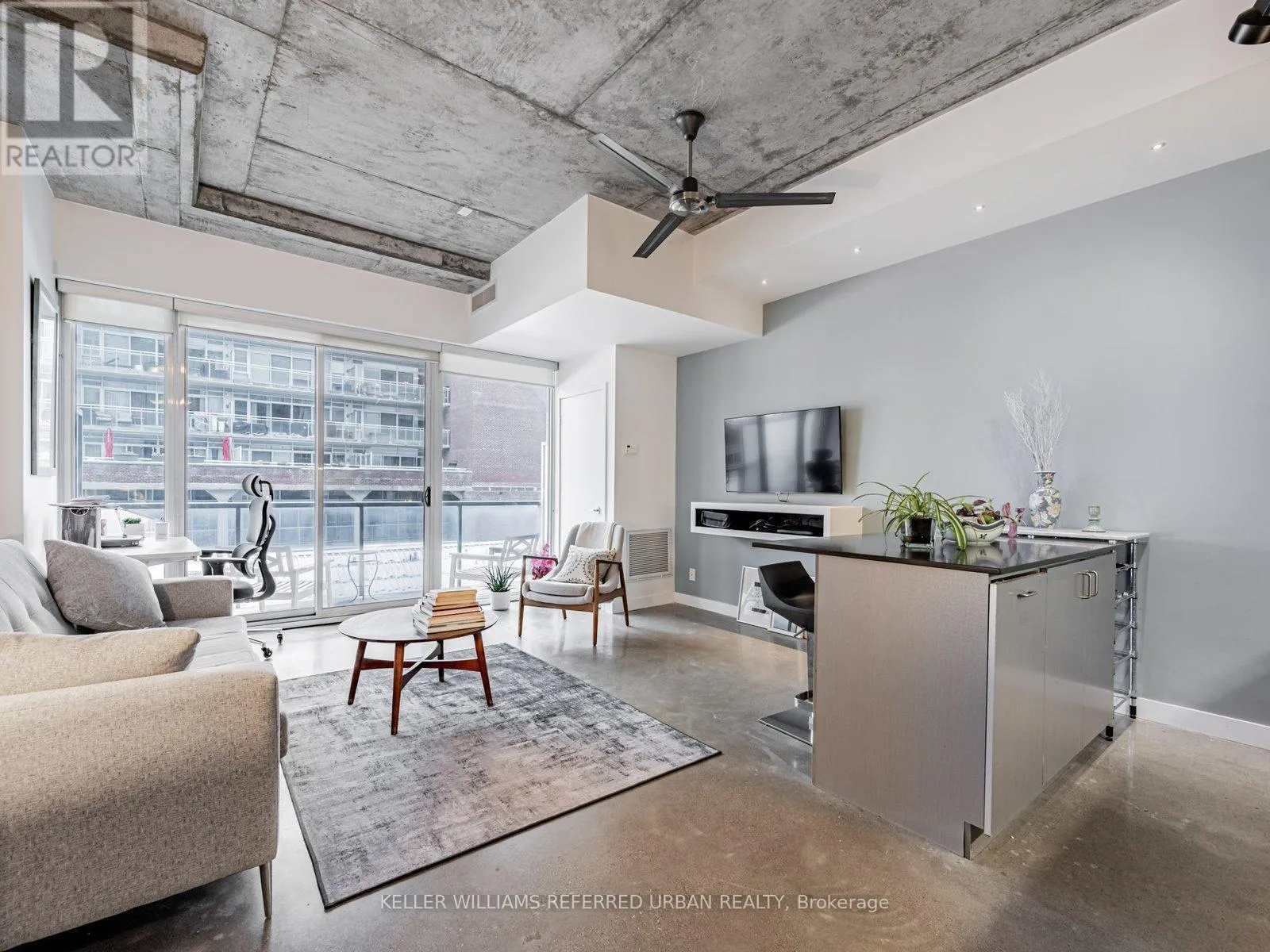 Cross Streets: Queen & Carlaw. ** Directions: GPS to 201 Carlaw. Welcome to Unit 502 at the iconic Printing Factory Lofts, a sought-after address known for its architectural character, and elevated urban lifestyle. This beautifully appointed residence blends historic loft inspiration with modern refinement. Walk in and you will instantly notice how spacious the living area feels; supported by an open-concept layout, and floor-to-ceiling windows. The kitchen is both functional and sophisticated, featuring integrated appliances, and premium finishes - perfectly suited for hosting, creating, or unwinding after a busy day at the office. Open the door to a private and spacious bedroom which provides a calm retreat, while the spa-inspired bathroom reflects thoughtful design and quality craftsmanship. A large private balcony extends the living space outdoors, ideal for morning coffee or evening downtime. Set just east of downtown, this location strikes the ideal balance between accessibility and atmosphere. Enjoy seamless access to the core while living slightly removed, immersed in the authentic character of Riverdale and Leslieville right at your doorstep. Queen Street East is just a block away; surrounded by acclaimed restaurants, cafés, galleries, and transit. This is a prime destination for executives, creatives, and professionals seeking a safe, welcoming, and exceptionally well-managed building with true neighborhood appeal. (id:27476)