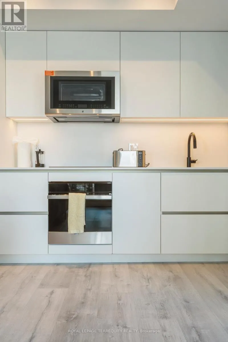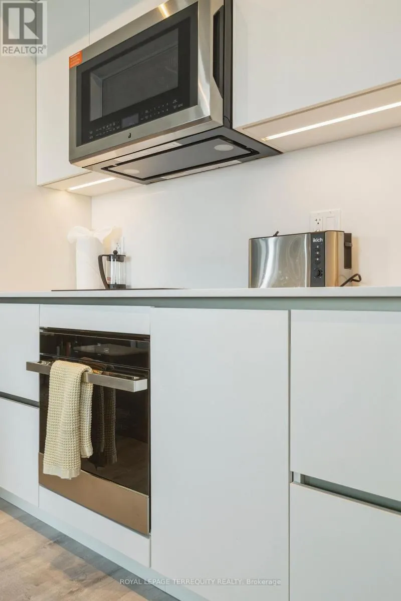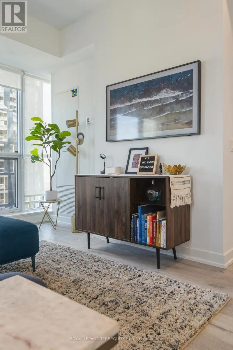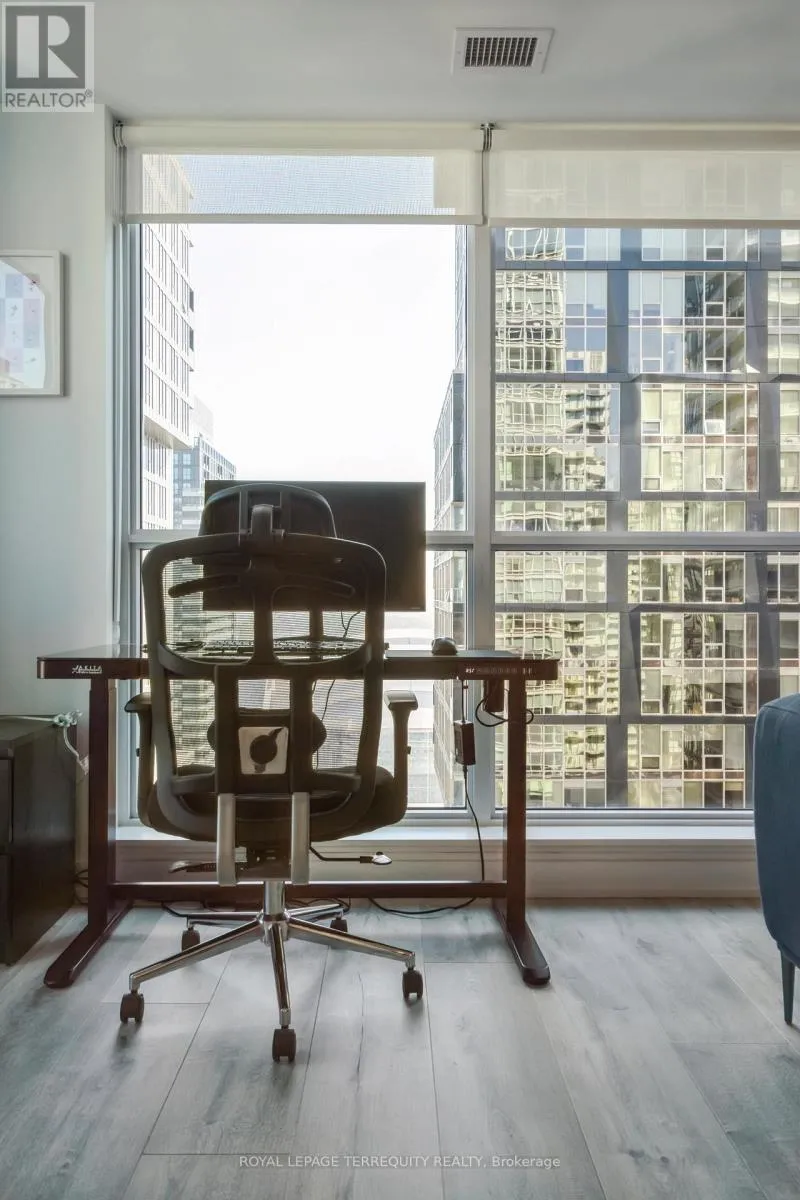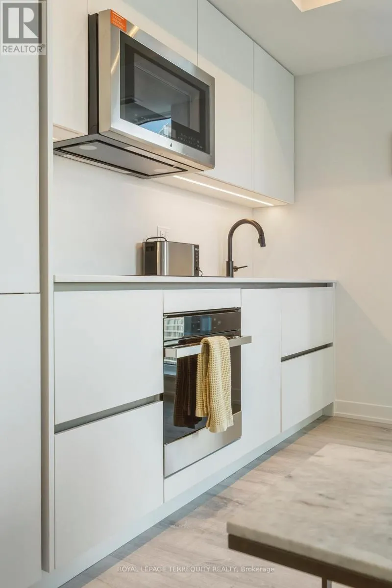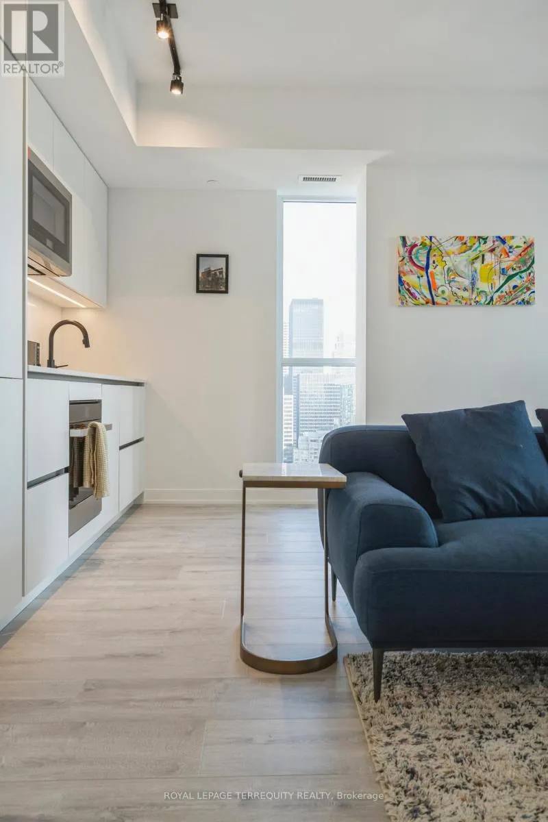 King St West / Blue Jays Way Empire Maverick Model | 1 Bedroom | 35th Floor | South & East Exposure Sophisticated and Bright 1-bedroom residence perched on the 35th floor. Featuring south and east exposure with good views. The suite offers soft, yet elevated city views with decent views of the Rogers Centre and Lake Ontario, complemented by excellent natural light through large windows on this corner unit. The interior showcases a refined open-concept design with a sleek modern kitchen with hidden drawers and good storage, plus stone counter and backsplash, undercabinet lighting and undermount sink, integrated appliances (built in oven, counter top stove, paneled fridge & dishwasher), contemporary finishes, a well-proportioned bedroom with large mirrored closet, ensuite laundry and large closet. Thoughtfully designed for urban living. This just-over-a-year-old building offers premium amenities including 24-hour concierge, an elegant rooftop social lounge and bar, outdoor kitchen, BBQs, excellent gym and exercise areas, yoga studio, and stylish co-working spaces plus boardroom. Set in the cultural heart of King Street West, steps to Mirvish Theatres, Roy Thomson Hall, acclaimed dining, and directly across from the TIFF building. An exceptional address for those who value lifestyle, convenience, and understated luxury. Showings by appointment. Can be rented fully furnished also, contact for details today. (id:27476)