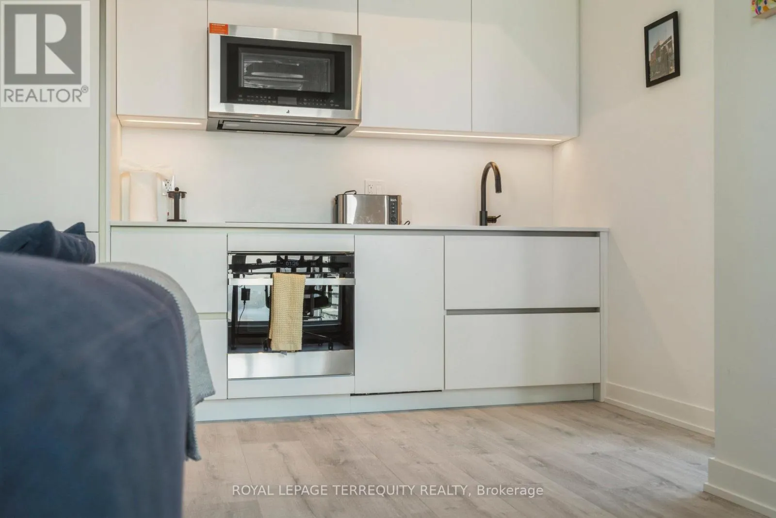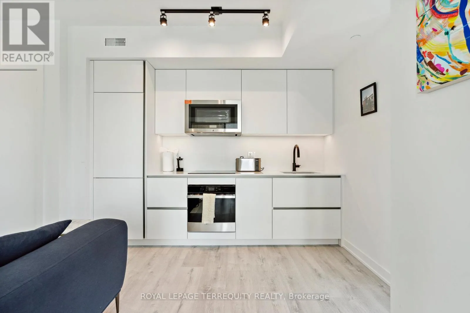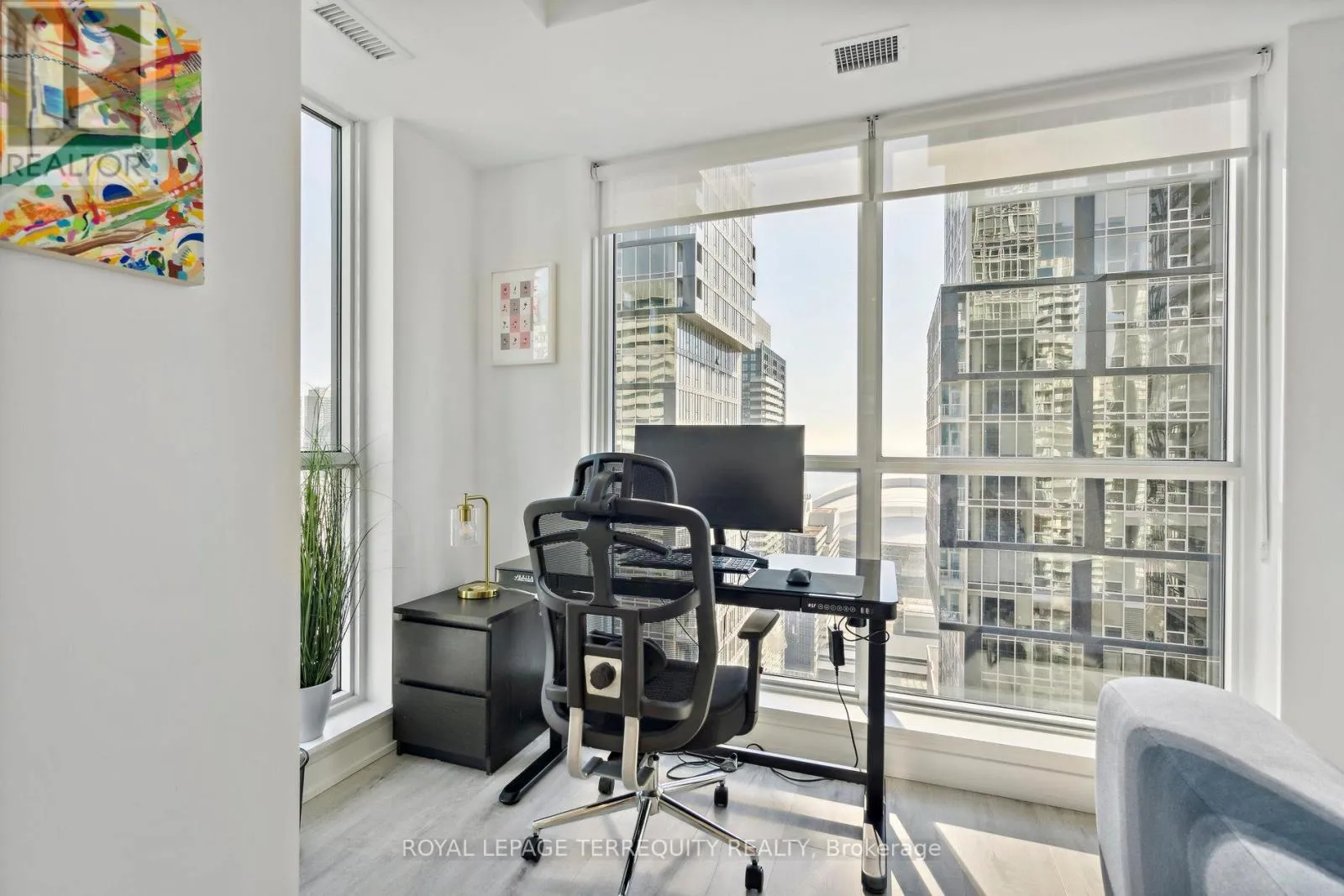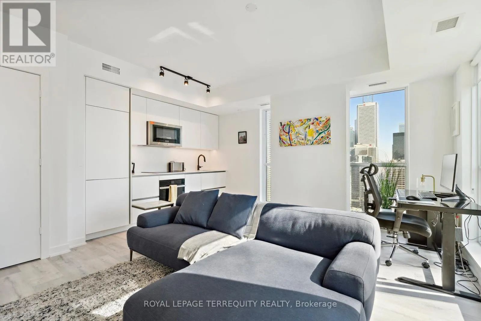 King St West / Blue Jays Way Empire Maverick Model | 1 Bedroom | 35th Floor | South & East Exposure Sophisticated and Bright 1-bedroom residence perched on the 35th floor. Featuring south and east exposure with good views. The suite offers soft, yet elevated city views with decent views of the Rogers Centre and Lake Ontario, complemented by excellent natural light through large windows on this corner unit. The interior showcases a refined open-concept design with a sleek modern kitchen with hidden drawers and good storage, plus stone counter and backsplash, undercabinet lighting and undermount sink, integrated appliances (built in oven, counter top stove, paneled fridge & dishwasher), contemporary finishes, a well-proportioned bedroom with large mirrored closet, ensuite laundry and large closet. Thoughtfully designed for urban living. This just-over-a-year-old building offers premium amenities including 24-hour concierge, an elegant rooftop social lounge and bar, outdoor kitchen, BBQs, excellent gym and exercise areas, yoga studio, and stylish co-working spaces plus boardroom. Set in the cultural heart of King Street West, steps to Mirvish Theatres, Roy Thomson Hall, acclaimed dining, and directly across from the TIFF building. An exceptional address for those who value lifestyle, convenience, and understated luxury. Showings by appointment. Can be rented fully furnished also, contact for details today. (id:27476)