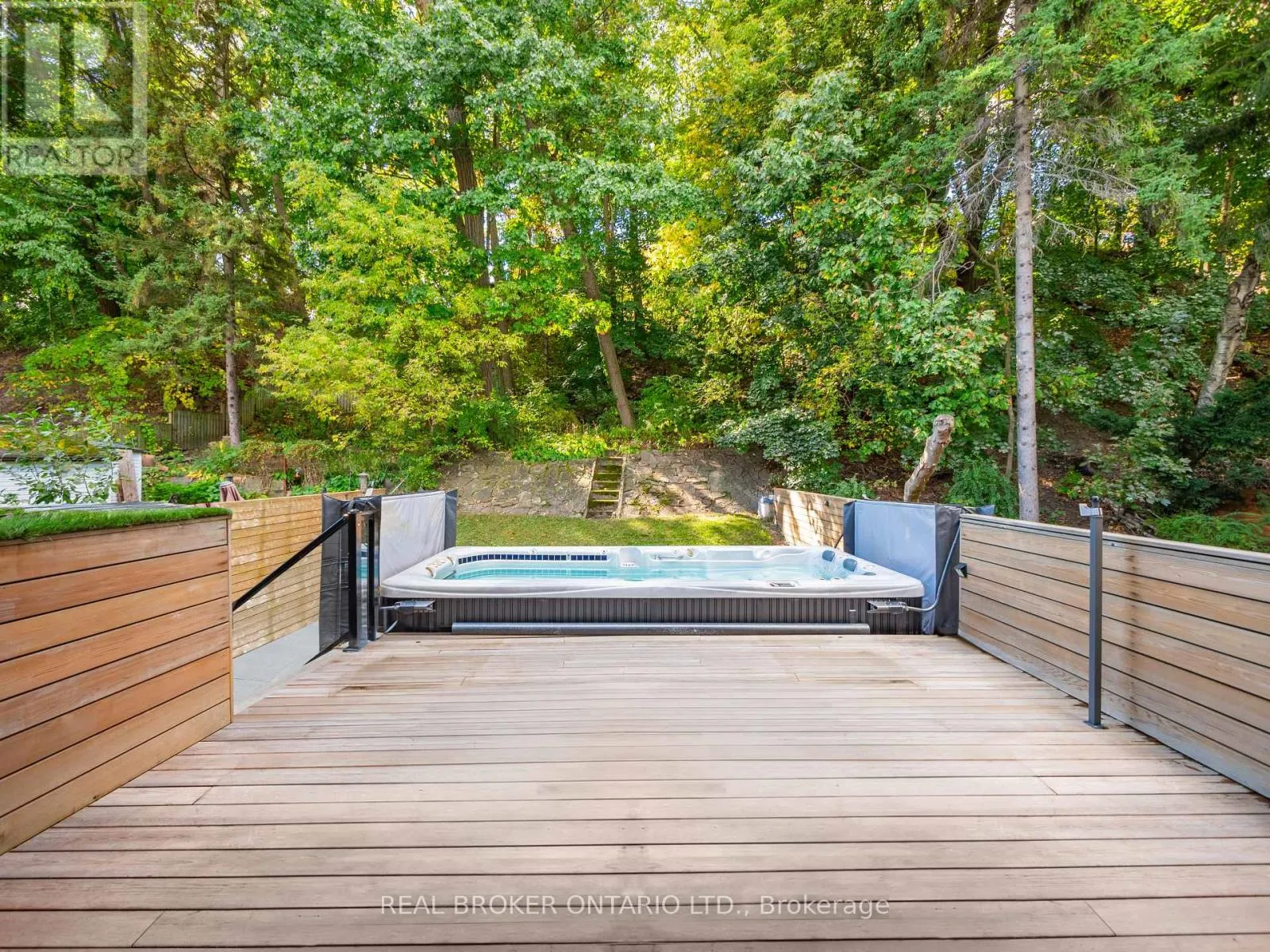 Bloor/South Kingsway Step into a sanctuary of modern luxury and impeccable design! This exquisite 4000+ sq ft contemporary masterpiece, crafted by David Peterson Architect Inc., offers a unique blend of functionality and elegance. Featuring 3+1 bedrooms, 4 baths, and a lush garden atrium, this home is a serene retreat in a private woodland setting with breathtaking seasonal views. Located just minutes from downtown, the airport, and Bloor West Village, this rare offering boasts top-of-the-line finishes, including natural maple and Statuario accents throughout. Enjoy the convenience of Samsung and Bosch appliances, a custom sauna, a swim spa, an EV charger, and a separate suite perfect for in-laws or nannies. This freshly painted home truly offers a luxurious retreat for all members of the family! Photos shown are home partly furnished and virtually staged. (id:27476)