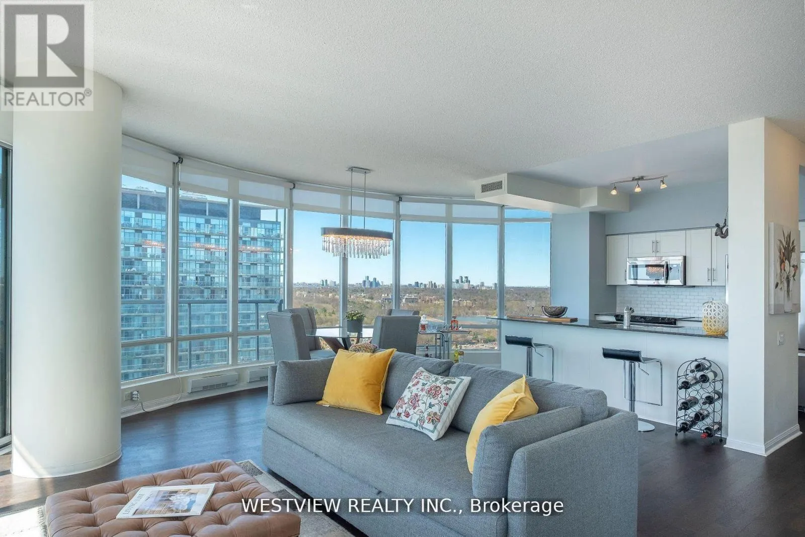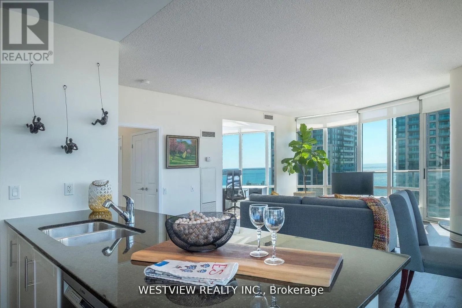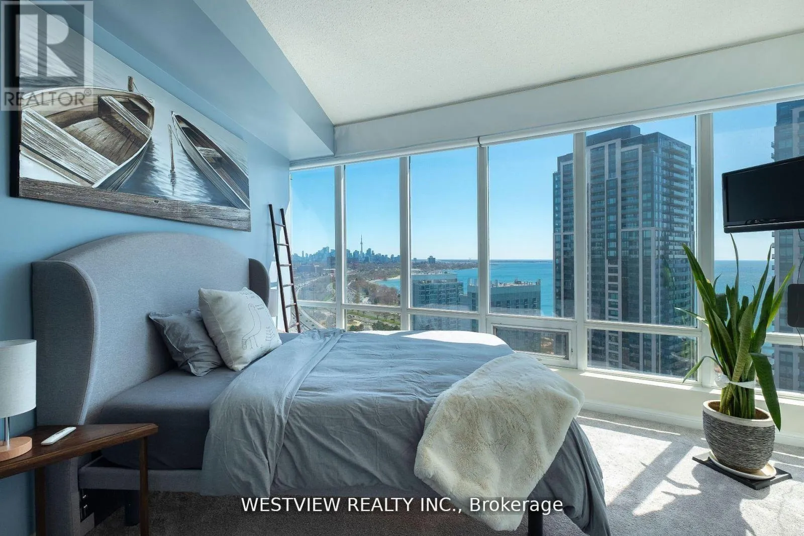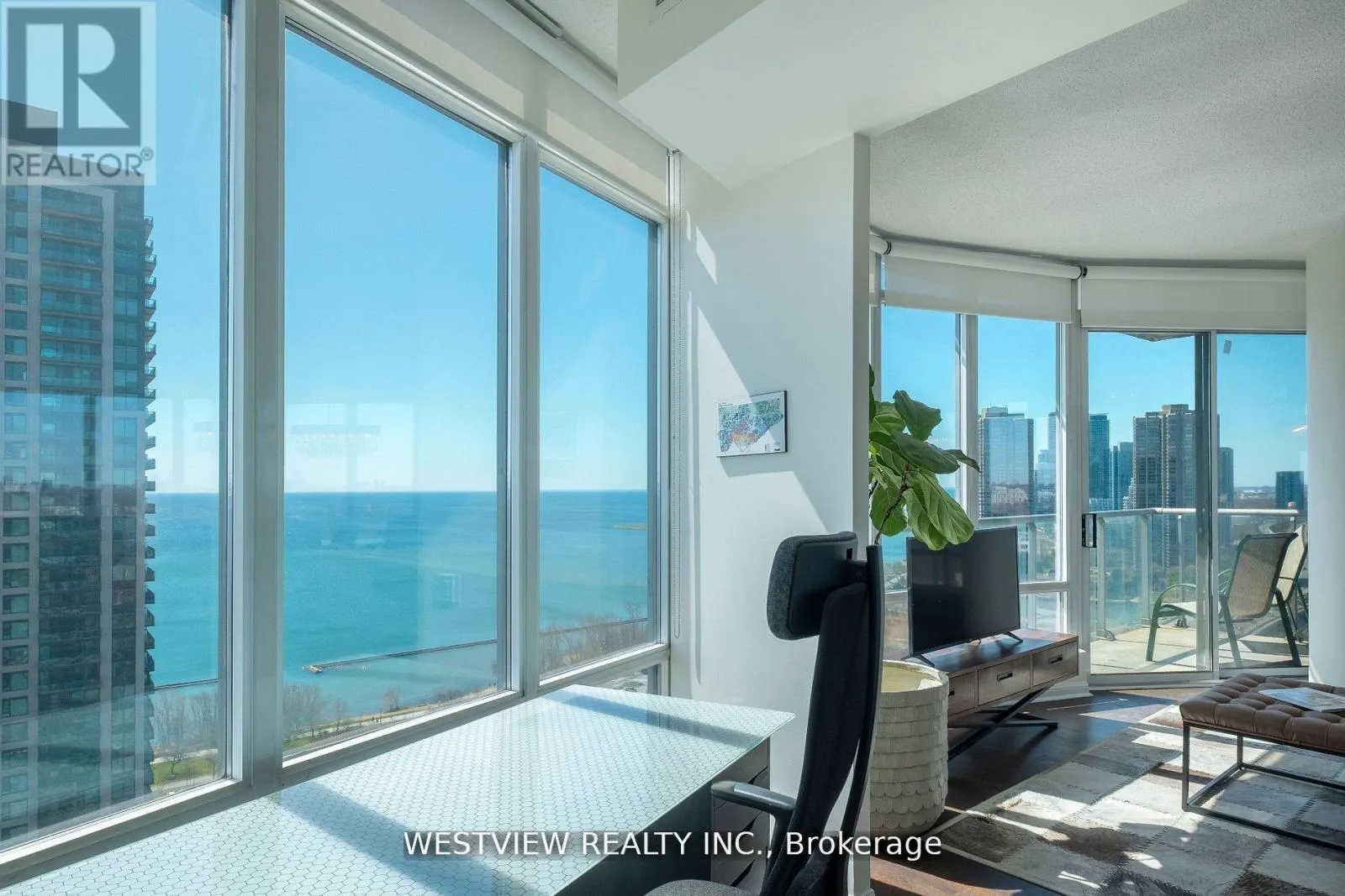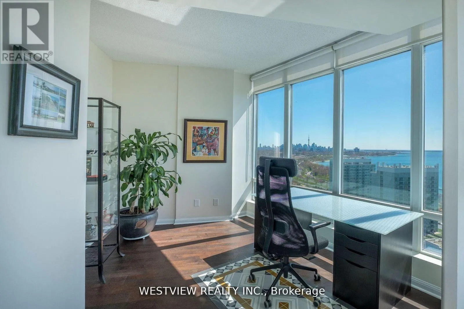 Lake Shore/ Windermere Good morning, Good afternoon & Good evening! That is what you can expect from this sun drenched two bedroom plus den waterfront gem, two floors from the top. Spanning over 1100 sqft of luxurious living space, offering very rare 270 degrees of stunning panoramic views. From the picturesque downtown skyline extending to Humber Bay, Grenadier pond and beyond. Enjoy both the colourful sunrises & sunsets along with watching planes come and go from both airports at a distance. All of which can be managed with your custom automated blinds. This is a Beautifully appointed condo, with post card views from all principal rooms. The modern kitchen features a large breakfast bar that overlooks the spacious living area & bright blue water of the lake. The bright den (potential office space) fit for any executive, features wrap around windows overlooking the Toronto downtown city-skyline as well as the lake to the west. Living in "Windermere By The Lake" you will be within steps to the miles of waterfront walking/ biking paths, High Park, Roncesvalles, Bloor West village, shopping, public transit & many more amenities. New Electric vehicle charging station has also been installed for your parking spot, for your convenience, storage locker on 2nd floor. You will look forward to coming home here! (id:27476)