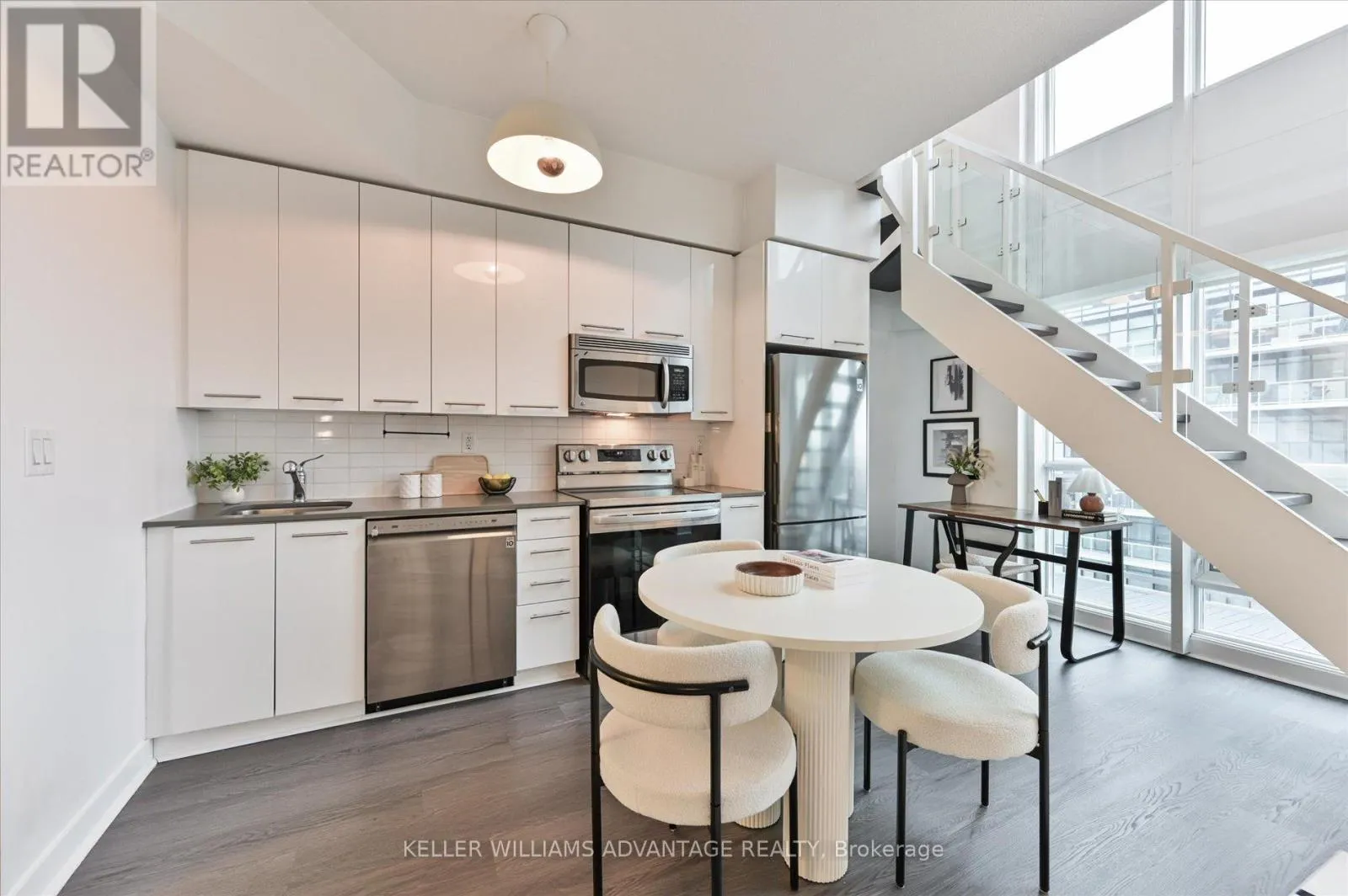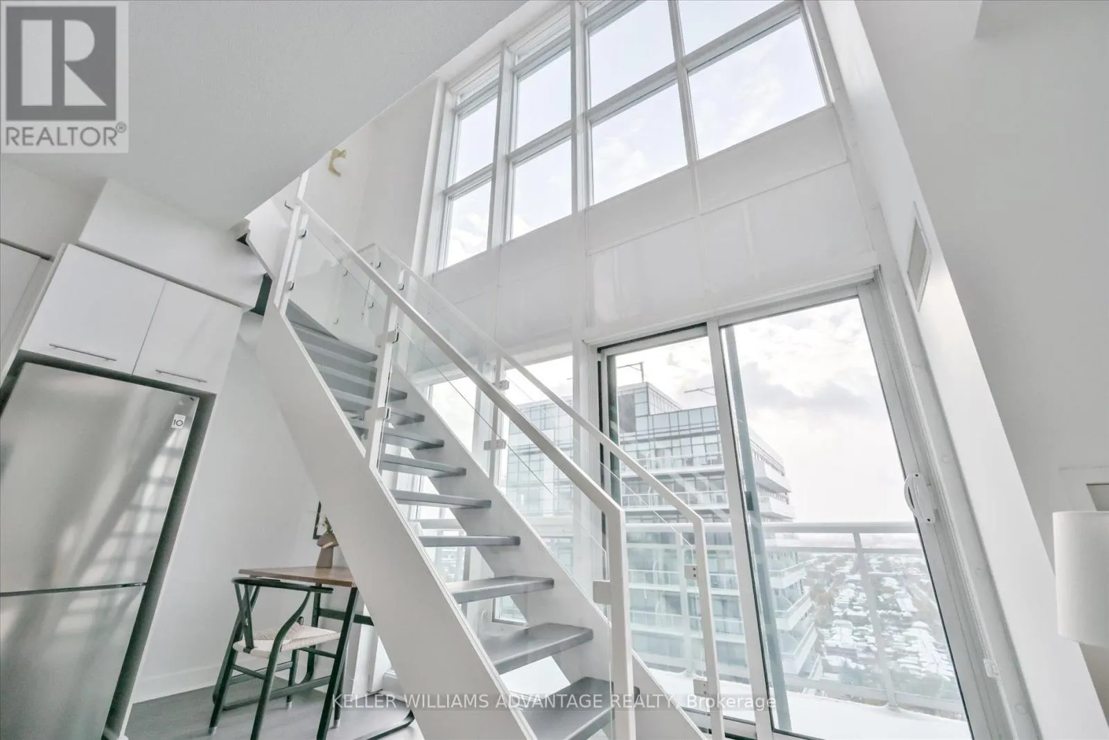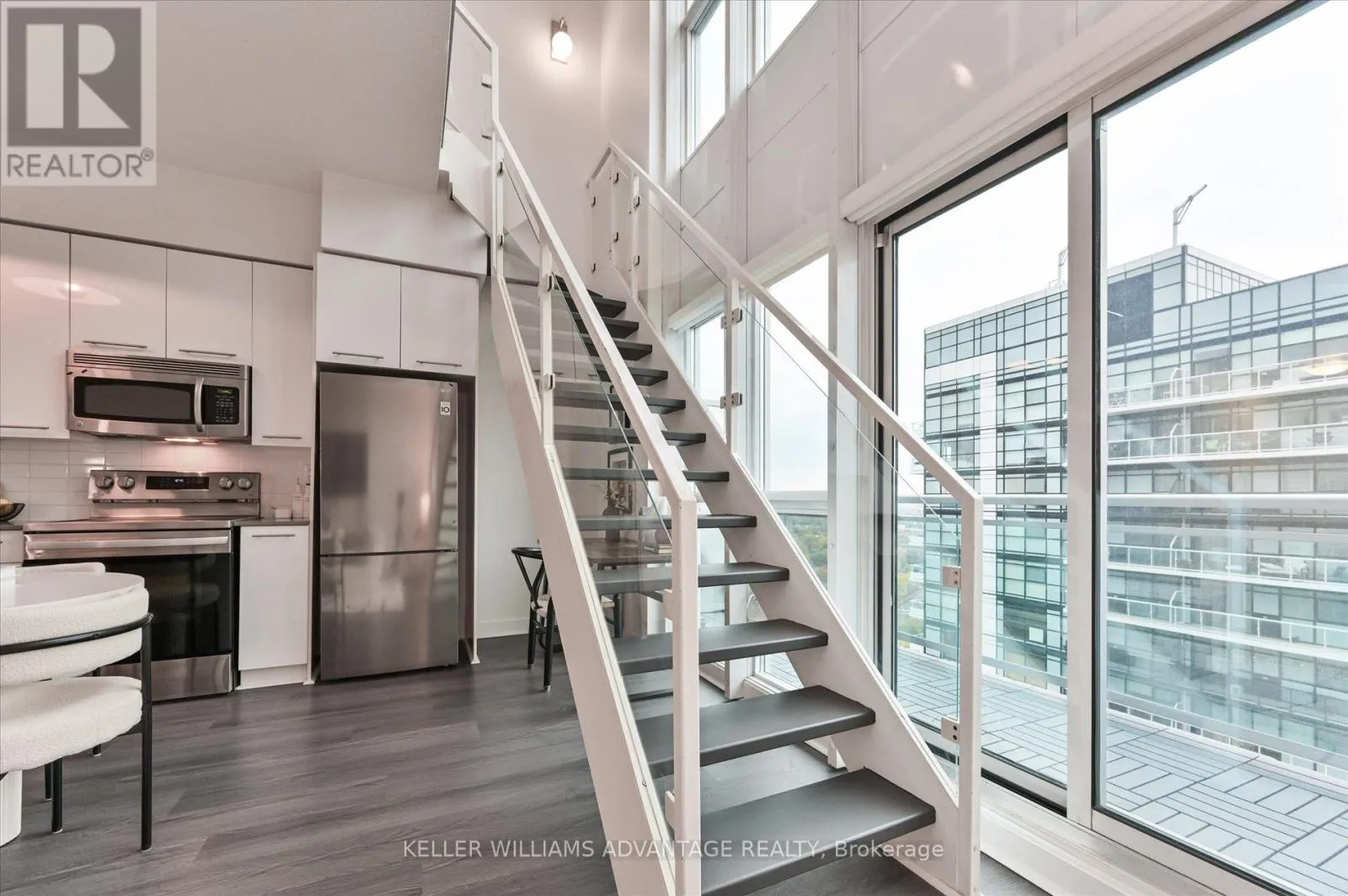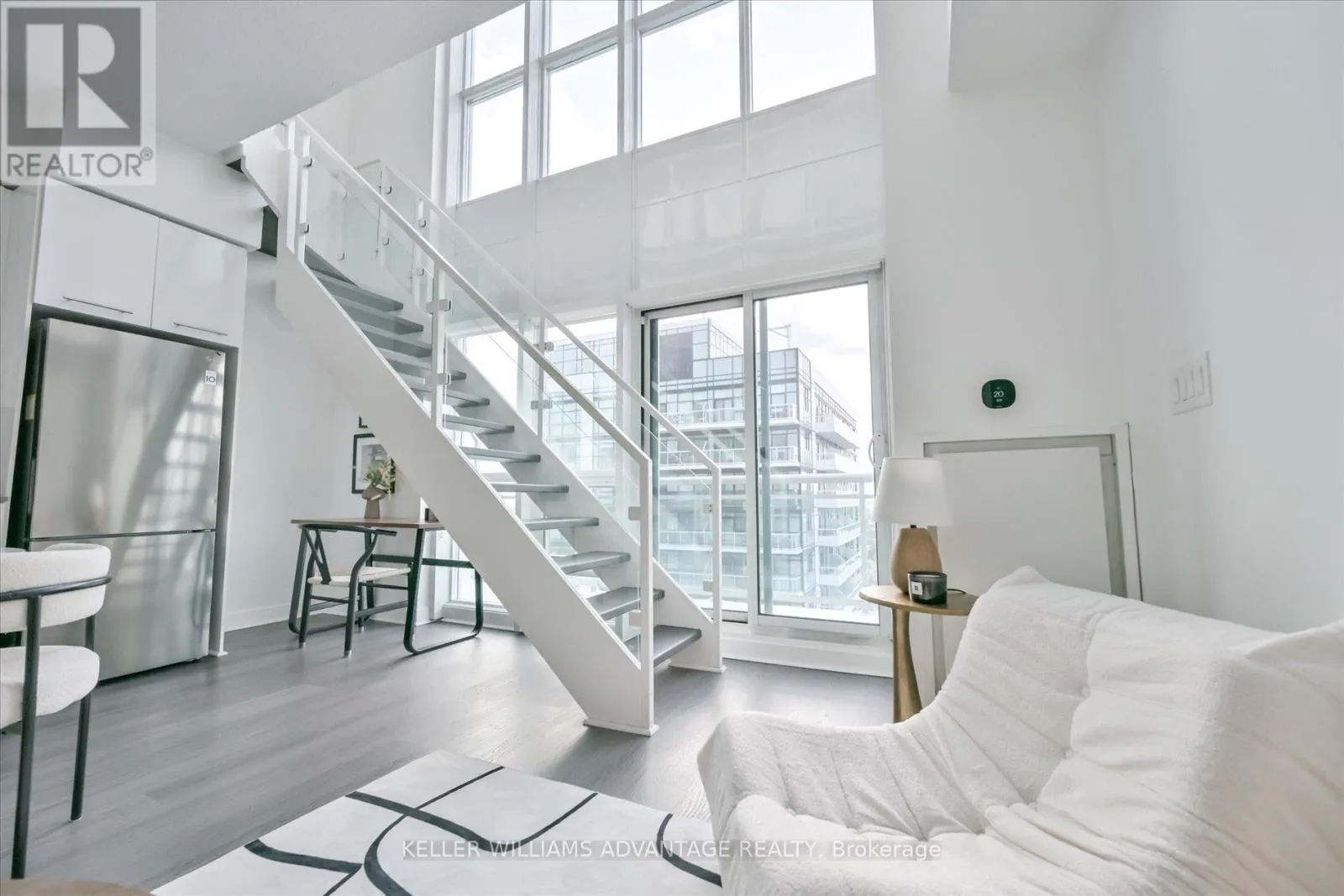 Cross Streets: Lakeshore/Parklawn. ** Directions: Ask Siri. *See Broker Remarks. Experience elevated urban living in this sun-filled, west-facing Penthouse showcasing sweeping views through soaring 17ft floor-to-ceiling windows. This impressive two-storey loft spans 720 sq. ft. of well-planned, open-concept space designed for both comfort and style. The main level features a spacious living and dining area, an open modern kitchen with premium built-in stainless steel appliances, a convenient two-piece powder room, and a private balcony that spans the width of the unit and offers expansive city and lake vistas. A clever under-stair nook provides flexible use as a home office, storage, or pantry. Upstairs, the serene primary suite serves as a private retreat with convenient his-and-hers closets and built-in organizers, plus a spa-inspired ensuite complete with a soaker tub and separate shower. The layout is ideally suited for a single professional or couple seeking generous living space and a flexible work-from-home environment. Enjoy an exceptional selection of resort-style amenities, including 24-hour concierge, a fully equipped fitness centre, party room, outdoor pool, rooftop deck with BBQs, games and media rooms, sauna, squash courts, bike storage, and guest suites. Located in the heart of Mimico, this prime address offers unbeatable convenience-minutes to the Gardiner Expressway, Mimico GO Station, waterfront trails, shops, groceries, public transit, and more. One parking space is included. A virtual tour is attached for your viewing. (id:27476)