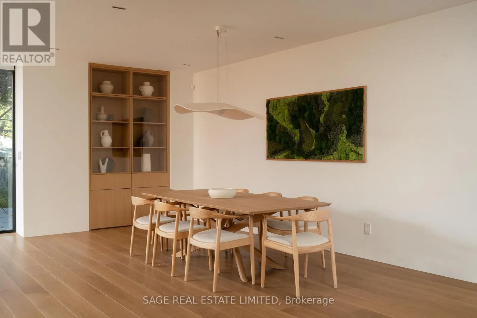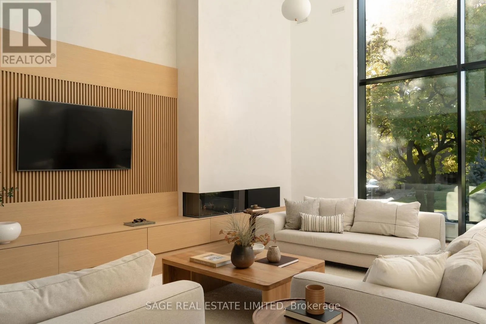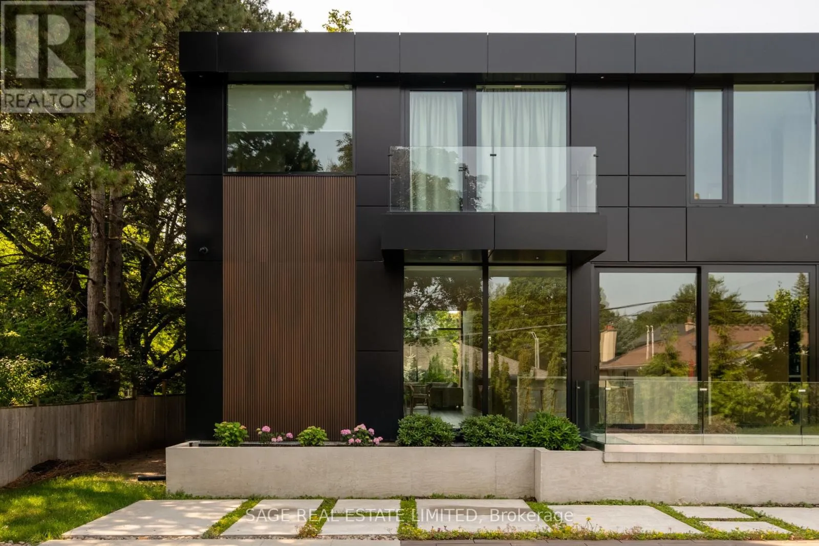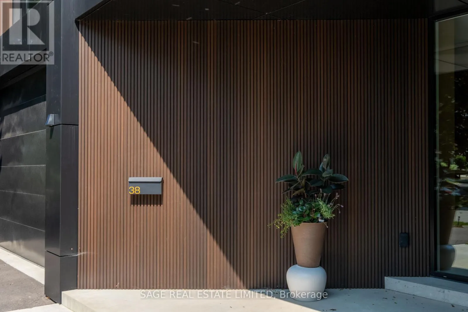 Princess Margaret & Islington UNDESERVINGLY OVERLOOKED - A gentle fusion of Scandinavian and Japanese design, The Emperor sits proudly in Toronto's charming Princess Anne Manor neighbourhood. This detached custom build is an architectural wonder of the west end with smooth finishes, oak floors and panelling, plunging sight lines and cascading sunlight. Hidden doors reveal themselves at your fingertips to unassuming ensuite bathrooms dressed in creams and stone or covert closets with abundant storage - its invisible lines maintain minimalism at the forefront of its demure design. Dramatic floor-to-ceiling windows rise 21 feet high in the main living, wide open to a generously sized dining room and bright kitchen with an exceptional breakfast island and concealed coffee nook. Fluting and custom millwork anchors the front entrance and frames the tv, complimenting the microcement finished gas fireplace. A constellation of soft lights quietly illuminates the home, a spectacle when the sun goes down, while its tobacco coloured facade stretches across the 76 foot wide lot and leads to an inground saltwater pool at the rear. Beneath century old canopy trees, around slow swooping roads, this one-of-a-kind modern build is two minutes from St George's Golf & Country Club & only ten minutes to Pearson Airport. Over 5000 total square feet, your choice of two primary bedrooms and multiple flex spaces on the top floor with the option to convert them to extra bedrooms - executives, creatives, gamers, podcasters, families and fitness enthusiasts will find limitless potential and a whole new meaning to going home at 38 Ravensbourne. (id:27476)