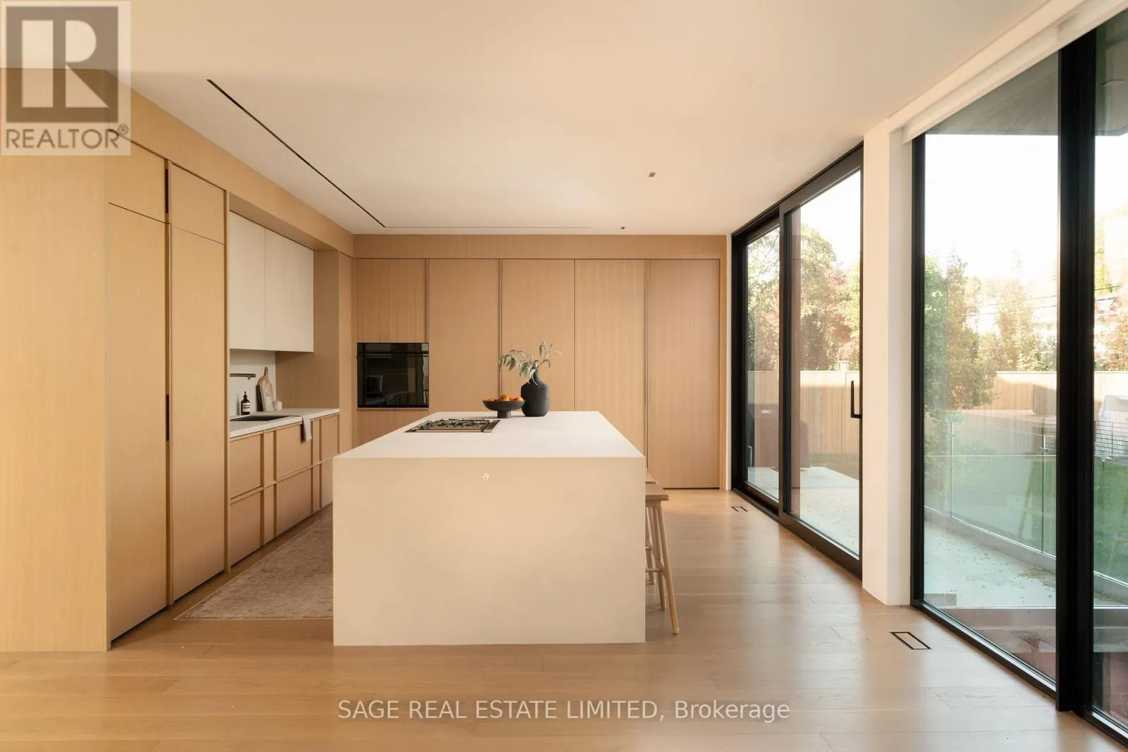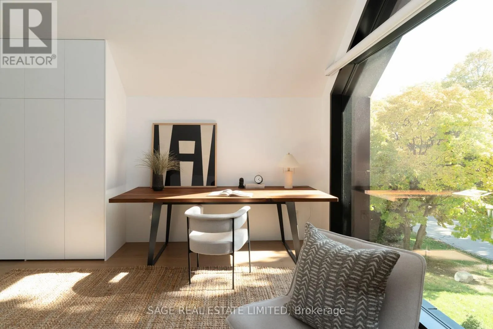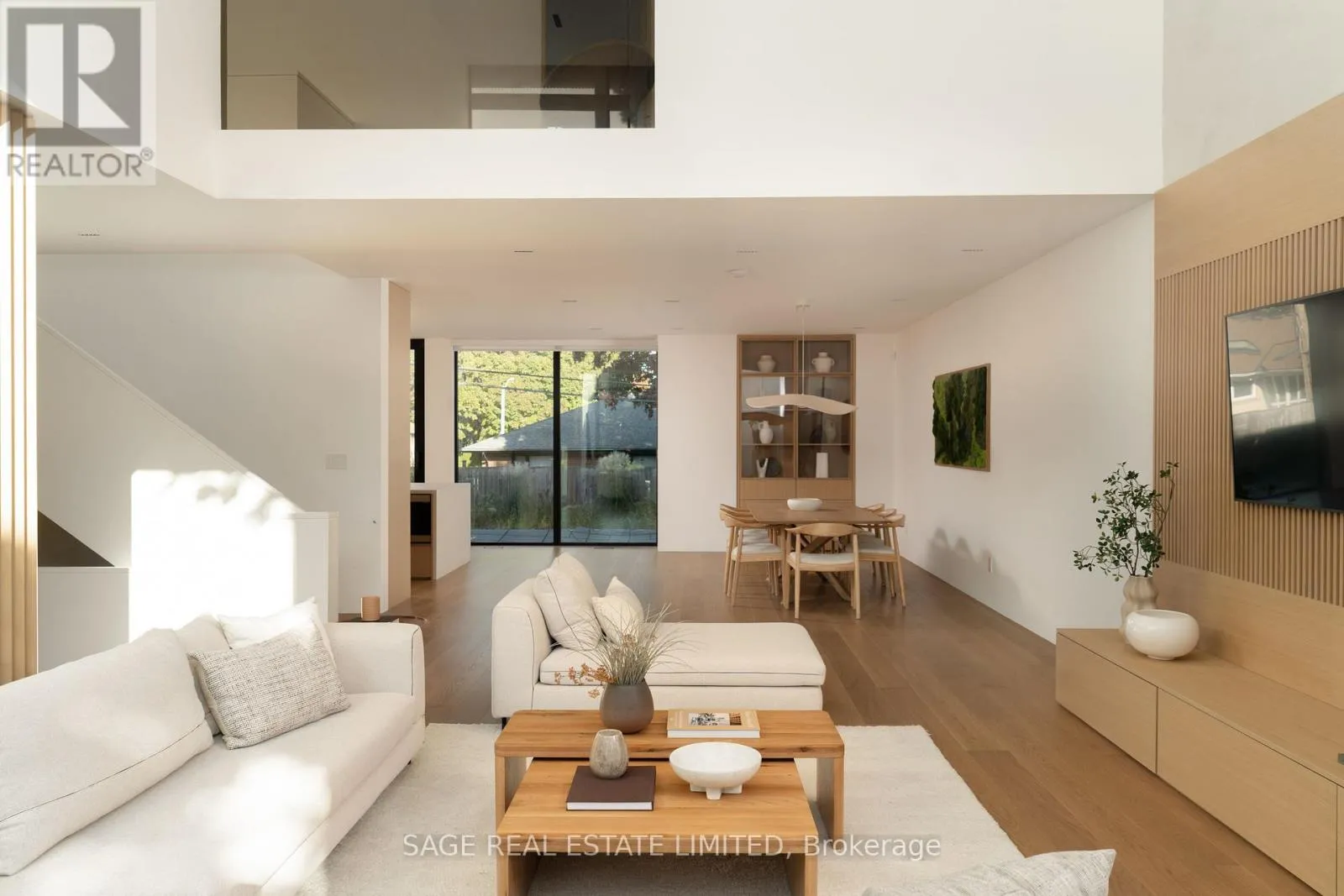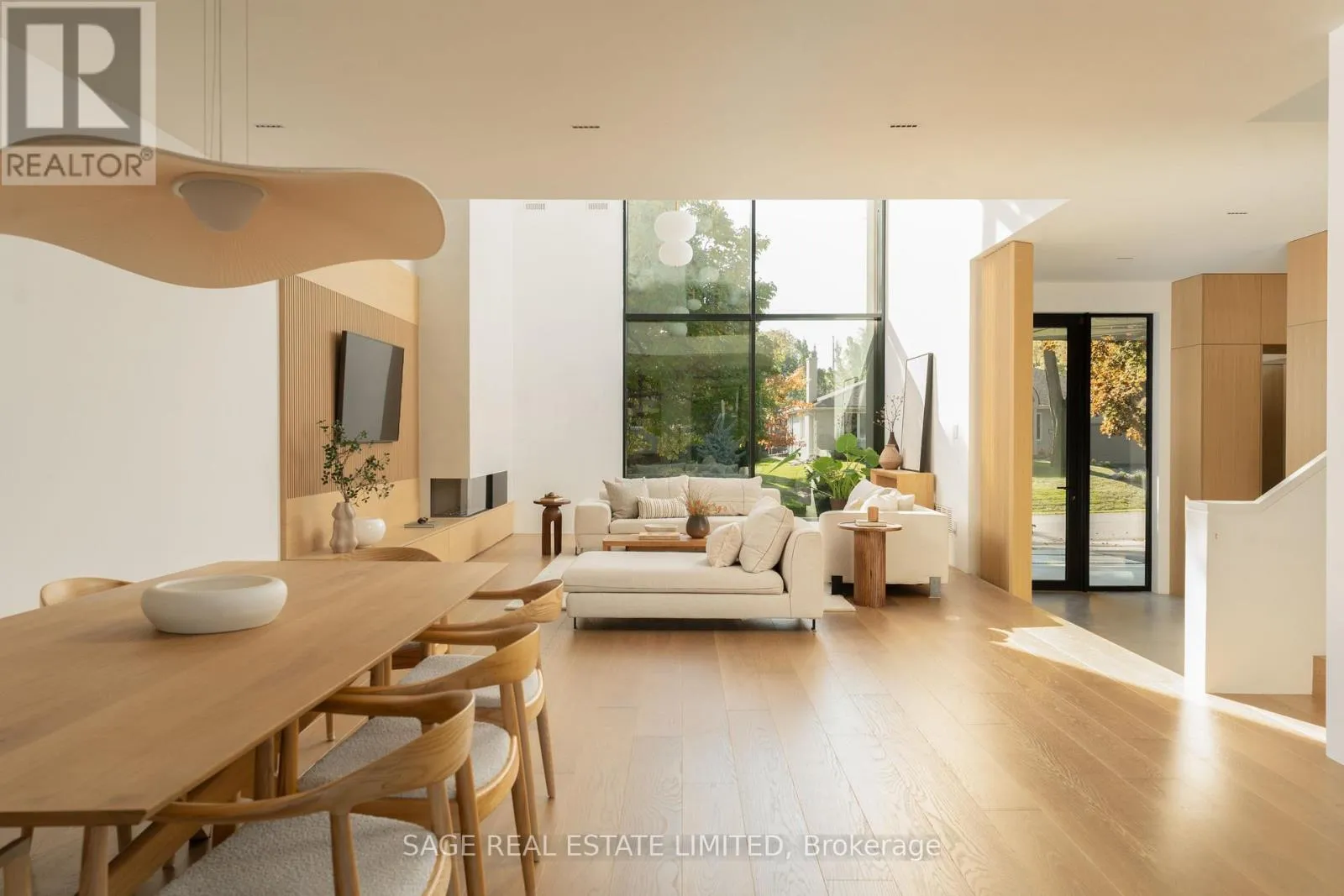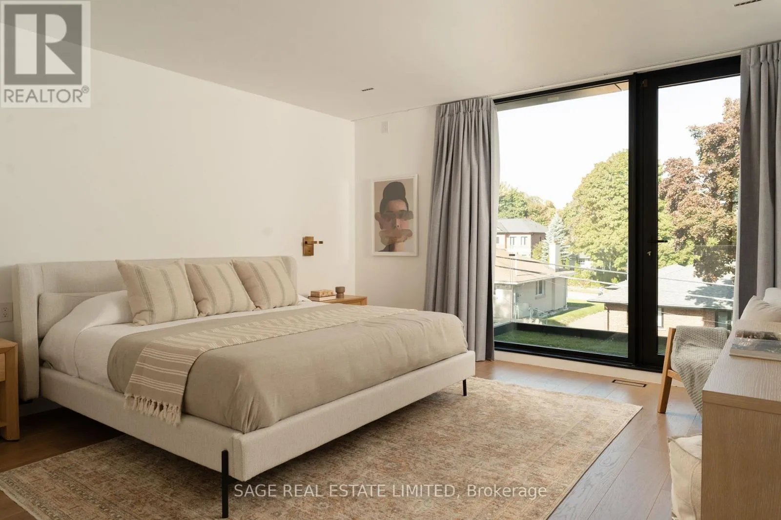 Princess Margaret & Islington UNDESERVINGLY OVERLOOKED - A gentle fusion of Scandinavian and Japanese design, The Emperor sits proudly in Toronto's charming Princess Anne Manor neighbourhood. This detached custom build is an architectural wonder of the west end with smooth finishes, oak floors and panelling, plunging sight lines and cascading sunlight. Hidden doors reveal themselves at your fingertips to unassuming ensuite bathrooms dressed in creams and stone or covert closets with abundant storage - its invisible lines maintain minimalism at the forefront of its demure design. Dramatic floor-to-ceiling windows rise 21 feet high in the main living, wide open to a generously sized dining room and bright kitchen with an exceptional breakfast island and concealed coffee nook. Fluting and custom millwork anchors the front entrance and frames the tv, complimenting the microcement finished gas fireplace. A constellation of soft lights quietly illuminates the home, a spectacle when the sun goes down, while its tobacco coloured facade stretches across the 76 foot wide lot and leads to an inground saltwater pool at the rear. Beneath century old canopy trees, around slow swooping roads, this one-of-a-kind modern build is two minutes from St George's Golf & Country Club & only ten minutes to Pearson Airport. Over 5000 total square feet, your choice of two primary bedrooms and multiple flex spaces on the top floor with the option to convert them to extra bedrooms - executives, creatives, gamers, podcasters, families and fitness enthusiasts will find limitless potential and a whole new meaning to going home at 38 Ravensbourne. (id:27476)