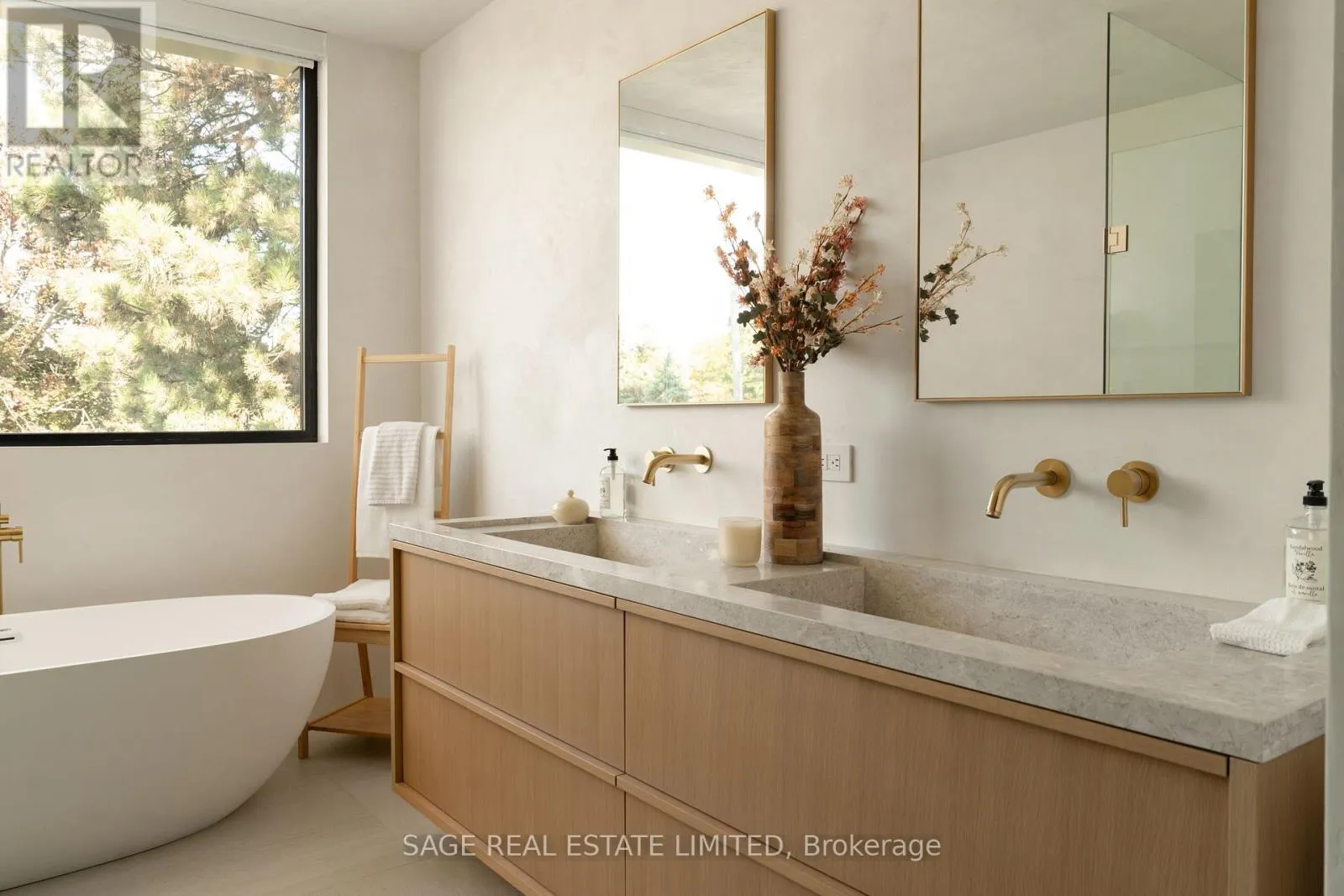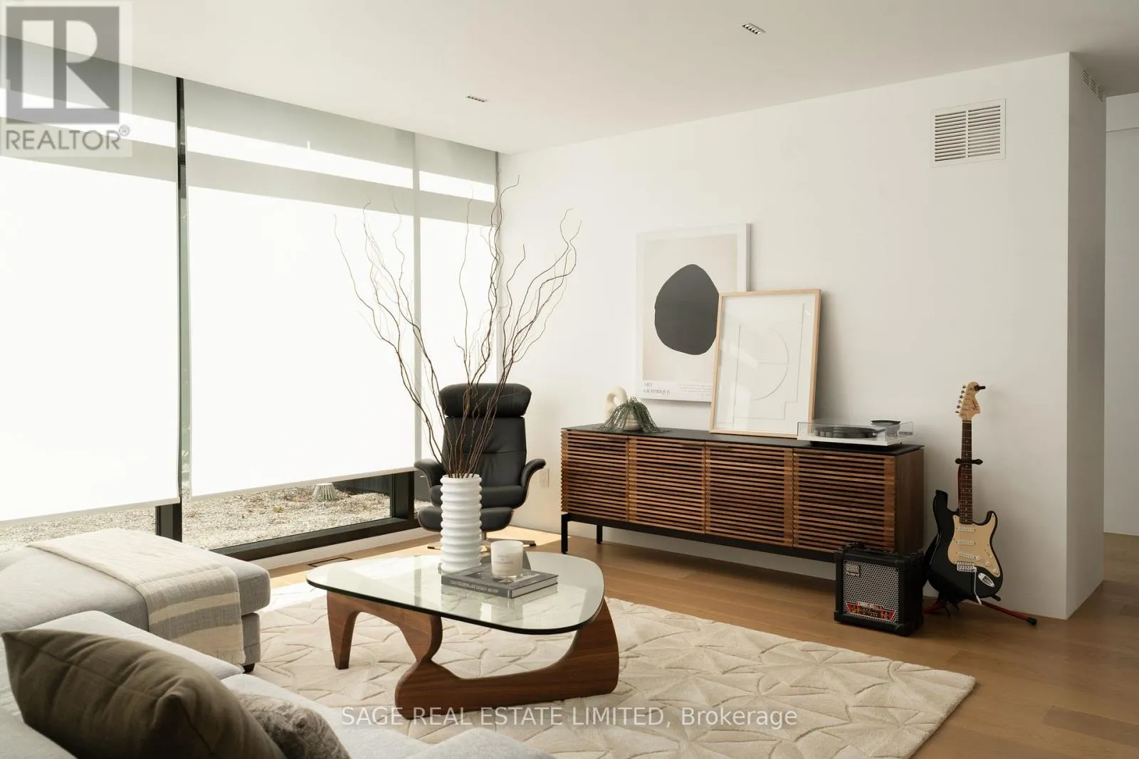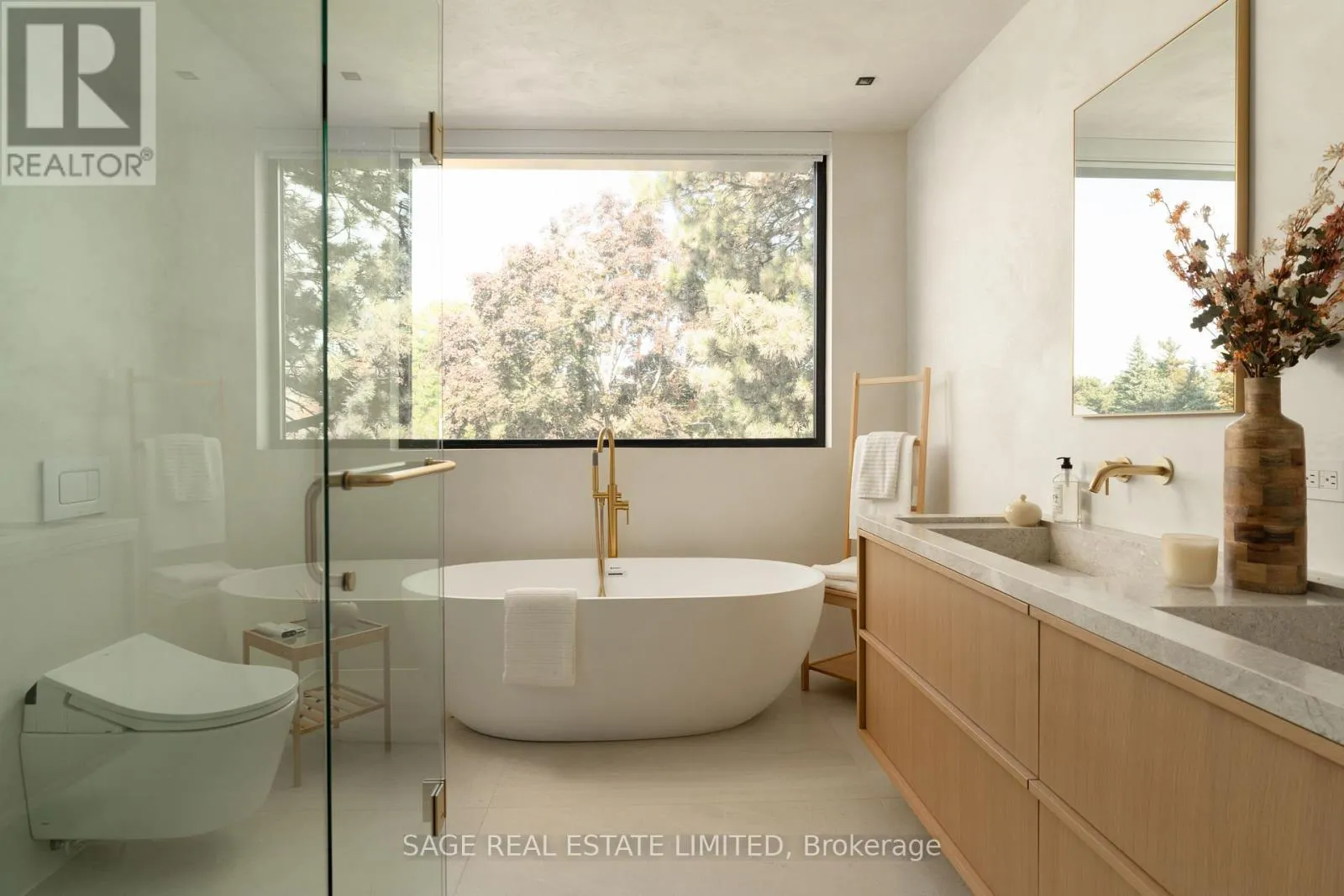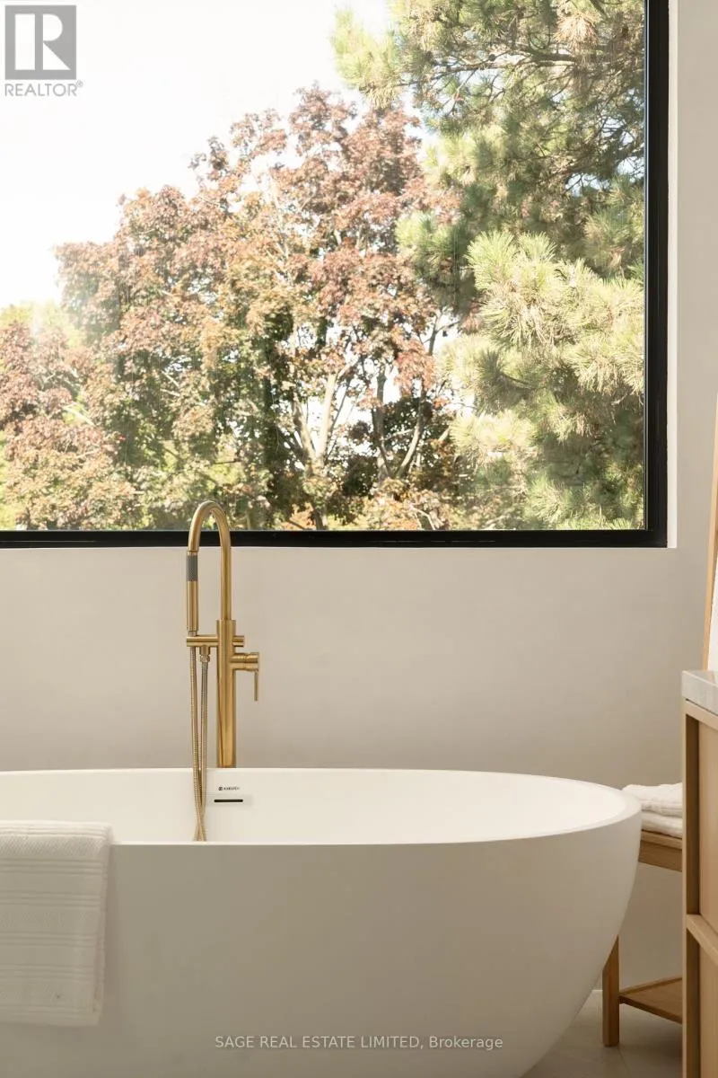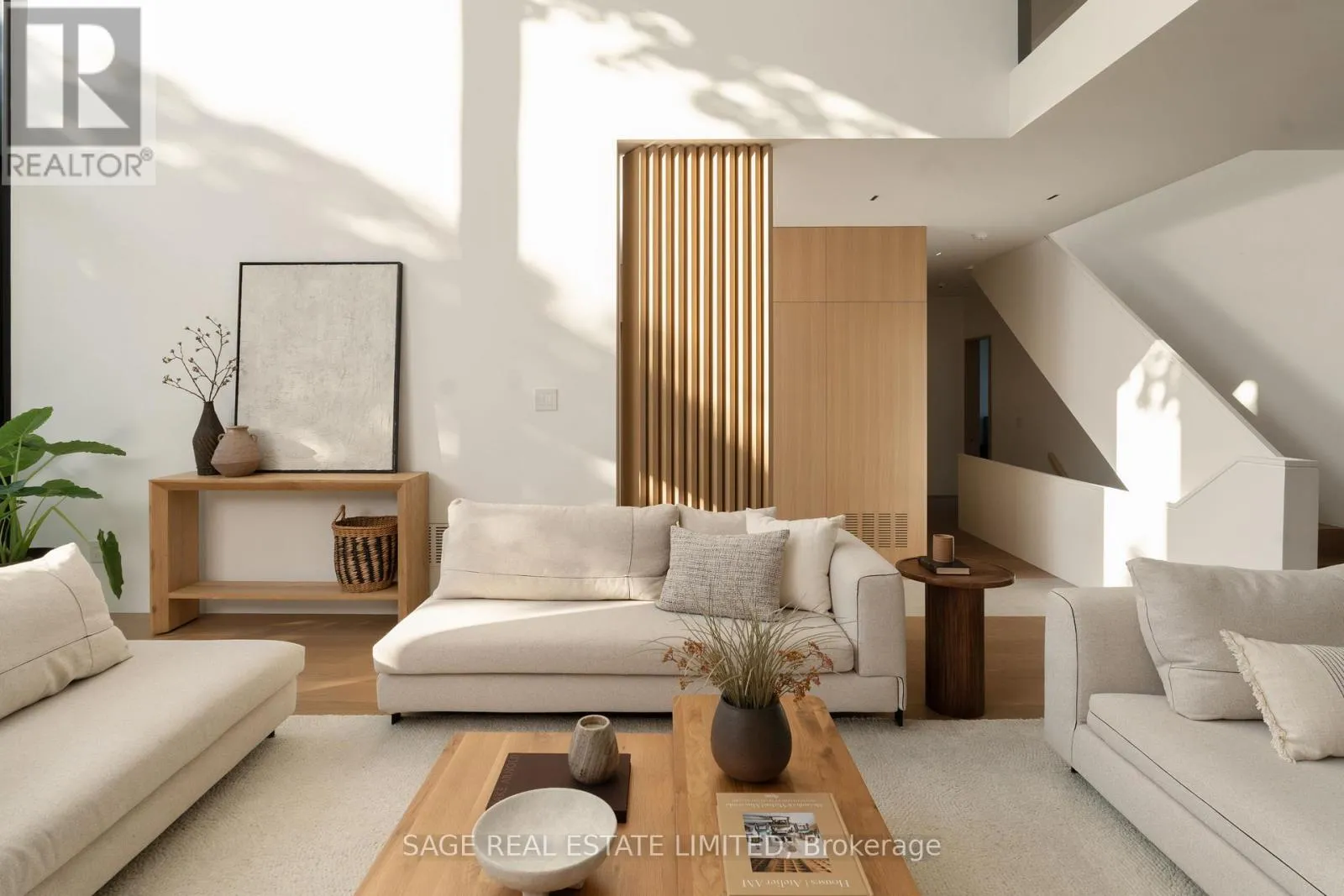 Princess Margaret & Islington UNDESERVINGLY OVERLOOKED - A gentle fusion of Scandinavian and Japanese design, The Emperor sits proudly in Toronto's charming Princess Anne Manor neighbourhood. This detached custom build is an architectural wonder of the west end with smooth finishes, oak floors and panelling, plunging sight lines and cascading sunlight. Hidden doors reveal themselves at your fingertips to unassuming ensuite bathrooms dressed in creams and stone or covert closets with abundant storage - its invisible lines maintain minimalism at the forefront of its demure design. Dramatic floor-to-ceiling windows rise 21 feet high in the main living, wide open to a generously sized dining room and bright kitchen with an exceptional breakfast island and concealed coffee nook. Fluting and custom millwork anchors the front entrance and frames the tv, complimenting the microcement finished gas fireplace. A constellation of soft lights quietly illuminates the home, a spectacle when the sun goes down, while its tobacco coloured facade stretches across the 76 foot wide lot and leads to an inground saltwater pool at the rear. Beneath century old canopy trees, around slow swooping roads, this one-of-a-kind modern build is two minutes from St George's Golf & Country Club & only ten minutes to Pearson Airport. Over 5000 total square feet, your choice of two primary bedrooms and multiple flex spaces on the top floor with the option to convert them to extra bedrooms - executives, creatives, gamers, podcasters, families and fitness enthusiasts will find limitless potential and a whole new meaning to going home at 38 Ravensbourne. (id:27476)