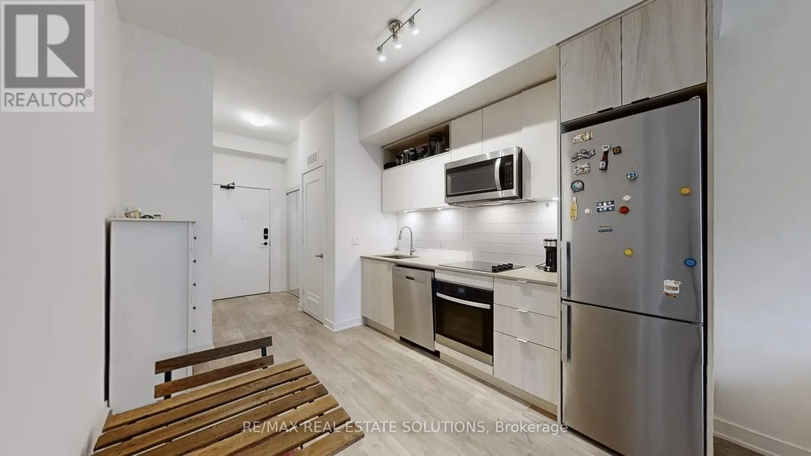 Cross Streets: Lower Sherbourne St & Front St E. ** Directions: South of Front St E and East of Lower Sherbourne St. Located in one of the best areas in downtown Toronto, this bright East-facing 1 bed + den, 1 bath suite at Time & Space by Pemberton offers the ultimate in functional urban living. This suite features 9' high smooth ceilings and 7 1/2" wide premium laminate flooring throughout. The versatile layout includes a rare den with its own door, making it a true multi-purpose space perfect for a home office or a functional second bedroom, while the primary bedroom boasts a spacious walk-in closet. The modern kitchen is equipped with stainless steel appliances and contemporary finishes, complemented by a private balcony. This building offers an exceptional range of amenities, including a 24hr concierge, fully equipped gym, infinity pool, rooftop deck with gardens and BBQs, games room, and party room - appealing to both end-users and investors. Boasting a 99 Walk Score and 100 Transit Score, you are steps to St. Lawrence Market, the Distillery District, the waterfront, and George Brown College, with effortless access to TTC transit, dining, shopping, and major downtown employment hubs. (id:27476)