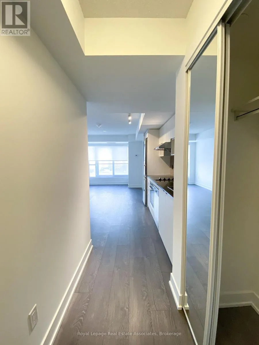 Bloor & Islington Welcome to Islington Terrace by Tridel, a modern and well-managed residence offering convenient urban living in the heart of Islington-City Centre West. This efficiently designed 1-bedroom suite spans 488 sq. ft. and features a functional open-concept layout with clean finishes and comfortable proportions ideal for everyday living. The contemporary kitchen is finished with full-height cabinetry, integrated stainless steel appliances, and quartz countertops, flowing seamlessly into the combined living and dining area. Wide-plank flooring and large windows create a bright, airy interior, while the Juliette balcony allows for fresh air and an added sense of openness. The bedroom includes a full-height window and generous closet space, complemented by a modern 4-piece bathroom with sleek tilework and a streamlined vanity. In-suite laundry is conveniently tucked into a dedicated closet, and the suite includes one underground parking space and one locker for added practicality. Residents enjoy access to a curated collection of amenities including a fitness centre, games room, guest suites, and 24-hour concierge service. Ideally located steps from Islington Station, parks, grocery stores, cafés, and everyday essentials, this suite offers comfortable, well-connected living in a vibrant and accessible Etobicoke neighbourhood. (id:27476)