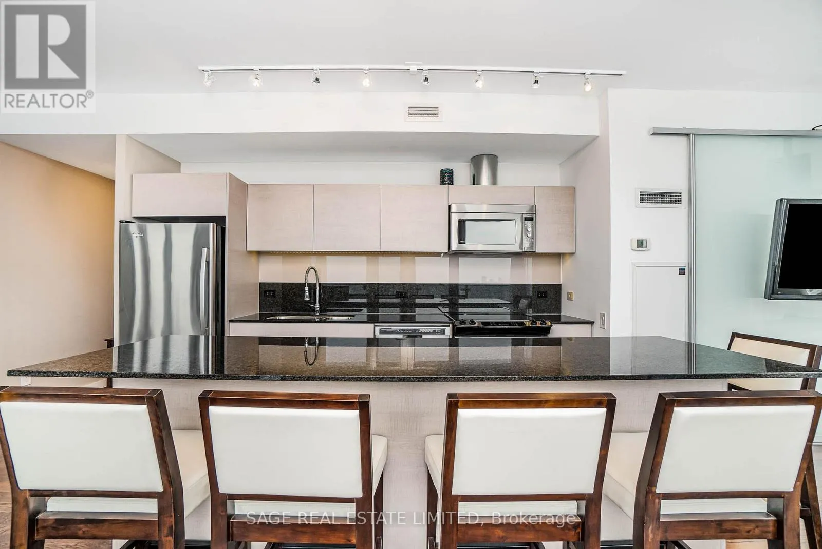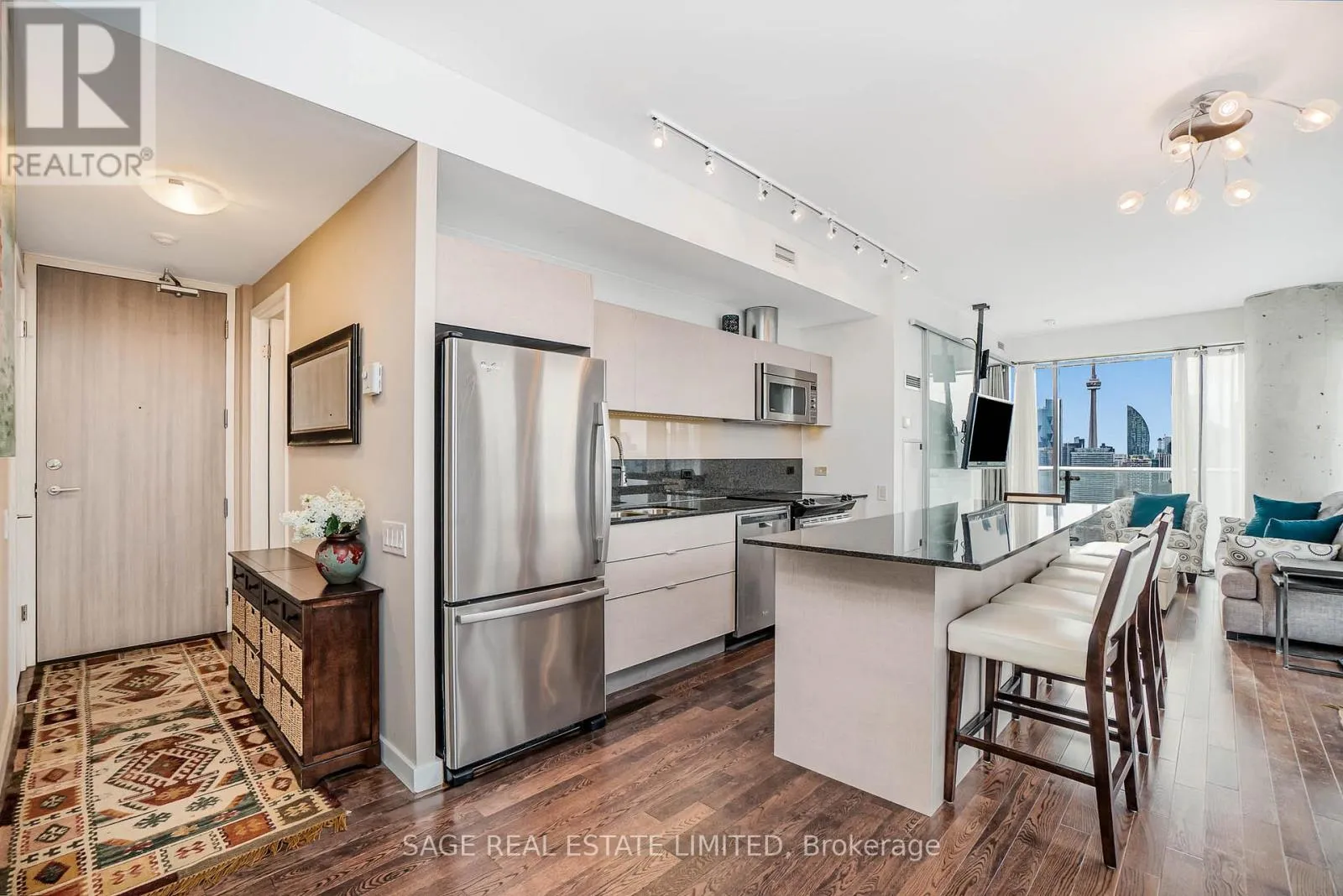 Cross Streets: PARLIAMENT / FRONT. ** Directions: Google maps. Sweeping city and lake views meet exceptional walkability in the Distillery District's highly acclaimed Clear Spirit Condos. Just in time for spring, this bright and spacious 850 sq ft two-bedroom, two-bathroom corner suite offers a rare 350 sq ft wrap-around terrace, creating an elevated outdoor living experience with breathtaking west-facing city views. Enjoy unforgettable summer sunsets from your private terrace above the skyline. The well-maintained residence features quality upgrades, including a large built-in island with quartz countertops, ideal for both everyday living and entertaining. Located in a vibrant, sought-after community with easy access to shops, dining, transit, and trails. Available March 1. (id:27476)