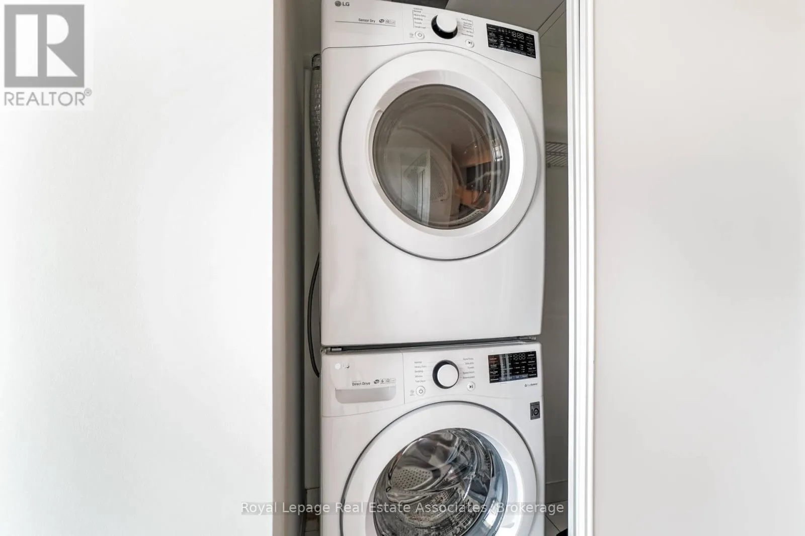 Stratchan/Wellington Don't miss this incredible opportunity to live in the heart of Liberty Village! This spacious split 2-bedroom, 2-bathroom layout has been upgraded with high-end finishes throughout. You'll love the gorgeous hardwood floors, oversized LG washer and dryer, and the rain showers with premium tiles in both bathrooms. The modern kitchen is equipped with stainless steel appliances, Caesarstone countertops, a stylish tumbled backsplash, and a Moen spring pull-down faucet. The generous primary bedroom features a walk-in closet, a private balcony, and a 4-piece ensuite bathroom. The second bedroom offers a large closet and floor-to-ceiling windows, providing plenty of natural light. Enjoy the expansive balcony that spans the width of the unit, perfect for outdoor relaxation. Amazing building amenities include 24-hour concierge service, underground visitor parking, a fully-equipped gym, sauna, outdoor pool, roof deck, party room, and more. Located in a highly walkable neighborhood with easy access to transit, cafes, restaurants, parks and grocery stores just steps from your door. Steps away from TTC, waterfront and Hwys. This is the perfect place to call home! (id:27476)