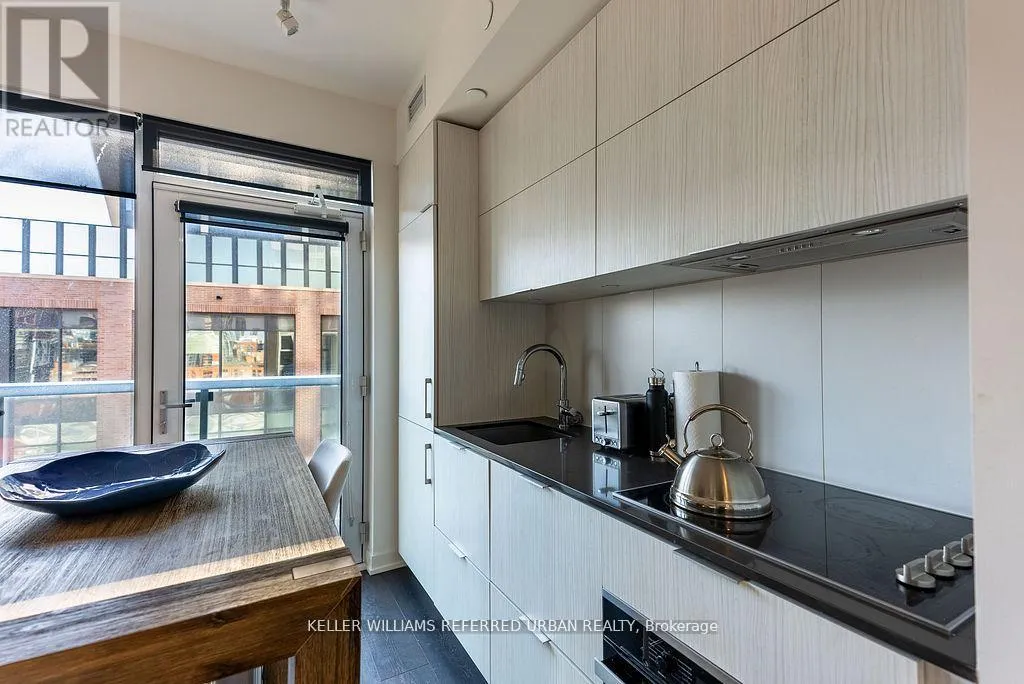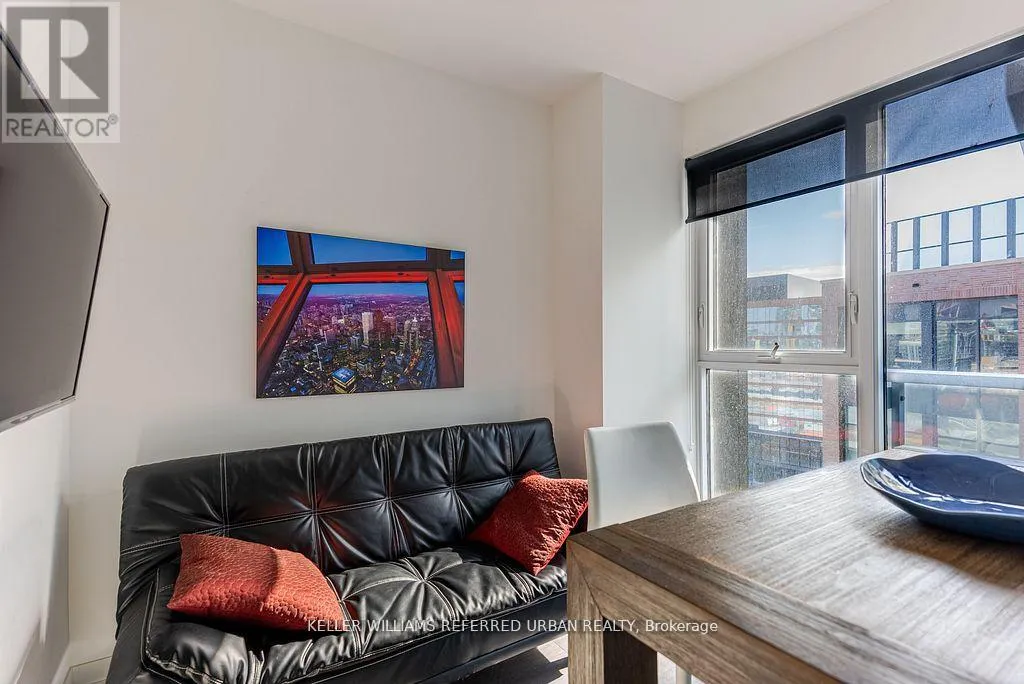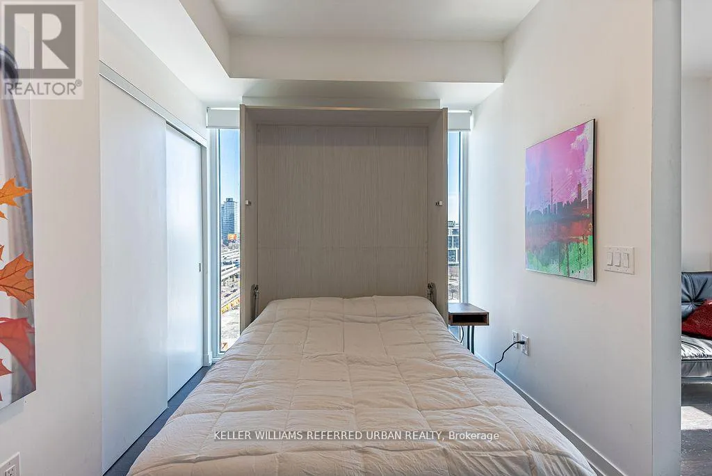 Queens Quay & Lower Jarvis Fully Furnished Daniels Lighthouse Tower East - Alumni Collection Experience upscale living in this upgraded Junior 1-bedroom suite (The Humber Model), featuring a double European bed frame. This stylish unit includes a locker, roller blinds, a wall-mounted T.V., an island bar with two stools, plus dishes, utensils, decorative pictures, and a mirror. Enjoy stunning south-facing views and close proximity to Sugar Beach and St. (id:27476)