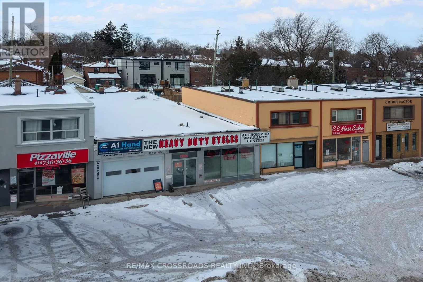 Kingston Rd/Claremore Ave Prime standalone commercial opportunity offering 3,955 SF in a high-visibility location along Kingston Road, currently occupied by a long-established motorcycle sales and service business operating since 1974. Featuring approximately 3,712 SF on the main level, this property boasts one of the largest floorplates along this stretch, ideal for retail users requiring expansive showroom, service, or open-concept space, including automotive, recreational, or specialty retail. The interior is presently divided into multiple functional areas and can be easily reconfigured to suit a wide range of uses. Highlights include high ceilings, wide street frontage, excellent signage exposure, on-site front parking, and rear laneway access. Zoned CR (Commercial Residential), the site offers flexibility for various commercial uses and future mid-rise redevelopment potential within a rapidly evolving corridor experiencing significant reinvestment and intensification. Vacant possession available on closing, making this an exceptional opportunity for owner-users, investors, or developers seeking a rare large-format asset with strong immediate utility and long-term upside. There is an auto repair permit owned by the Cycle shop that can be purchased at an additional fee if needed. (id:27476)