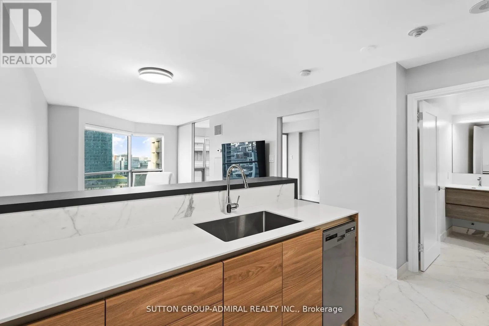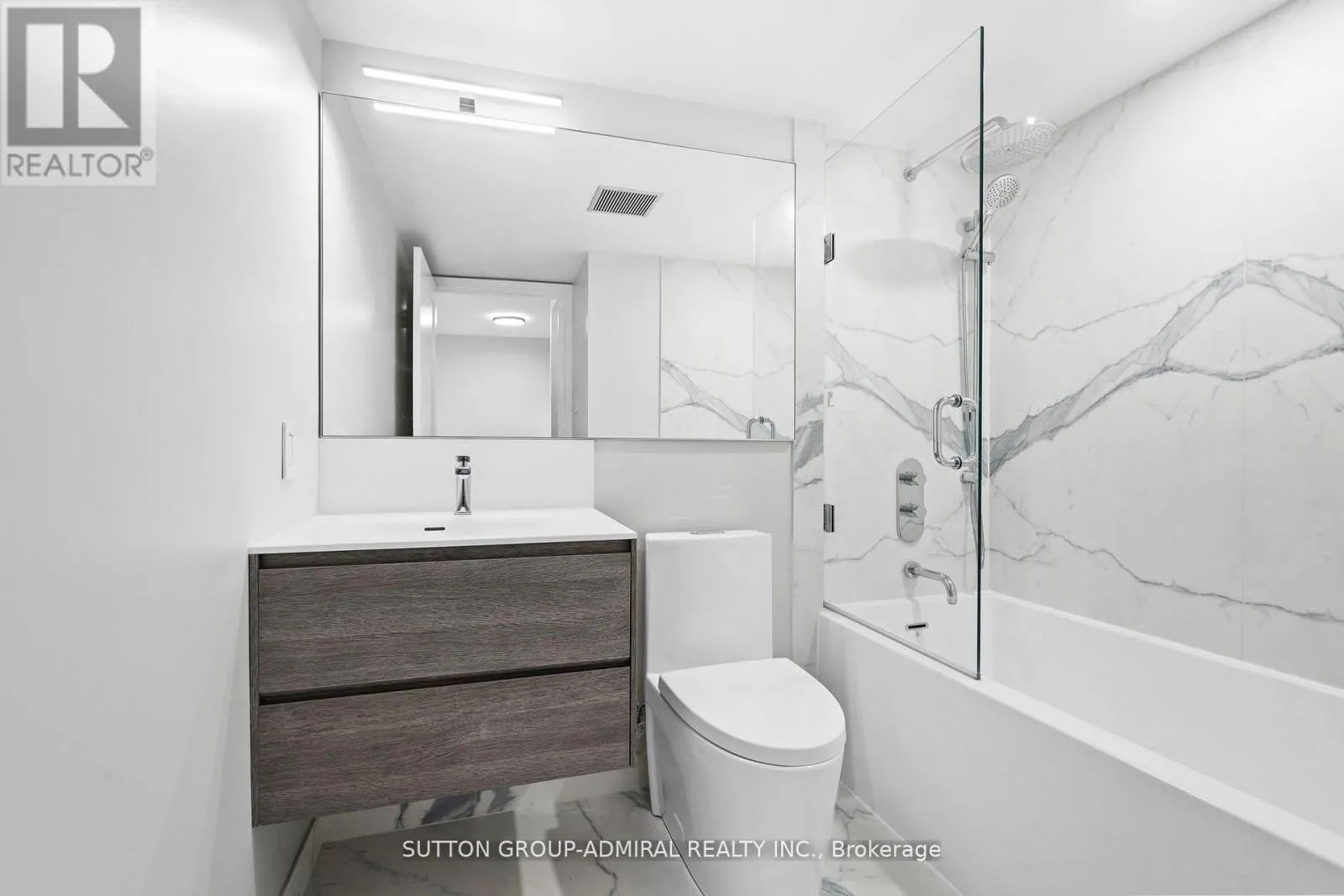 Yonge/Queens Quay Indulge in unparalleled luxury at the Waterfront Stunning Condo, where sophistication meets modern elegance. Every detail has been meticulously curated, from the Scavolini kitchen to the 4-piece bathroom featuring a soaker tub with book match backsplash, exquisite book-matched tiles in the kitchen and bath. The master bedroom boasts an upgraded closet with custom built-in organizers, complemented by an additional front entrance closet with upgraded custom built-in organizers. Floor-to-ceiling windows throughout, with remote-controlled window coverings. Enjoy Bell Internet & TV package included in the maintenance fees. Immerse yourself in five-star amenities! Elevate your lifestyle. A true masterpiece - this residence must be experienced to be fully appreciated. (id:27476)