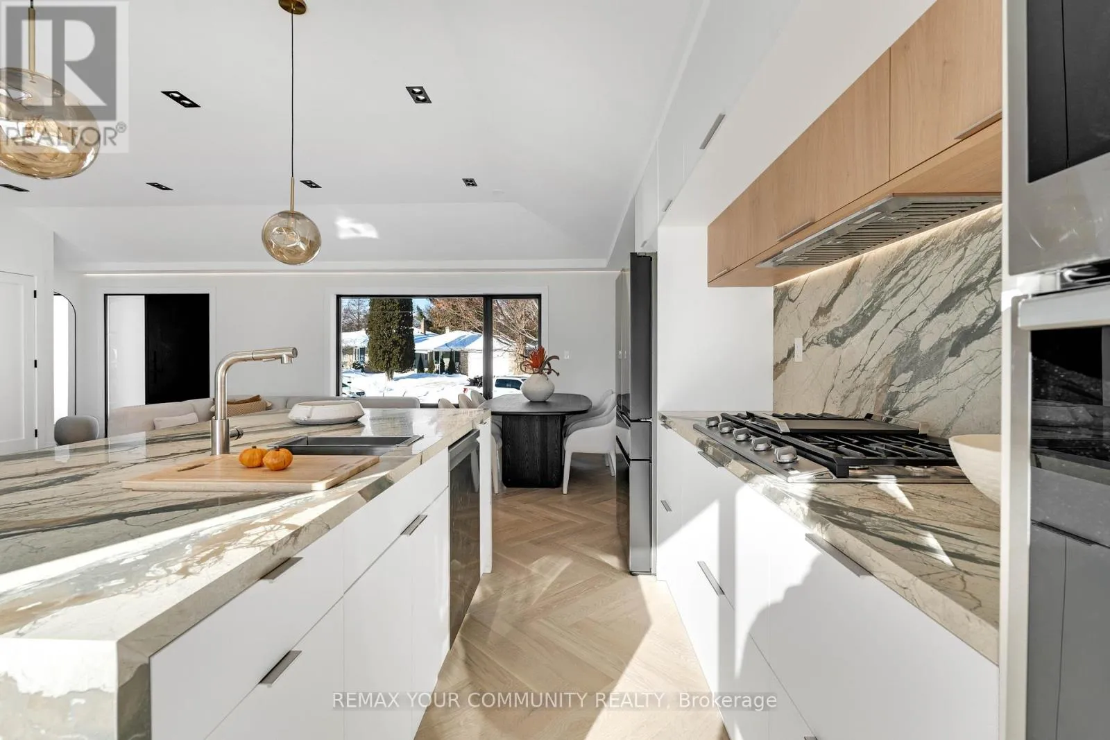 Leslie/Finch Stunning fully renovated side-split in the heart of Bayview Village. Rebuilt with closed permits, this 4+1 bedroom home features a bright, open-concept layout designed by architectural plans, soaring ceilings up to 10 ft on the main floor, and custom designer LED lighting.The entire home has been spray-foam insulated, including full insulation in all walls and ceilings, with all-new framing, windows, and doors. Major upgrades include a new roof and skylight (2025), a 200-amp electrical panel with new wiring throughout, completely updated plumbing with new underground drainage, a new 50-gallon hot water tank, and a waterproofed foundation with damp proofing, weeping tile, sump pump, and backflow prevention valve.This home offers two kitchens and two laundry areas with a separate entrance, ideal for in-law living or additional income potential. Set on a rare wide lot expanding to approximately 69 ft at the rear, the property also features a new asphalt driveway, a new deck, a fully redesigned backyard with fresh landscaping, and a private outdoor seating area with a gas line for BBQ and fire pit.Easily accessible to major highways, and close to excellent schools, hospitals, libraries, and shopping. with just minutes' walk to ravine trails-offering and Tennis court, the perfect combination of convenience and lifestyle. (id:27476)