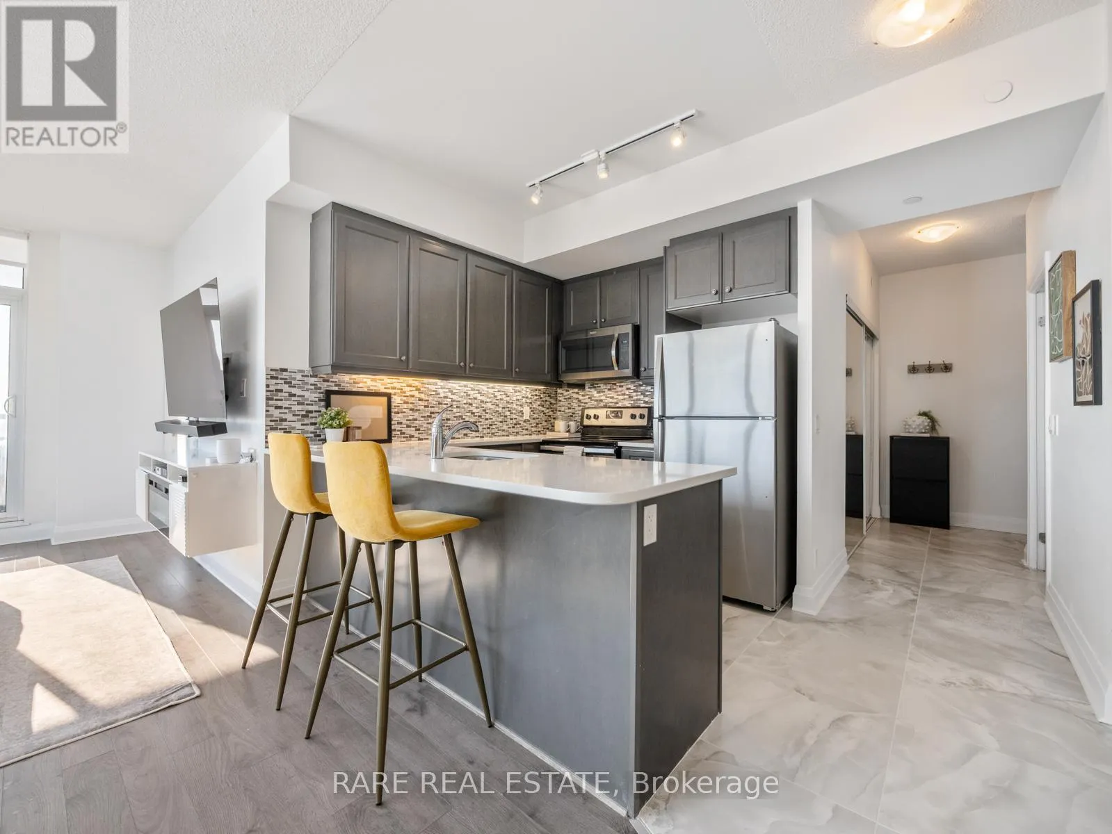 The Queensway & Kipling Ave Set within one of Etobicoke's most connected pockets, this modern condo at 15 Zorra Ave offers a smart balance of design, functionality, and everyday convenience. Positioned just off The Queensway, you're moments from transit, major commuter routes, and a growing mix of shops, restaurants, and essentials-making downtown Toronto easily accessible without sacrificing neighbourhood feel. Inside, Perfectly proportioned 825 sq ft centred around an efficient U-shaped kitchen with breakfast bar. The open concept den is flexible: office space, breakfast nook, dining set, or max out with additional closet space! The primary bedroom is flooded with natural light and features ample closet space and a private ensuite. A second bedroom and full bath round out the space, ideal for guests, roommates, or a growing family. Step onto your private balcony for open South views and fresh air, or enjoy the building's thoughtfully curated amenities designed for modern urban living. With TTC, Kipling Queensway Mall, grocery stores, cafés, pharmacies, and daily conveniences all within walking distance, this is a turnkey opportunity in a rapidly evolving Etobicoke corridor. (id:27476)