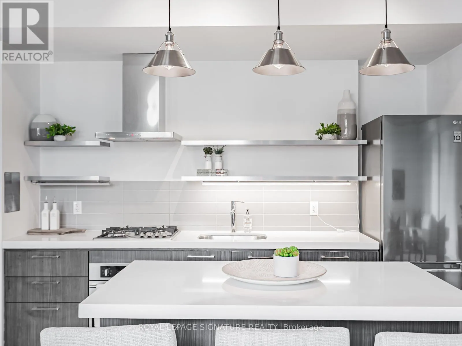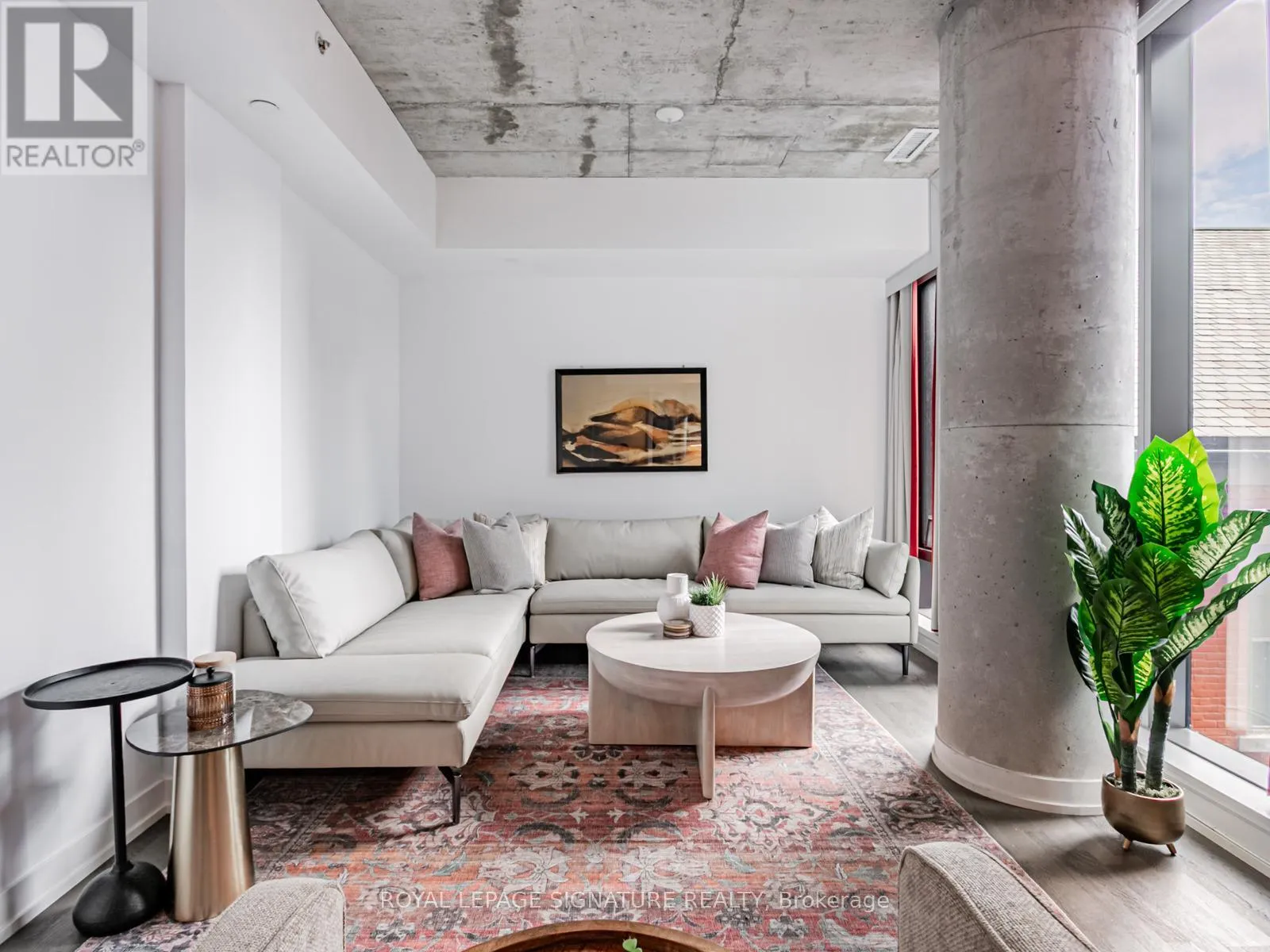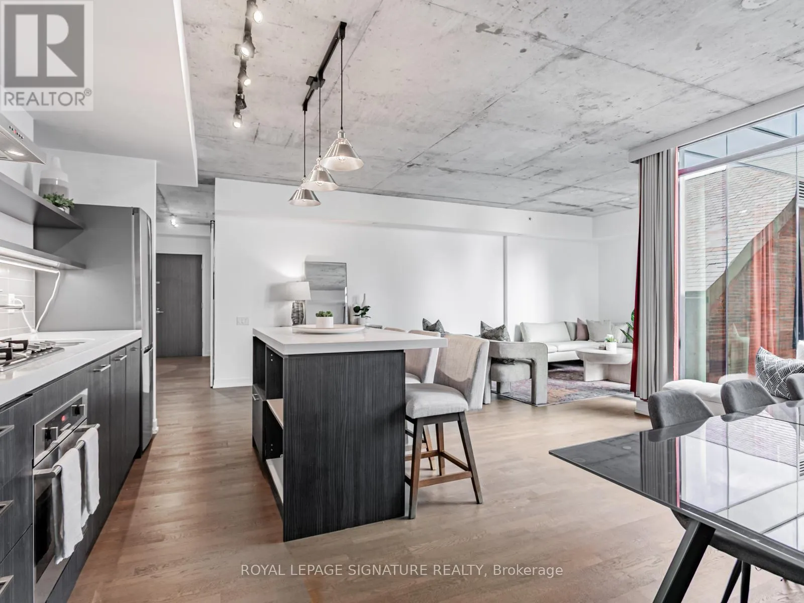 Cross Streets: King/Portland. ** Directions: N side King, E of Portland. Big Loft Energy at Fashion House! Nearly 1000 sq ft of bold, open-concept living in one of King West's most iconic addresses. This oversized loft blends urban edge with soft sophistication - think soaring ceilings, exposed concrete, wide-plank hardwood floors, and a gallery-like layout that's made for entertaining. The sleek chefs kitchen features stone counters, premium appliances, and a generous island that anchors expansive living and dining zones. The king-sized bedroom is tucked away for privacy and boasts a dreamy walk-in closet, while a spacious separate den easily works as a stylish home office or a second bedroom. Underground parking included - a rare luxury in this prime location. Fashion House is beloved for its boutique feel and jaw-dropping rooftop infinity pool overlooking the skyline. Residents enjoy a 24-hour concierge, gym, party room, guest suites, and a lobby with serious red-carpet energy. Steps to The Well, Waterworks Food Hall, Lee, Gusto 101, Buca, the Financial District, Queen West, and the waterfront. This isn't just a loft. Its a lifestyle. Big space. Big style. Big energy. Don't sleep on it - your next chapter starts here. (id:27476)