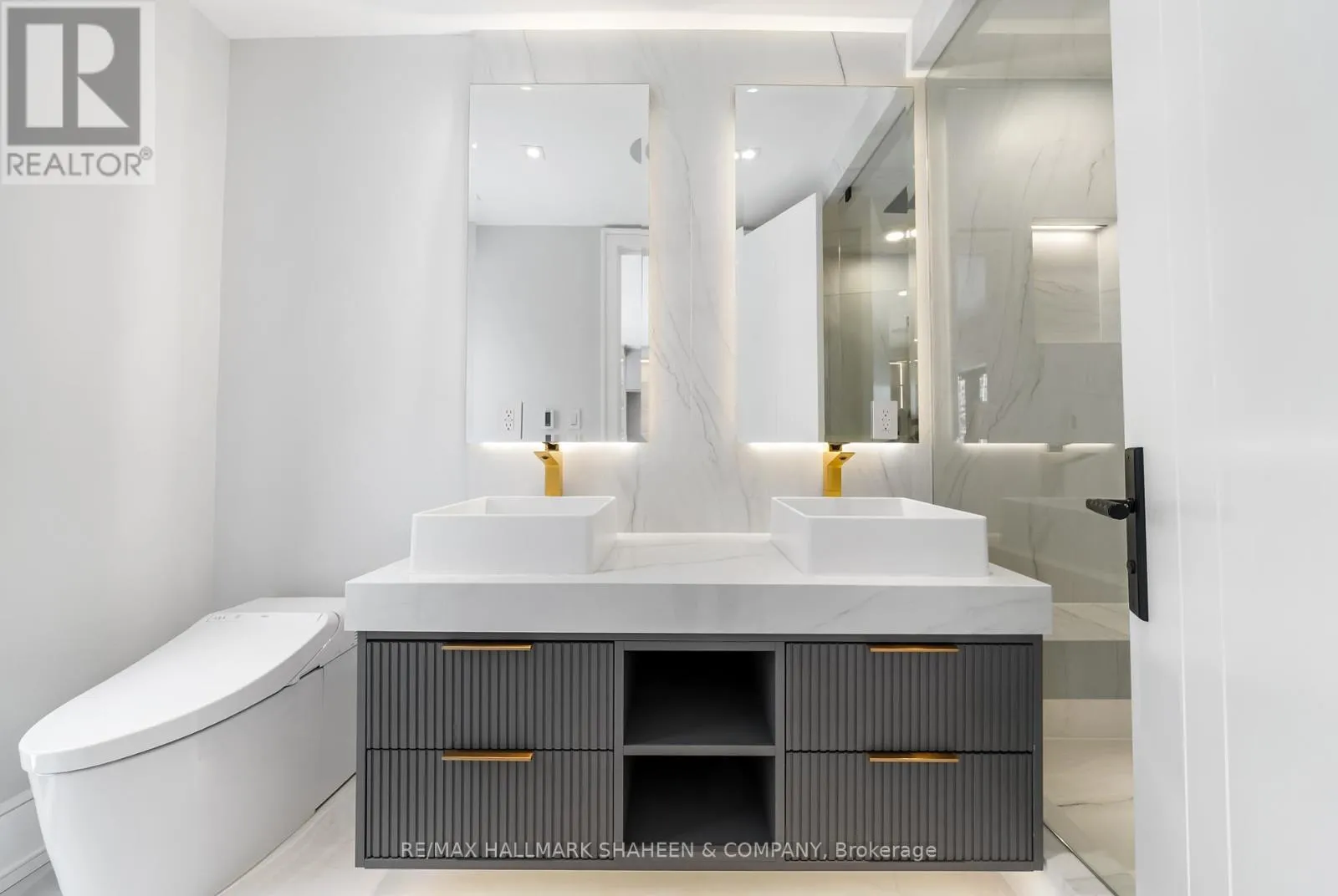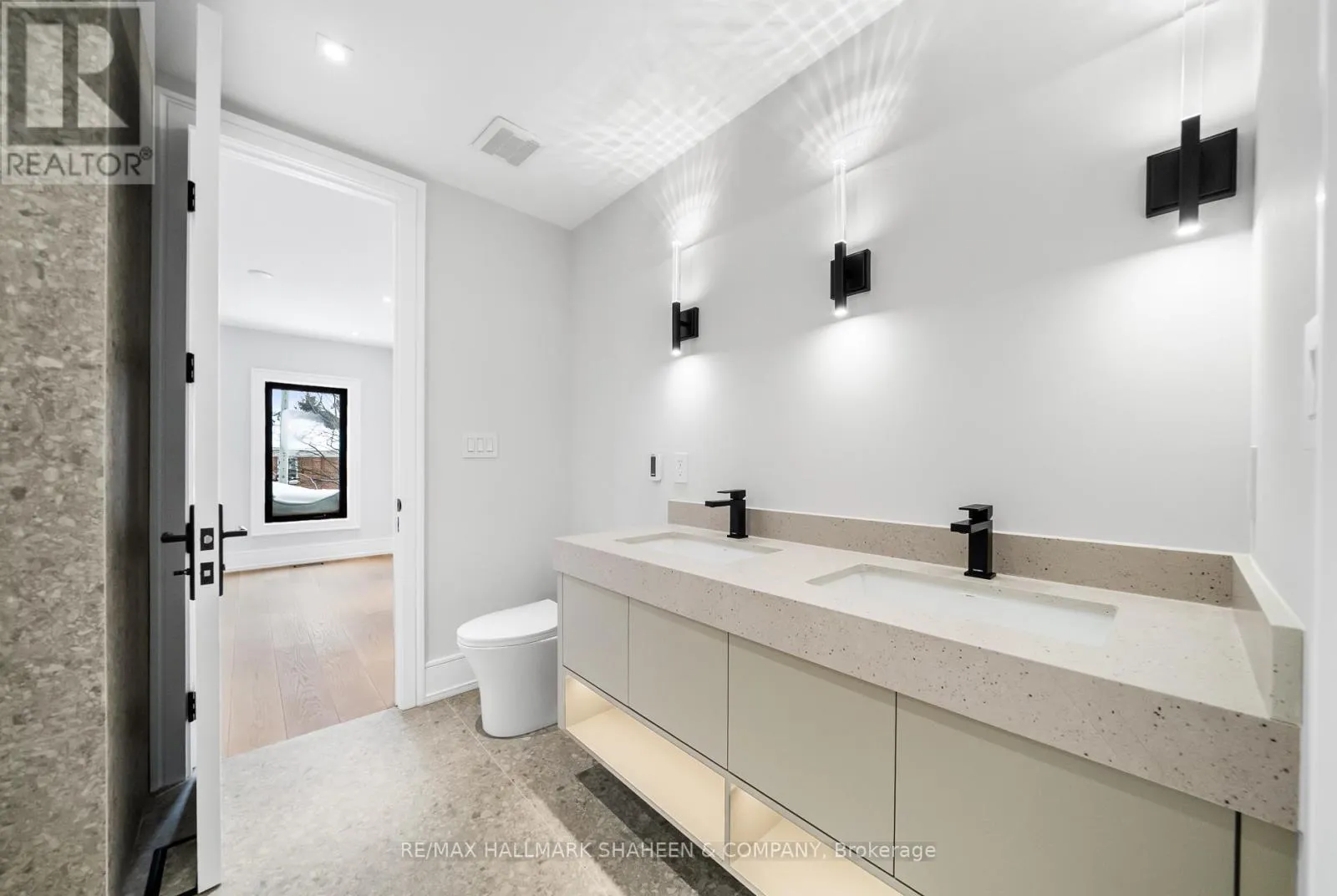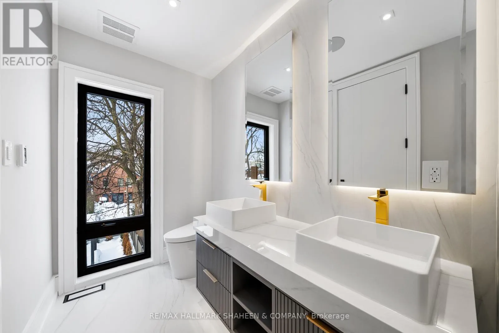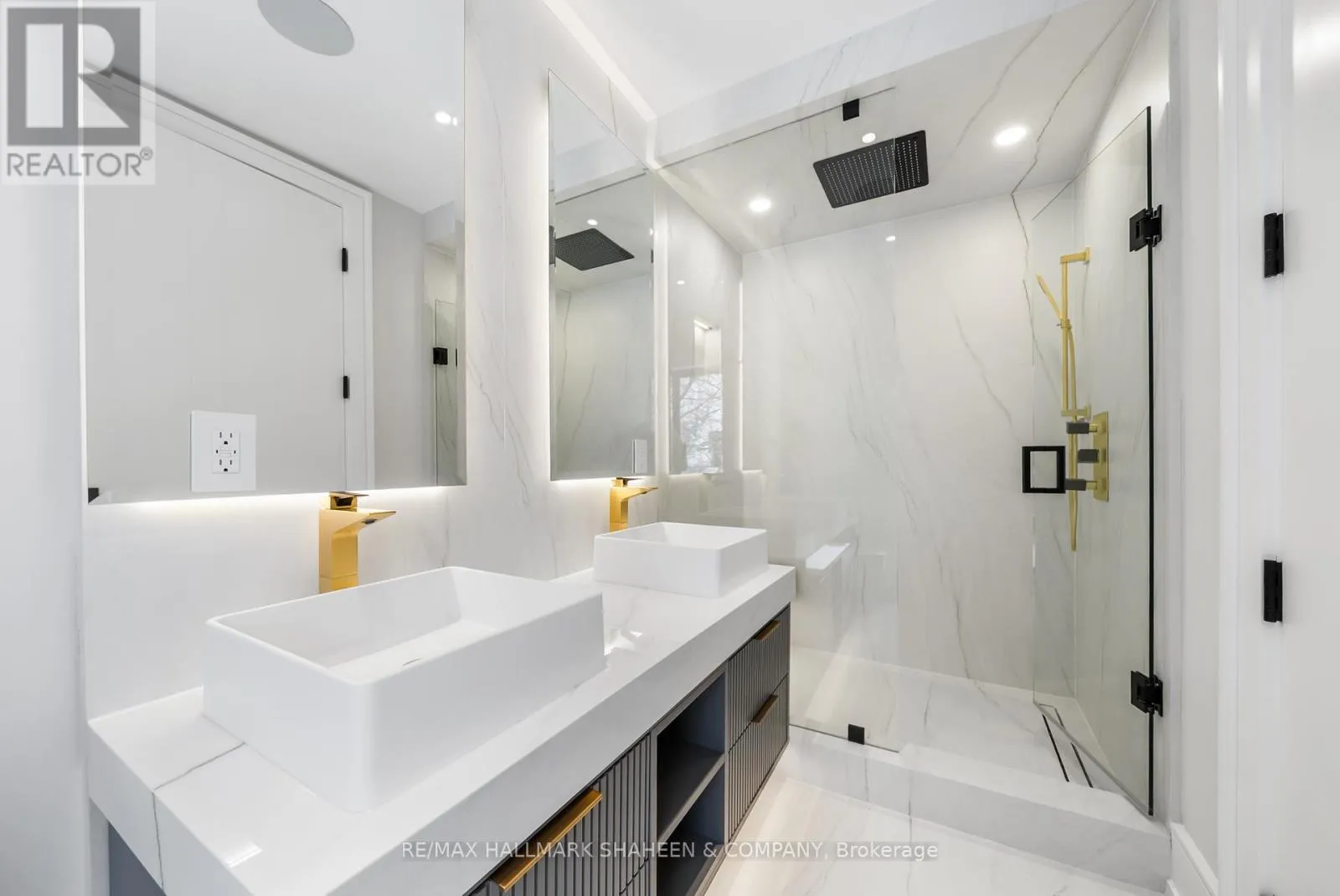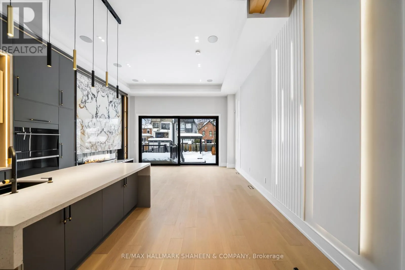 Cross Streets: Yonge St & Eglinton Ave W. ** Directions: East of Aveune Rd, West of Duplex Ave. The experience begins on arrival with a heated driveway, followed by 12+ foot ceilings, skylights, and a raised, light-filled living space that set the tone for scale and warmth. The chef's kitchen is anchored by a large island wrapped in a fluted finish, a design motif echoed throughout the home in Vogt faucets, solid brass hardware, and refined architectural accents. Custom millwork is paired with a premium appliance suite including a Sub-Zero fridge/freezer, Wolf six-burner gas cooktop, wall oven, and Bosch dishwasher. The family room is elegant yet inviting, featuring fluted oak veneer panels, custom built-ins, and a porcelain fireplace, with floor-to-ceiling glass opening to a beautifully landscaped backyard. Enjoy a composite deck, interlocking surfaces, gas lines for a BBQ and firepit, gazebo, and full landscape illumination-ideal for quiet evenings at home. Upstairs, the primary suite offers a serene retreat with custom cabinetry, dual sinks, wall-mounted vanity, linear drain, floor bench, and a seamless full-slab stone shower. One additional bedroom includes its own ensuite, while two others share a bath. A convenient upper-level laundry completes the floor, with rough-ins in place for a future second laundry in the basement. The finished lower level features heated floors, a spacious rec room with walkout, wet bar, wine display, and flexible living space with direct access to the garage. Engineered for comfort and longevity, the home includes radiant in-floor heating for all stone surfaces, a high-efficiency furnace with heat pump cooling, tankless hot water, sump pump, integrated drainage system, an interlock driveway with snow-melt on stairs, and epoxy garage floors with LED lighting. Smart home features include Control4, an Ecobee thermostat, built-in speakers, a Wi-Fi booster, and security cameras. Set between Avenue Road and Yonge Street, within the coveted Allenby Junior PS and North Toronto CI catchments. (id:27476)