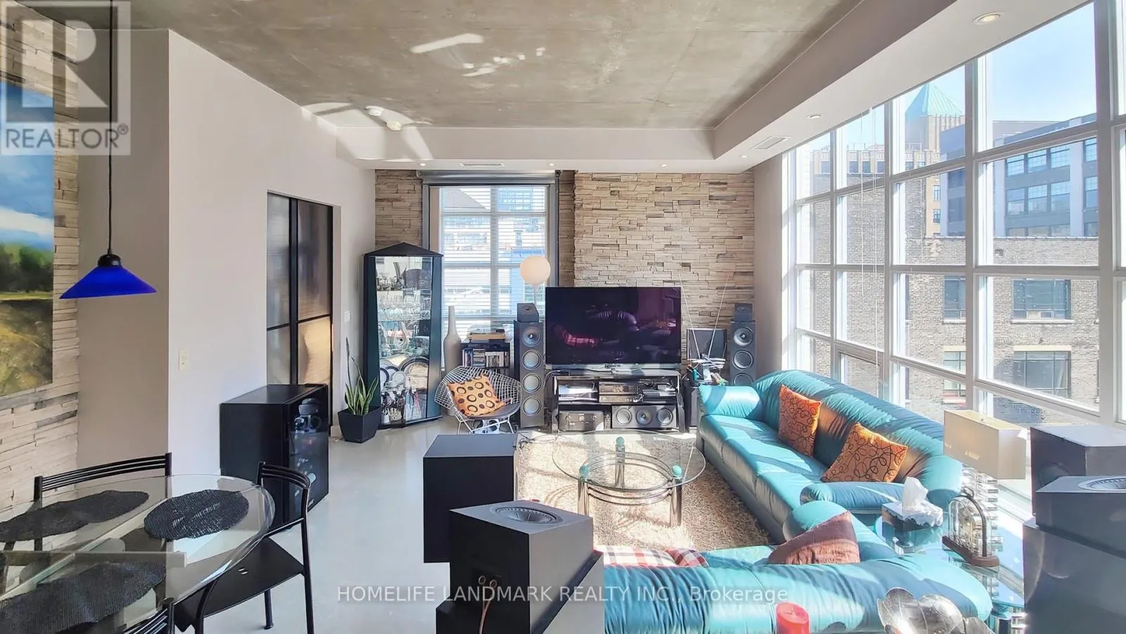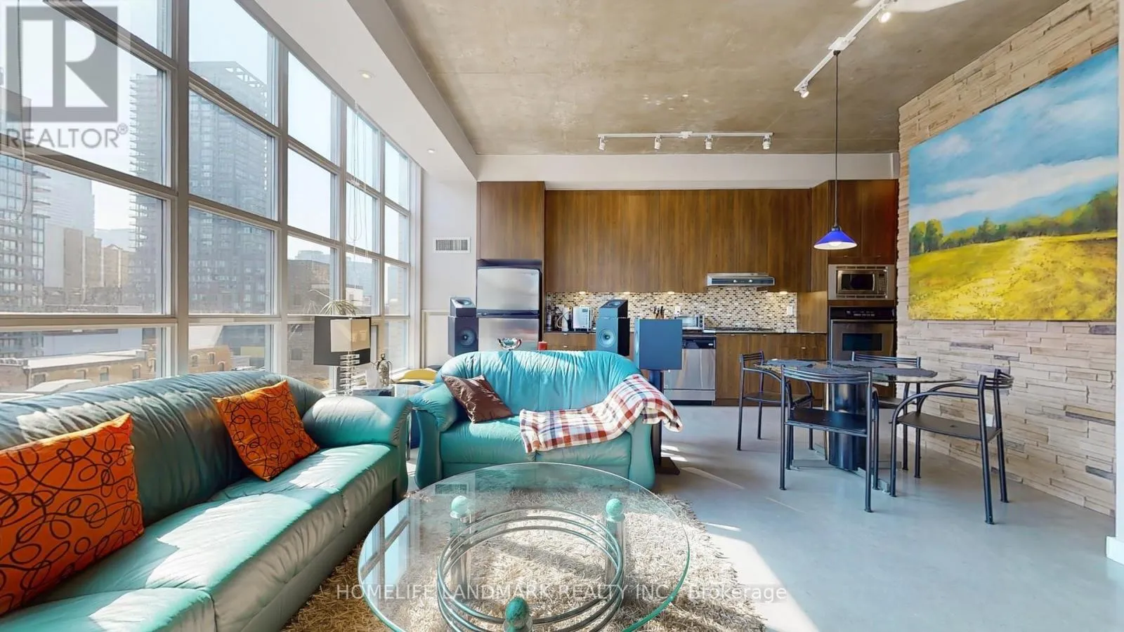 Cross Streets: Spadina & King. ** Directions: in Front Brant Street, either north from King or South from Adelaide. Amazing Loft Style Unit!! Look no further than this spacious 1+1 bedroom unit in the Quad Lofts with full 10.5ft Ceiling at 792 Sqft (MPAC), bigger than ALOT of 2BR units. Bright east facing corner unit and Unobstructed by other Building allowing Natural Sunlight throughout the Day. Tucked away in a private, unique low rise boutique building and with easy Access to Queen king and Spadina streetcars yet! Steps to all the amazing Amenities & Restaurants ! Bright living space with polished concrete floors, floor-to-ceiling windows. Enjoy a sleek, open-concept kitchen with Ample of storage space!! The large den provides a great multi-purpose space - Office, Guest Room or even a Media Room. Spacious walk in closet, custom build vanity with banjo countertop. Building amenities include concierge, gym space, party/meeting room, and bike storage. Pet-friendly building with St. Andrew's Dog Park across the street. Short walk to the grocery store. Excellent walkability, transit and bike scores. Perfect opportunity for a Downtown Professional who wants a GOOD size condo with Parking and Locker! One of the Best Complex in the Area!! (id:27476)
