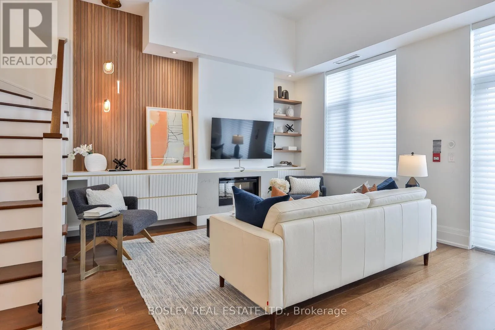 Cross Streets: Millwood & Southvale. ** Directions: Access via lobby. Welcome to The Upper House, a luxury townhouse in this boutique condo offering exquisite style & an abundance of space in family-friendly Leaside. This 2-storey home features 1462 SF of interior living plus a 275 SF terrace with BBQ gas line, for a total of 1737 SF. The open concept main floor impresses with soaring 12-ft smooth ceilings, custom Hunter Douglas remote controlled blinds and prefinished engineered hardwood flrs. A show-stopping, wall-to-wall custom entertainment unit anchors the living room, complete with bespoke cabinetry, pot lights, decorative wood paneling, and a contemporary fireplace with mantle & wall-mounted TV with statement light fixture. The dining area sits perfectly between the living room and terrace walk-out, making it ideal for dinners by the fireplace as well as enjoying abundant natural light while at breakfast. The modern chef's kitchen is outfitted with top-of-the-line appliances, including a paneled fridge, dishwasher, and paneled pantry offering functionality while maintaining symmetry. The main floor also includes a large den/office with a double-door closet, which can easily be converted to a third bedroom by adding a wall & glazed French door for privacy. Don't miss the powder rm on the main floor. The upper level enjoys an oversized family room with a 2nd wall-mounted TV (all tvs included) for family movie nights. The principal bedroom features a walk-out to a second outdoor space, his & hers closets and a spa-like ensuite with a glassed-in shower, soaker tub, and double sinks. The 4 PC bath serves the 2 bdrm and family rm. This fabulous offering includes parking and locker. Note this is a pet-friendly building complete with a pet-spa and no size restrictions for your fur babies. A rare opportunity to own a refined townhouse with exceptional design and superior quality finishes (refer to attached Features & Upgrades) in the heart of Leaside! In the top-tier Rolph Rd ES, Bessboroug Dr MS & Leaside High School district. (id:27476)