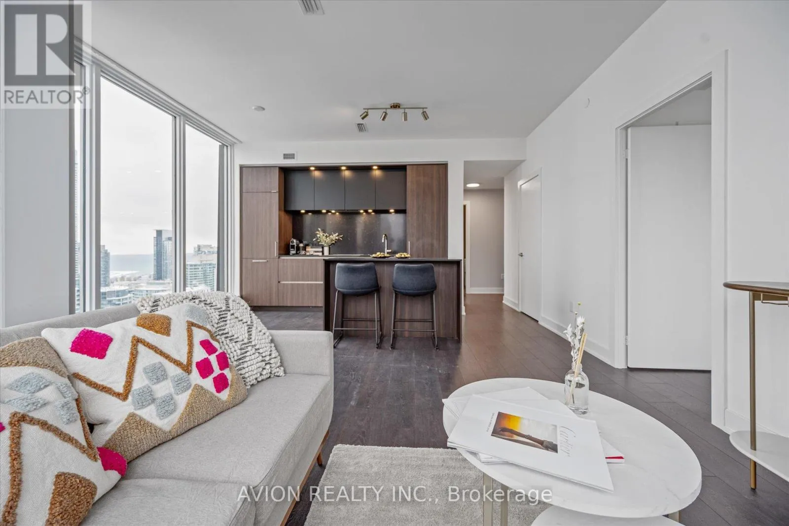 King St W/John St Spectacular high-floor corner suite with panoramic Lake Ontario, CN Tower & Rogers Centre views in Toronto's Entertainment District. This 2 Bed + Den, 2 Bath residence offers 862 sq ft plus a 28 sq ft balcony, featuring floor-to-ceiling windows that flood the home with natural light and breathtaking skyline and lake vistas. Modern open-concept kitchen with high-end built-in appliances and centre island, 9-ft ceilings, and a primary bedroom with ensuite. Located in a prestigious mixed-use building steps to Union Station, waterfront, transit, dining, theatres and sports venues - downtown living at its finest. (id:27476)