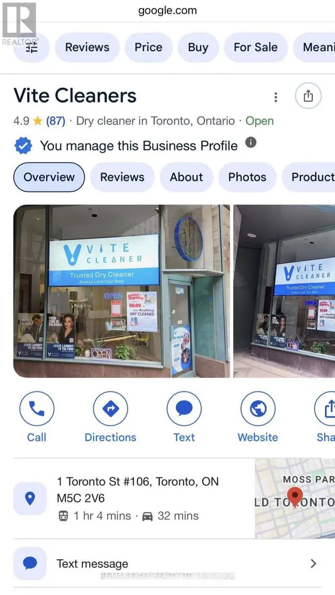 Cross Streets: KING ST / TORONTO ST. ** Directions: DIRECT. Upscale & Modern Style Dry cleaner in Central Downtown area surrounding by High end Office, High rise Condos and Hotel. State of art renovation and Automated self-pick up station. Business setup about 1 years and profitable by the second month + owner's salary. Turn-key business and no experience needed. Fully support by a central dry cleaner provider with daily pickup and drop off. Built-in changing room allows for alteration services. Another 2 years lease with option for 3 years renewal. Lowest rent in downtown prime area. Training is possible after closing. (id:27476)