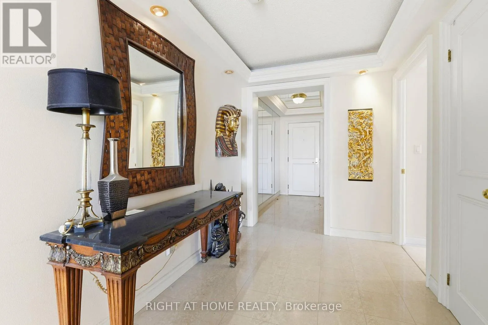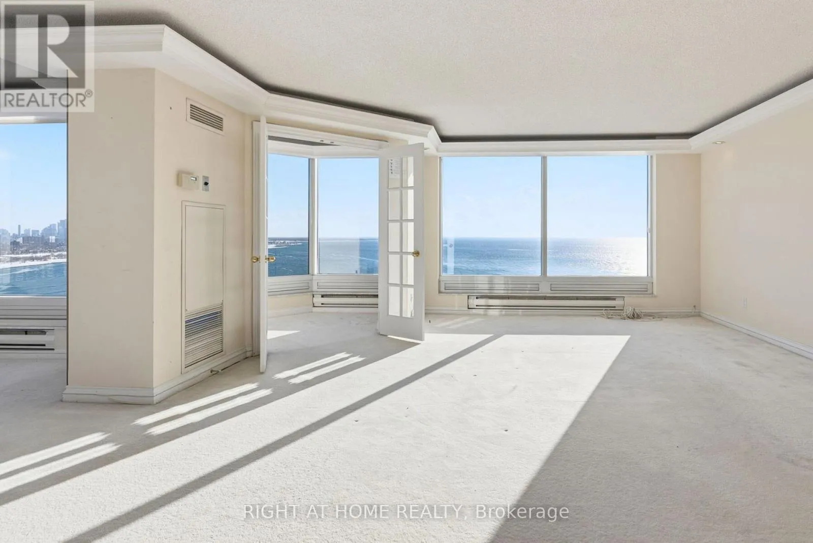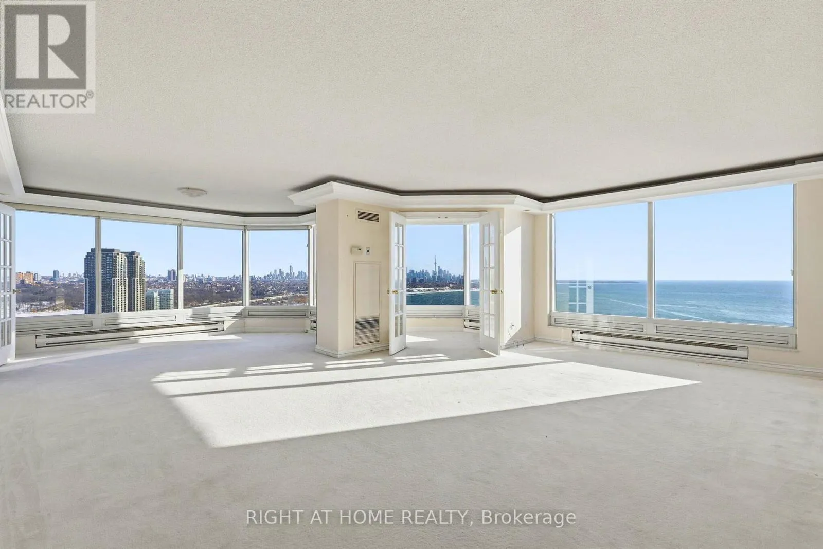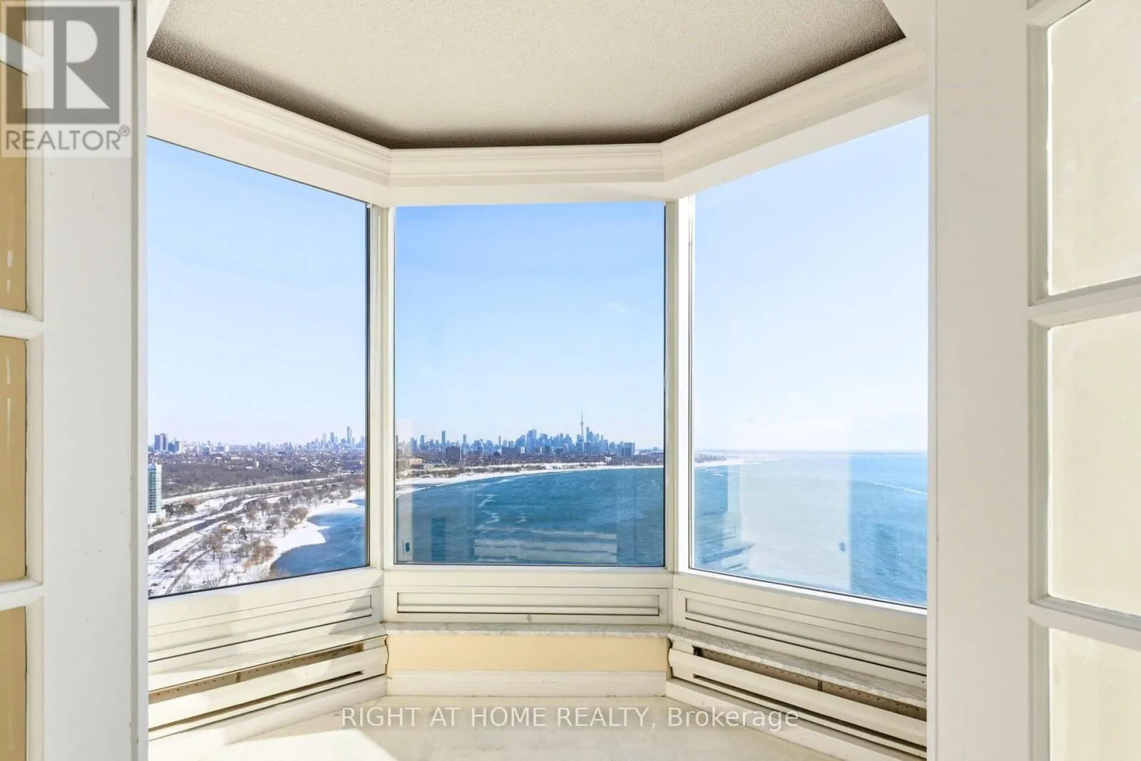 Lake Shore/Palace Pier Panoramic Lakefront Luxury, Three Views Wide - East, South, and West!A true Palace Place signature suite: 2,028 sq ft of refined space, a rare 2-bed/3-bath layout, 2 parking and 2 lockers, anchored by what many consider the best floor plan in the building. This is the kind of home that makes you stop mid-sentence. Wraparound picture windows frame unobstructed Lake Ontario from three directions: downtown + lake to the east, open water straight south, and lake + Mimico skyline to the west. Morning light, golden afternoons, and sunset glow -every day has a different mood. The living and dining areas are expansive and naturally elegant, finished with classic crown moulding and tray ceilings, and designed for both entertaining and quiet, private moments. A bright, view-filled kitchen with stone counters and an oversized island keeps the backdrop front and centre-water, sky, and city. The primary suite delivers the same wow factor, complemented by a generous ensuite where the lake becomes part of your morning routine. All of this, in a building known for service and lifestyle, valet, concierge, private shuttle, and resort-style amenities. (id:27476)