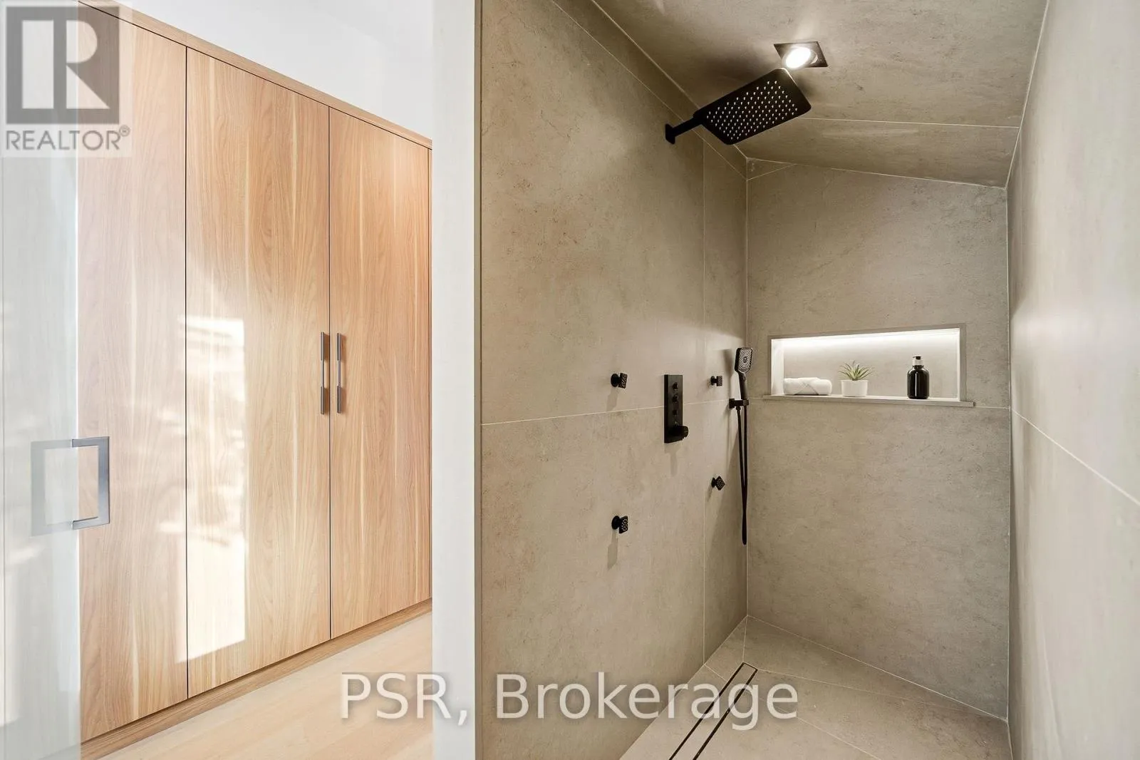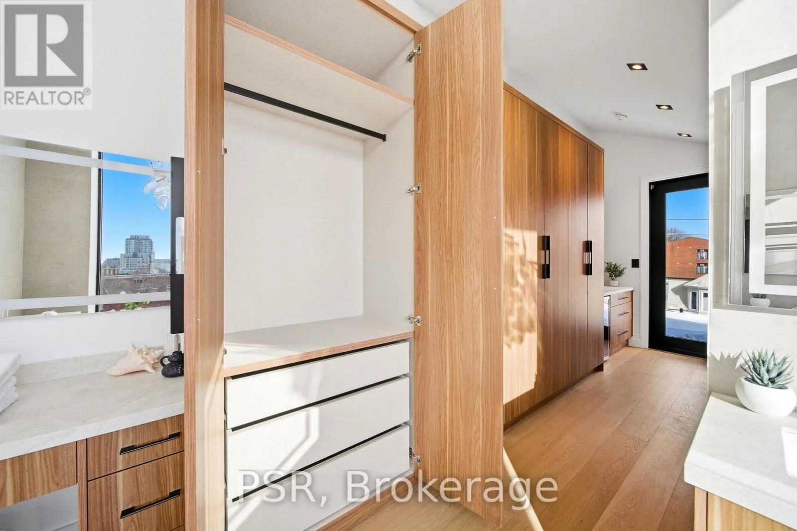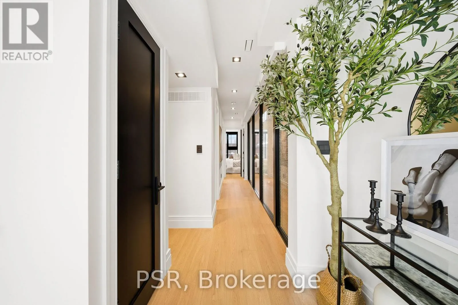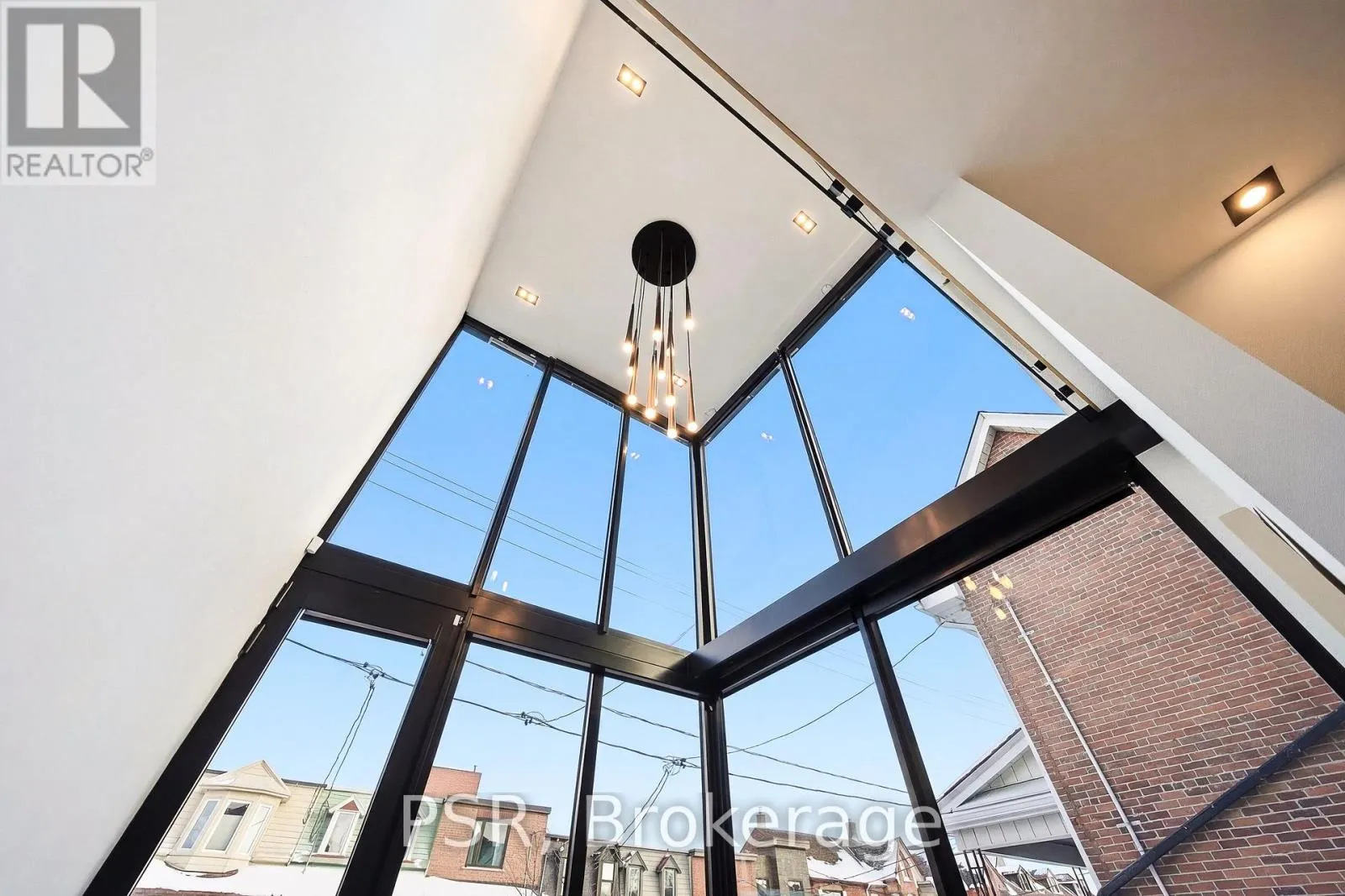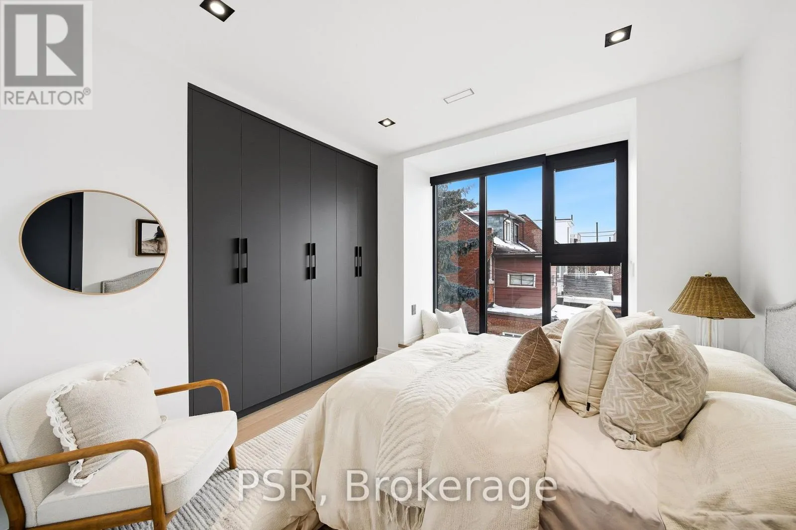 Dufferin St & Dundas St W Discover this brand new, custom-built modern home with striking architectural presence, showcasing soaring ceiling heights, walls of glass, and refined detailing throughout. The main level is anchored by an impressive double-height dining area defined by 19-foot ceilings and floor-to-ceiling window walls on two sides. With east and west exposures, natural light pours through the interior from morning to evening. The kitchen features extensive custom cabinetry, Taj Mahal-inspired porcelain stone surfaces, and a premium integrated appliance package. The adjacent living area features a striking three-sided glass fireplace. A convenient side entrance provides direct access to the kitchen and front closet, offering functional everyday entry into the home. The upper levels continue the home's emphasis on thoughtful design, offering well-proportioned bedroom spaces, custom closets, and beautifully finished bathrooms. The full-floor primary retreat occupies its own level, featuring 11.6-foot ceilings, and a spa-inspired ensuite with a freestanding tub, double vanity, and walk-in shower, along with extensive custom built-in storage and a built-in coffee bar with integrated beverage fridge, extending directly to a rooftop terrace with CN Tower views. The lower level offers impressive ceiling height and a highly functional layout, featuring vinyl flooring throughout, a laundry area with built-in cabinetry, an additional bedroom ideal for guests, a home office, or extended living space, and a three-piece bathroom. Additional features include white oak engineered flooring throughout the main and upper levels, Reynaers architectural aluminum windows and doors, automated window coverings, and curated designer lighting. Fully landscaped front and rear yards complete the property, featuring turf, and steel planters for a polished, low-maintenance outdoor experience. Ideally located in Toronto's west end, close to neighbourhood cafes, shops, transit, and everyday conveniences. (id:27476)
