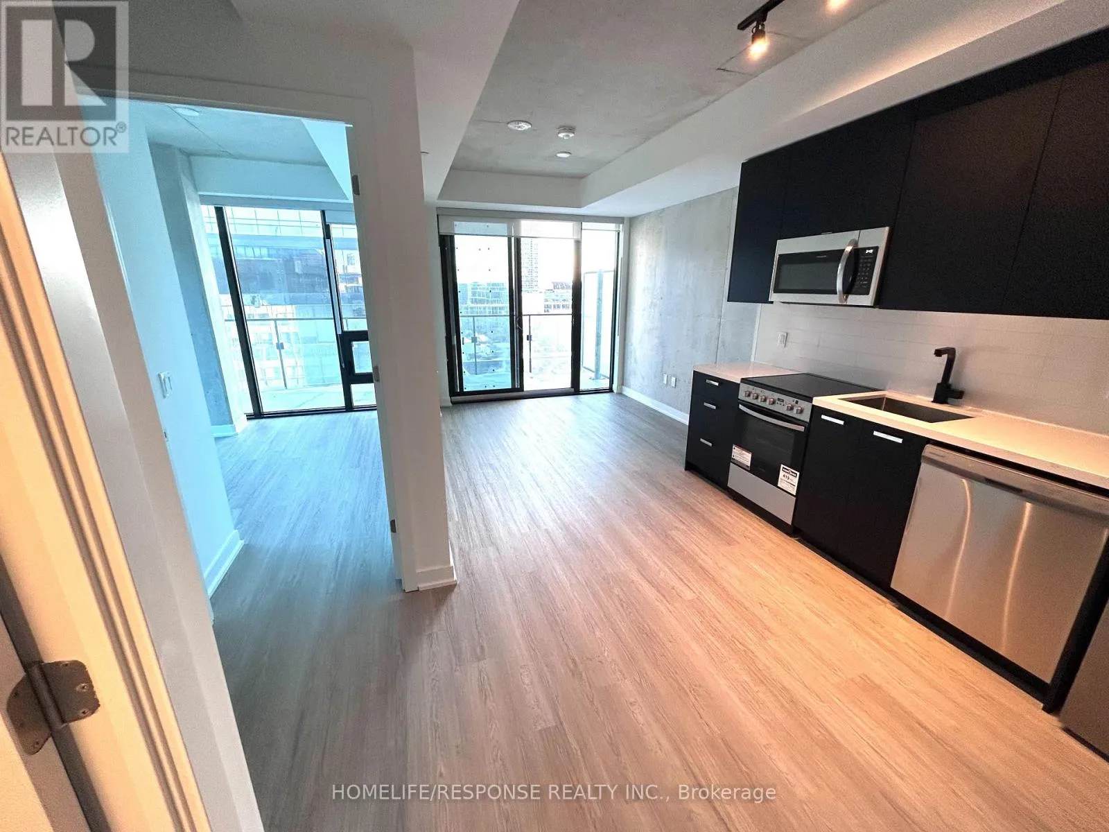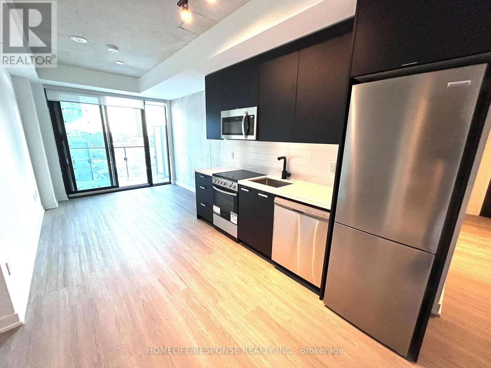 KING AND PARLIAMENT Brand new Bauhaus Condo 1 Bedroom + Den, thoughtfully designed for modern urban living. Enjoy a great, unobstructed panoramic view. Bright and airy with extra wide windows, professionally installed blinds, and wood flooring throughout. The open concept layout includes a versatile den ideal for a home office, a spacious living area, and a walkout to a private balcony for relaxing or entertaining. The modern kitchen features stainless steel appliances, quartz counter tops, and sleek cabinetry, while in-suite laundry adds everyday convenience. Residents enjoy 24 hour concierge service and premium amenities including a fitness center, party room, lounge, and outdoor terrace with a children's play area. Located in the heart of the King East/St. Lawrence Market Neighbourhood, steps to TTC, the Financial District, dining, shopping, cafes and universities, with a exceptional Walk and Transit Score of 99. Tenant to pay Hydro, and Heat Pump rental separately. (id:27476)