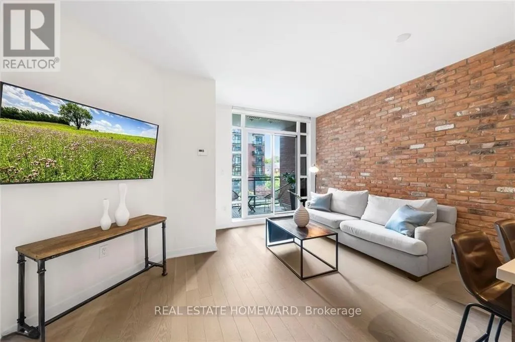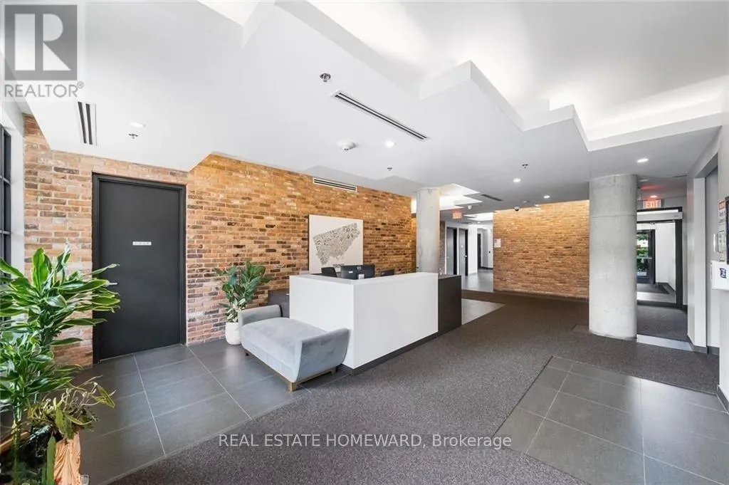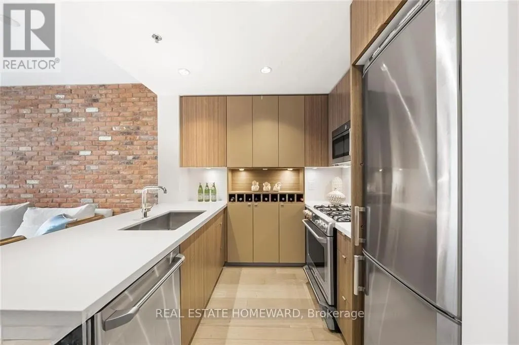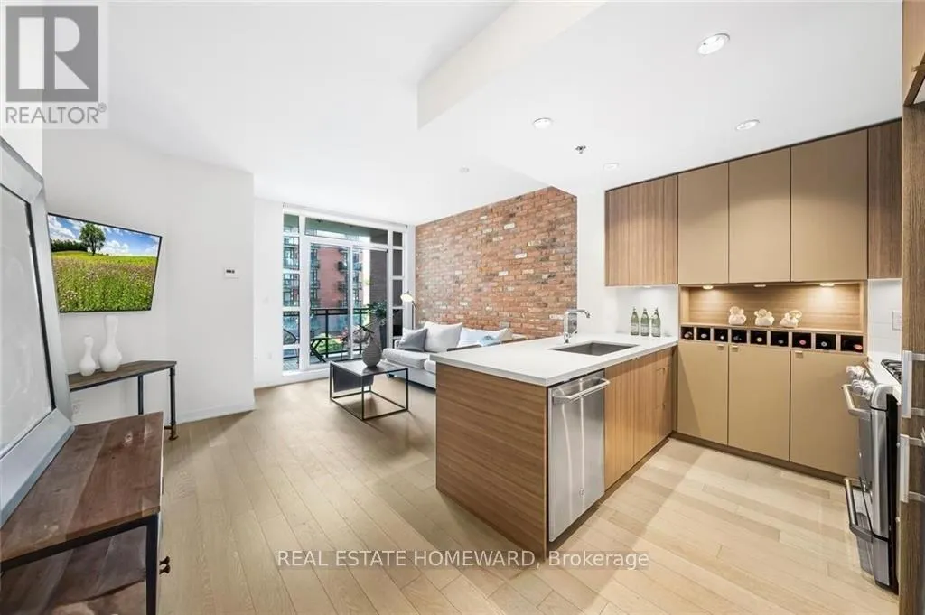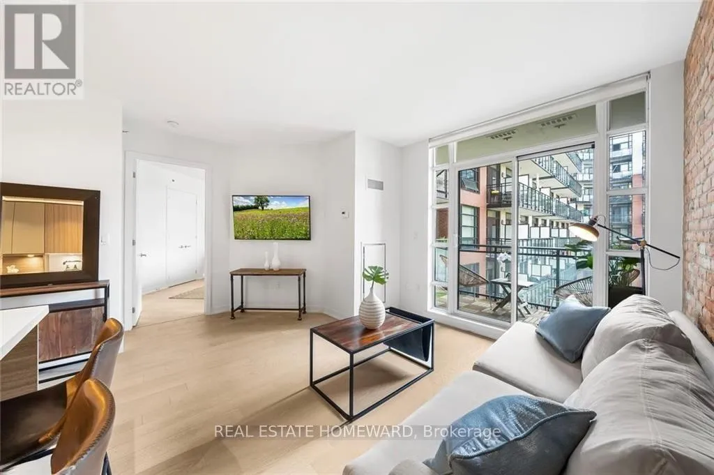 Queen & Carlaw Set in the heart of Leslieville, Showcase Lofts puts you right where you want to be-steps to Queen Street East, local coffee spots, indie shops, neighbourhood favourites, and easy TTC access. Whether you're heading downtown or out of the city, the DVP and Gardiner are close at hand.This one-bedroom condo offers 635 sq. ft. of smart, well-finished living space with a 40 sq. ft. balcony. The open layout features a reclaimed-brick accent wall, floor-to-ceiling windows, high ceilings, wide-plank hardwood floors, and a balcony overlooking the courtyard-perfect for a quiet coffee or evening wind-down.The kitchen blends style and function with woodgrain cabinetry, under-cabinet lighting, quartz countertops, built-in wine storage, an island with seating, pot lights, and stainless steel appliances. In-suite laundry with a stacked washer and dryer keeps things easy.The bedroom is spacious, with a walk-in closet and its own walkout to the balcony. The four-piece bathroom is clean and modern, finished with quartz counters and a deep soaker tub with shower.One parking space and one locker are included for ultimate convenience. Residents also have access to concierge service, a fully equipped gym, media and party rooms, guest suites, and a ground-level patio. (id:27476)