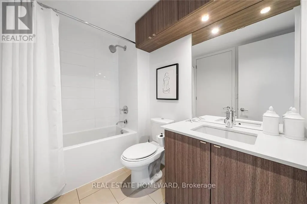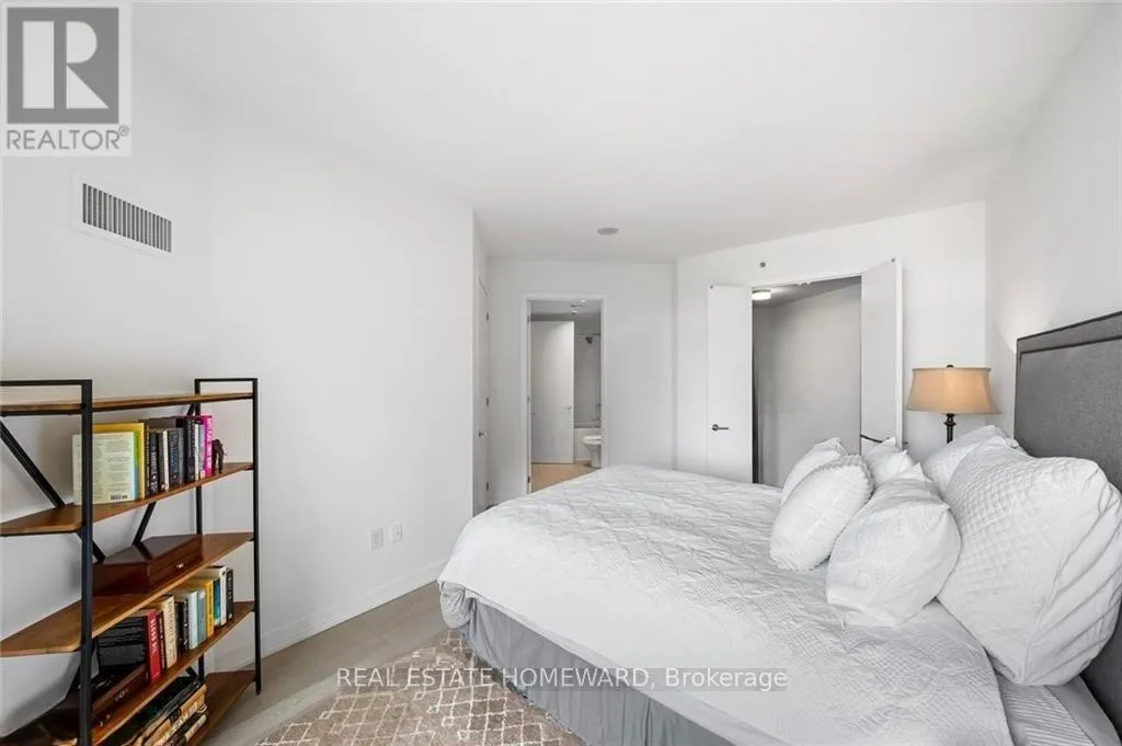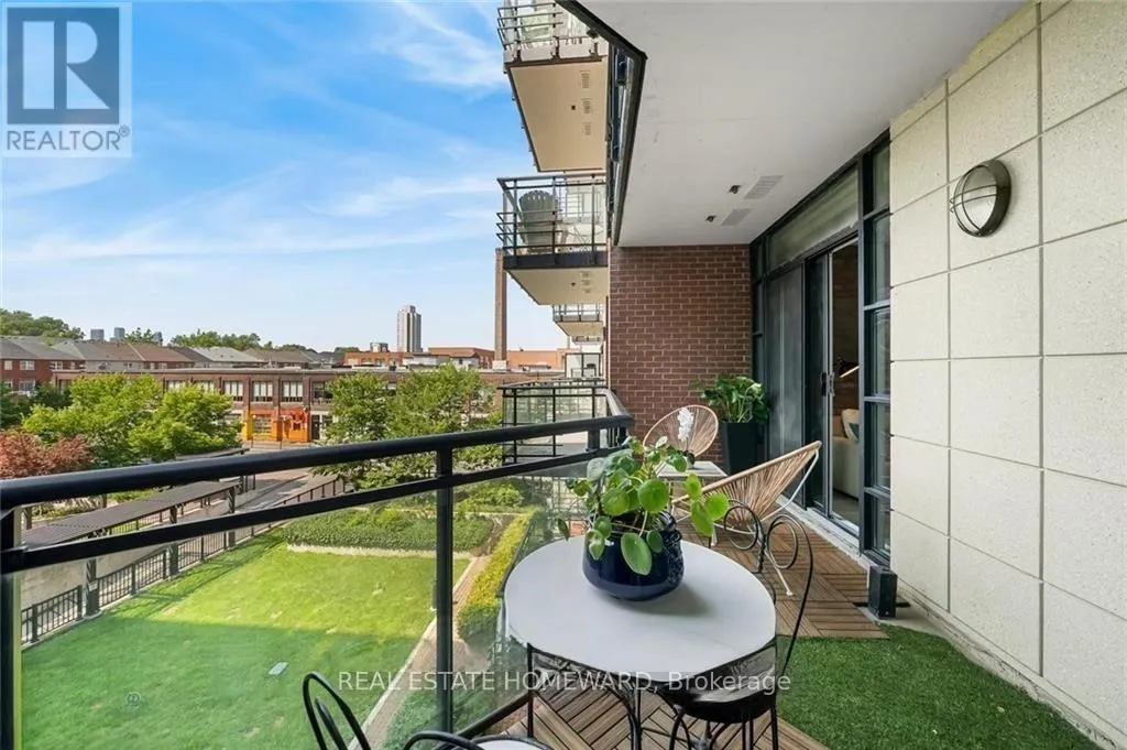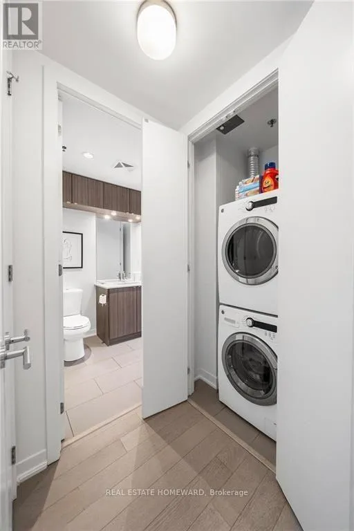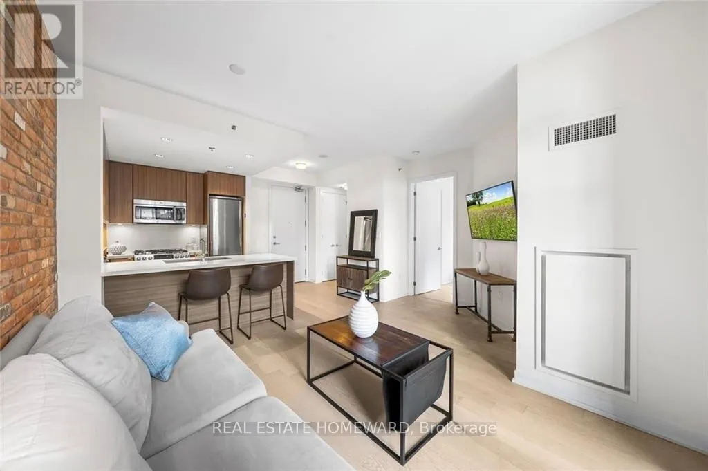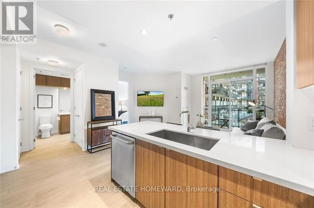 Queen & Carlaw Set in the heart of Leslieville, Showcase Lofts puts you right where you want to be-steps to Queen Street East, local coffee spots, indie shops, neighbourhood favourites, and easy TTC access. Whether you're heading downtown or out of the city, the DVP and Gardiner are close at hand.This one-bedroom condo offers 635 sq. ft. of smart, well-finished living space with a 40 sq. ft. balcony. The open layout features a reclaimed-brick accent wall, floor-to-ceiling windows, high ceilings, wide-plank hardwood floors, and a balcony overlooking the courtyard-perfect for a quiet coffee or evening wind-down.The kitchen blends style and function with woodgrain cabinetry, under-cabinet lighting, quartz countertops, built-in wine storage, an island with seating, pot lights, and stainless steel appliances. In-suite laundry with a stacked washer and dryer keeps things easy.The bedroom is spacious, with a walk-in closet and its own walkout to the balcony. The four-piece bathroom is clean and modern, finished with quartz counters and a deep soaker tub with shower.One parking space and one locker are included for ultimate convenience. Residents also have access to concierge service, a fully equipped gym, media and party rooms, guest suites, and a ground-level patio. (id:27476)