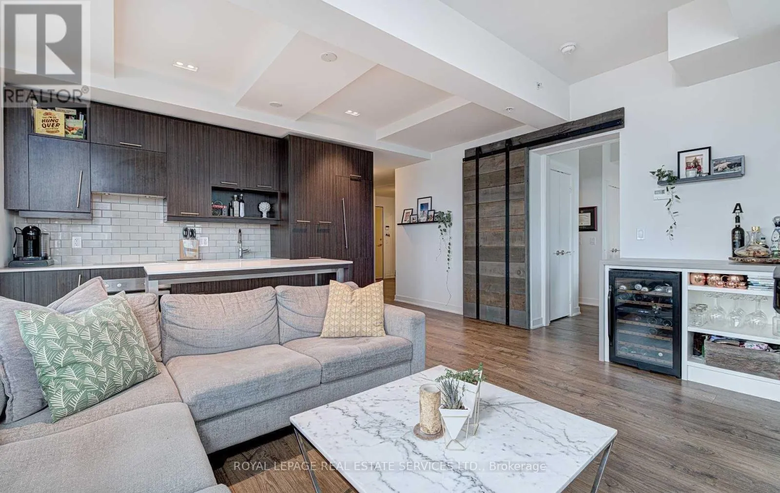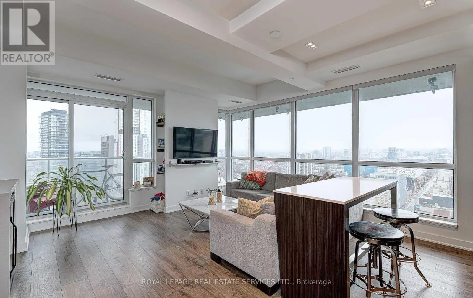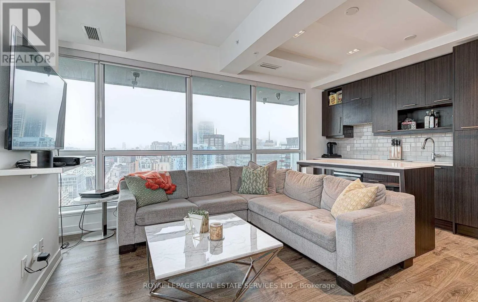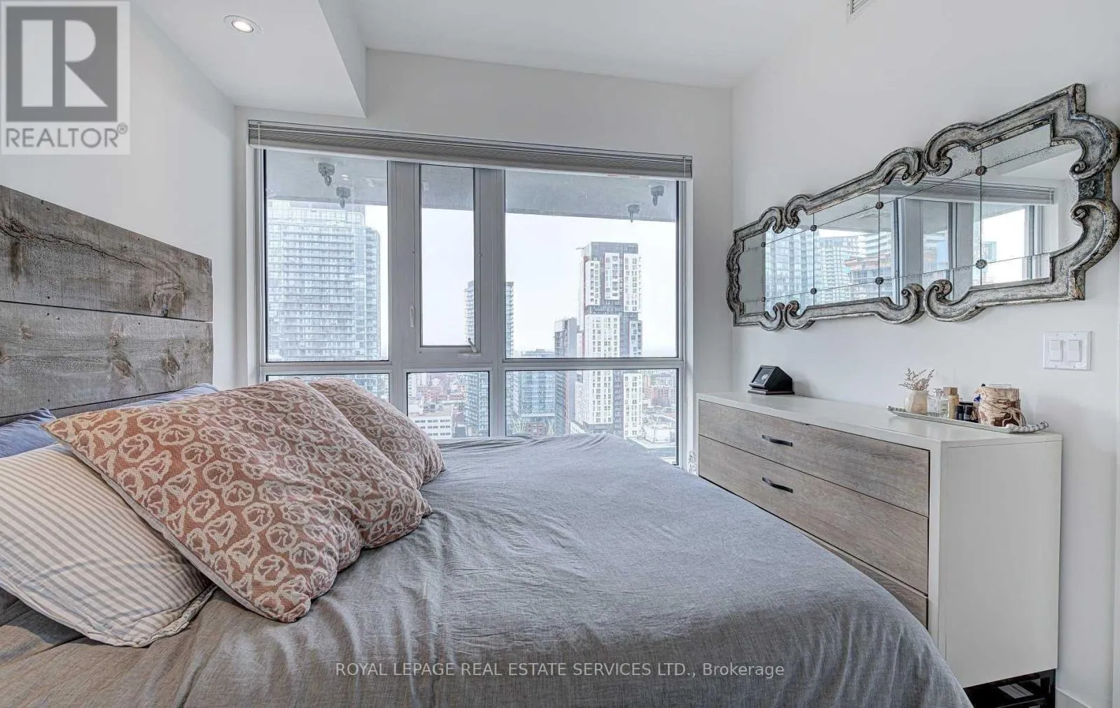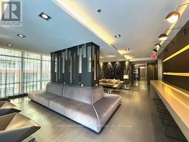 Richmond & University Studio 2 at Prime Location in the Heart of the Financial & Entertainment District. Immaculate **corner unit** with floor-to-ceiling windows and a rare high-end upgrades throughout. This thoughtfully designed 1 bedroom plus den offers excellent functionality, including a Murphy bed in the den, ideal for guests or a flexible work-from-home setup. Features include solid wood barn doors to the primary bedroom and semi-ensuite 3-piece bath, a built-in bar cabinet, custom TV feature wall with shelving, and custom closet organizers. The dining area showcases a waffle ceiling with pot lights, complemented by a custom center island. Walk out to a private balcony with unobstructed city views. The modern kitchen is equipped with premium Miele appliances, and the unit includes a full-size washer and dryer. Prime parking and locker are conveniently located just steps from the elevator. Building Amenities at Studio 2 include: Rooftop deck and outdoor lounge spaces; Fitness center and yoga studio; Party, media, and games rooms; Sauna; Outdoor BBQ areas and hot tub; Guest suites and bike storage; 24/7 concierge and security. This condo set on a quiet street while offering immediate access to dining, entertainment, transit, and financial core conveniences. A rare opportunity to live in a truly upgraded suite in one of downtown's most desirable locations. (id:27476)