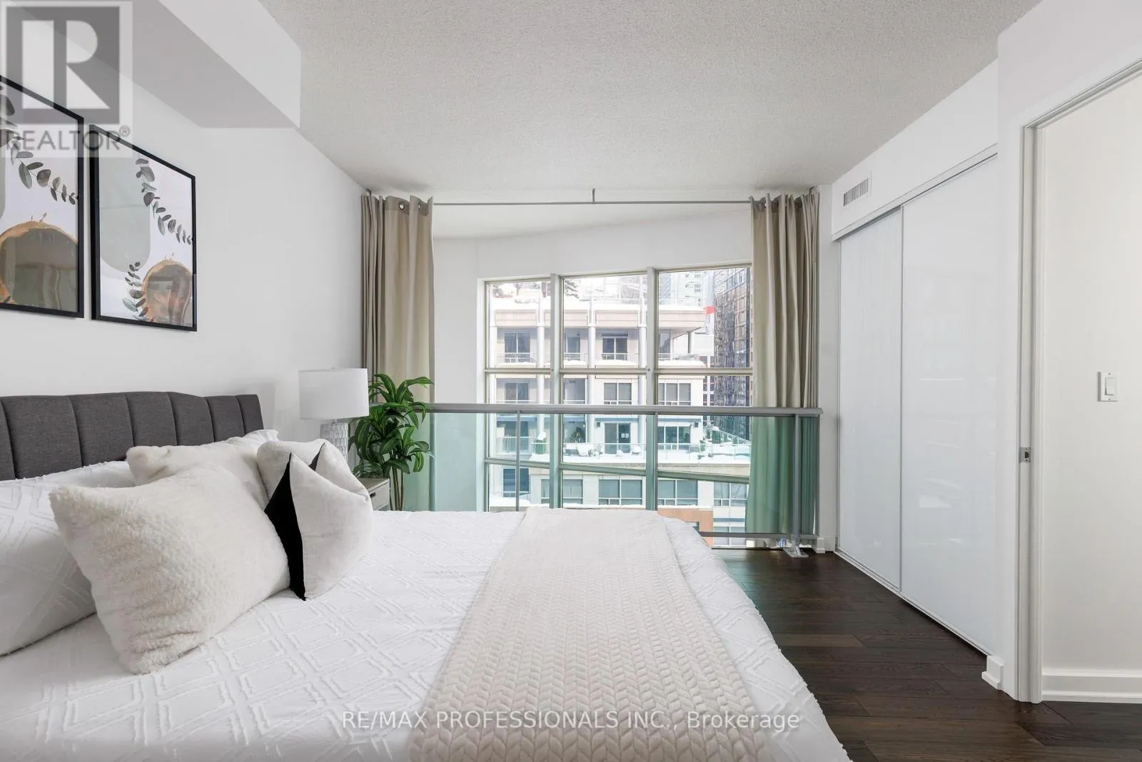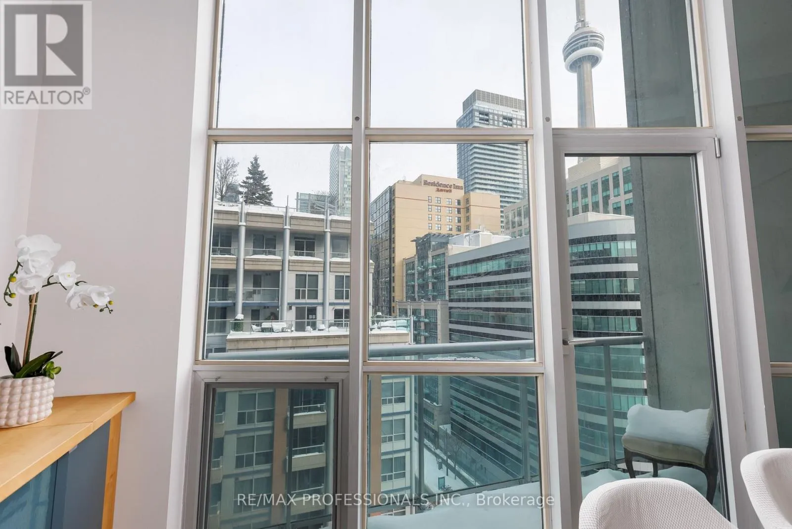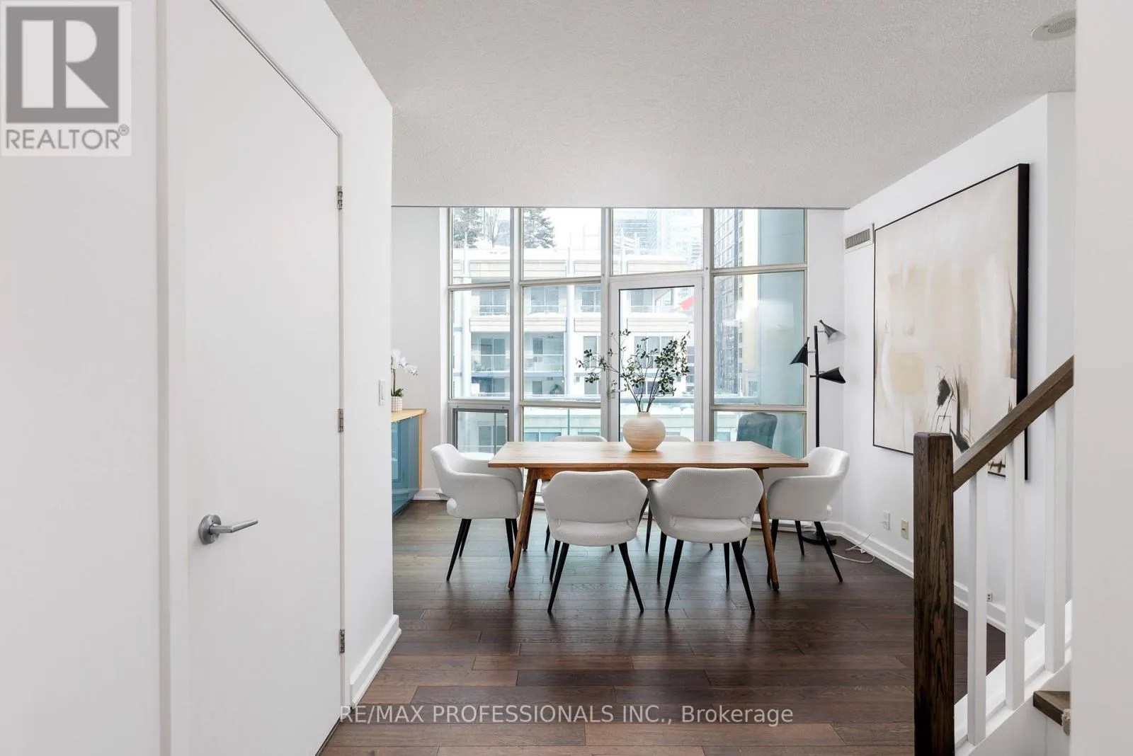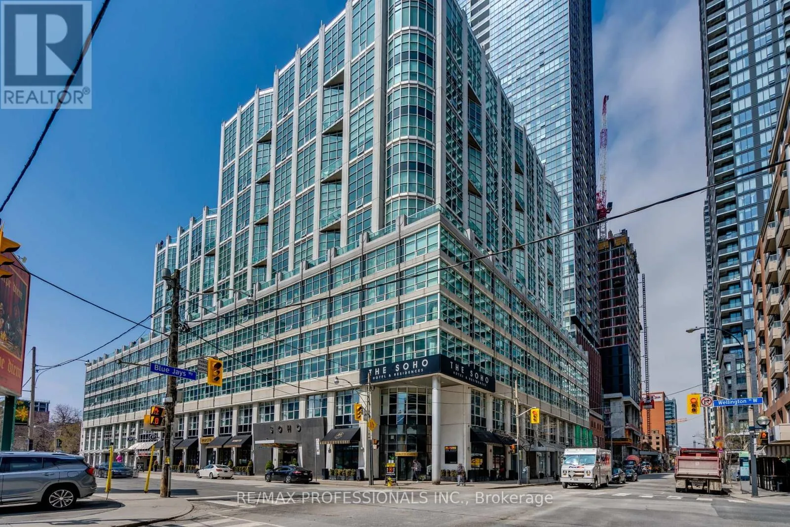 Blue Jays Way and Wellington Welcome to the iconic SoHo Metropolitan Residences, where five-star hotel living meets sophisticated downtown luxury. This stunning two-storey, loft-style corner residence offers over 1,300 sq ft of thoughtfully designed living space, highlighted by expansive floor-to ceiling windows that flood the home with natural light. Southeast exposure from every room showcases breathtaking city views, while warm-toned engineered hardwood flooring and generously proportioned principal rooms create an inviting yet refined atmosphere. The main level is perfectly suited for both everyday living and elegant entertaining, featuring a spacious kitchen with full-size stainless steel appliances, quartz countertops, and custom built-in cabinetry providing exceptional storage. A separate dining area comfortably accommodates hosting, with seamless access to the balcony, an ideal setting for morning coffee or evening relaxation overlooking the city. Upstairs, the serene primary retreat easily accommodates a king-size bed and features custom-built-in cabinetry and a private ensuite. The versatile second bedroom, also with its own ensuite, functions beautifully as a guest suite, home office, or additional living space. Residents enjoy exclusive access to SoHo Metropolitan renowned hotel-style amenities, including a fully equipped fitness center with towel service, indoor pool, sauna and steam rooms, rooftop terrace with BBQs and fire pits, 24-hour concierge. Ideally located in the heart of Toronto's Entertainment District, you are steps to world-class dining, theatres, nightlife, Rogers Centre, CN Tower, TIFF, transit, and the Financial District. With near-perfect walk and transit scores, this is downtown living at its most effortless and refined. One owned parking spot adds to the overall convenience of this property (id:27476)