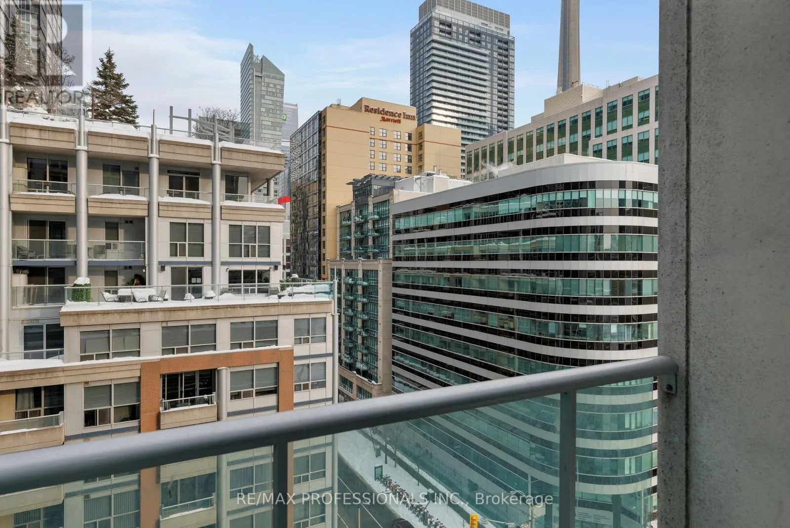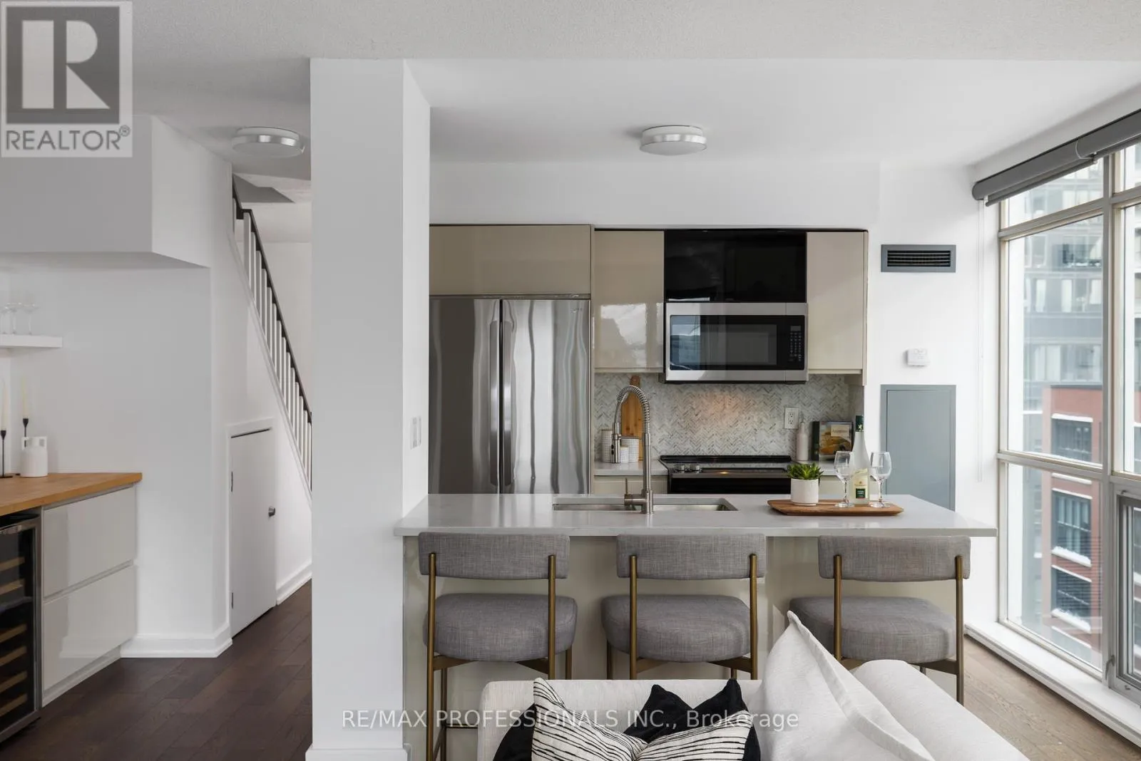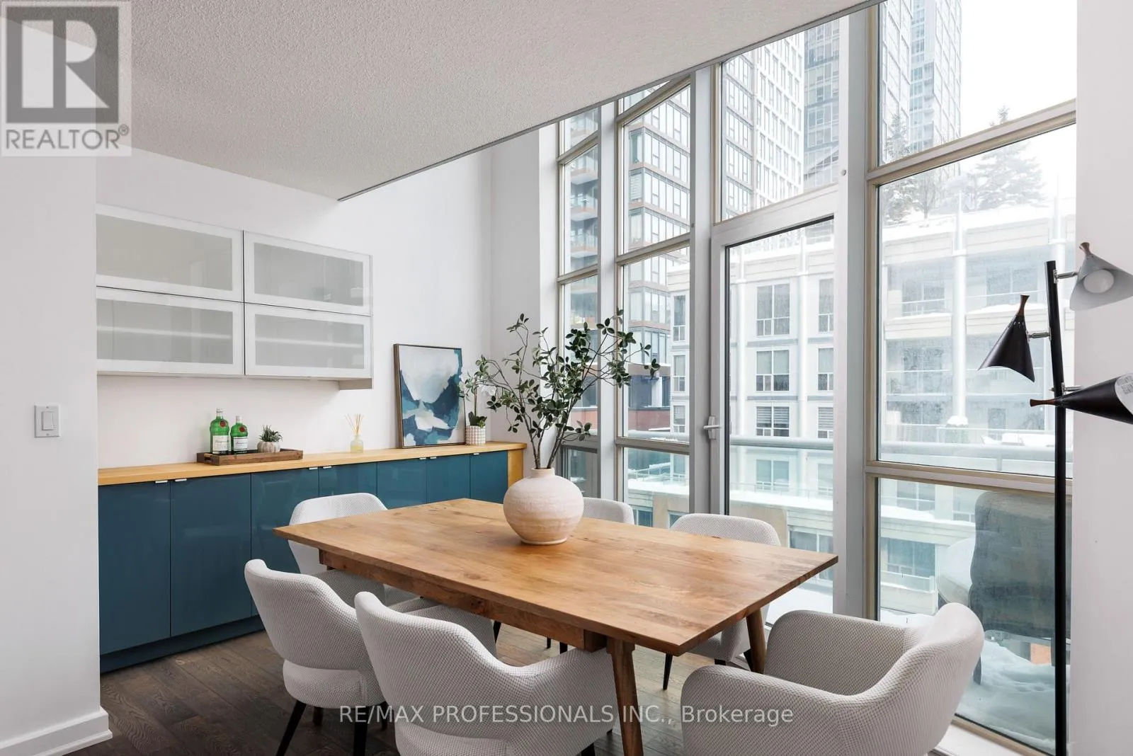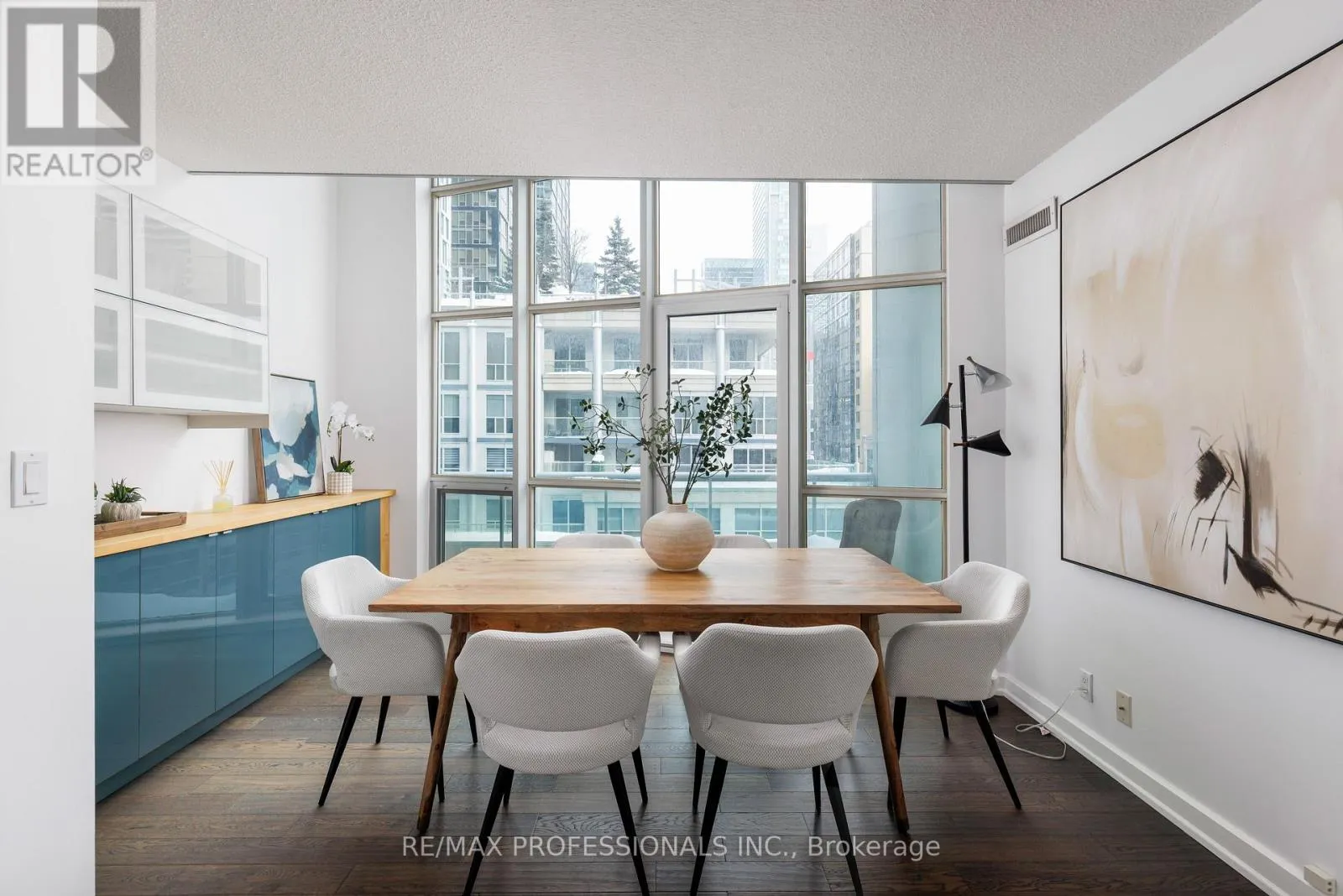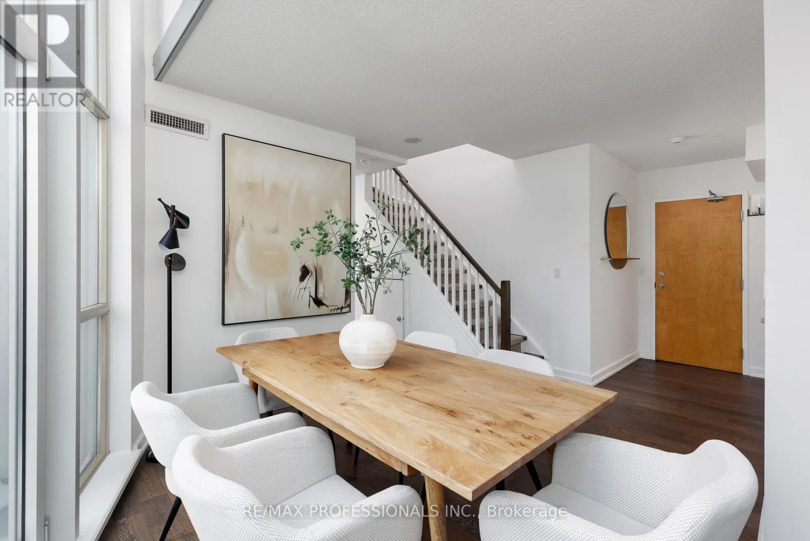 Blue Jays Way and Wellington Welcome to the iconic SoHo Metropolitan Residences, where five-star hotel living meets sophisticated downtown luxury. This stunning two-storey, loft-style corner residence offers over 1,300 sq ft of thoughtfully designed living space, highlighted by expansive floor-to ceiling windows that flood the home with natural light. Southeast exposure from every room showcases breathtaking city views, while warm-toned engineered hardwood flooring and generously proportioned principal rooms create an inviting yet refined atmosphere. The main level is perfectly suited for both everyday living and elegant entertaining, featuring a spacious kitchen with full-size stainless steel appliances, quartz countertops, and custom built-in cabinetry providing exceptional storage. A separate dining area comfortably accommodates hosting, with seamless access to the balcony, an ideal setting for morning coffee or evening relaxation overlooking the city. Upstairs, the serene primary retreat easily accommodates a king-size bed and features custom-built-in cabinetry and a private ensuite. The versatile second bedroom, also with its own ensuite, functions beautifully as a guest suite, home office, or additional living space. Residents enjoy exclusive access to SoHo Metropolitan renowned hotel-style amenities, including a fully equipped fitness center with towel service, indoor pool, sauna and steam rooms, rooftop terrace with BBQs and fire pits, 24-hour concierge. Ideally located in the heart of Toronto's Entertainment District, you are steps to world-class dining, theatres, nightlife, Rogers Centre, CN Tower, TIFF, transit, and the Financial District. With near-perfect walk and transit scores, this is downtown living at its most effortless and refined. One owned parking spot adds to the overall convenience of this property (id:27476)