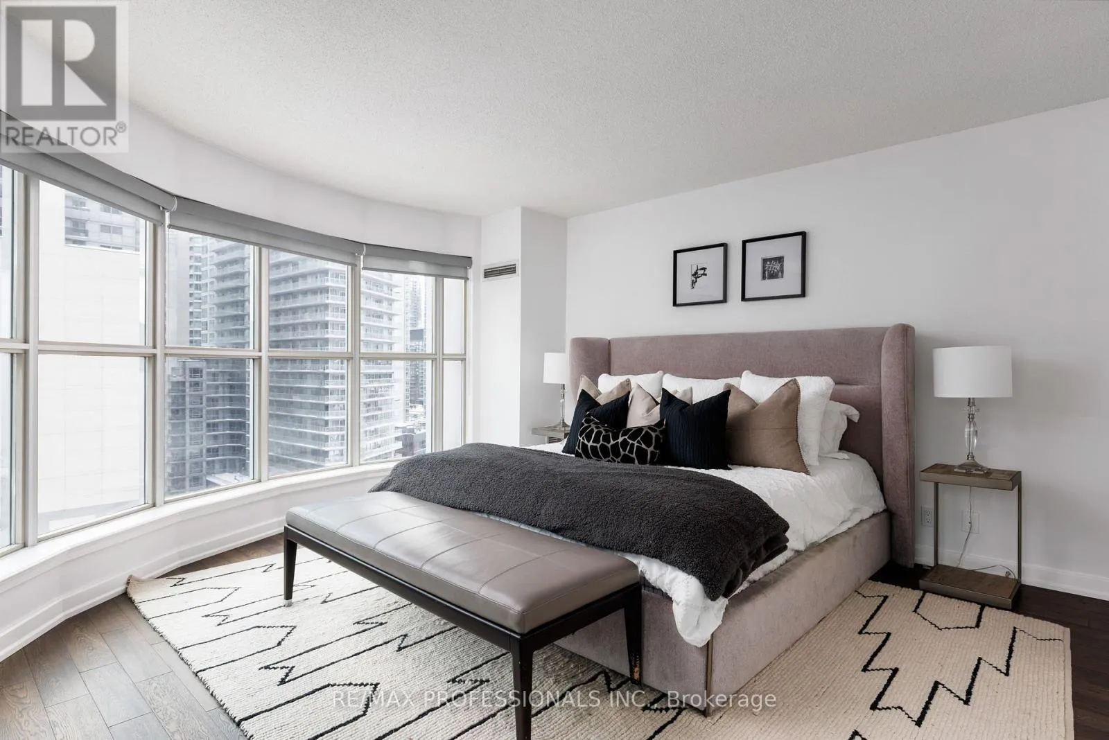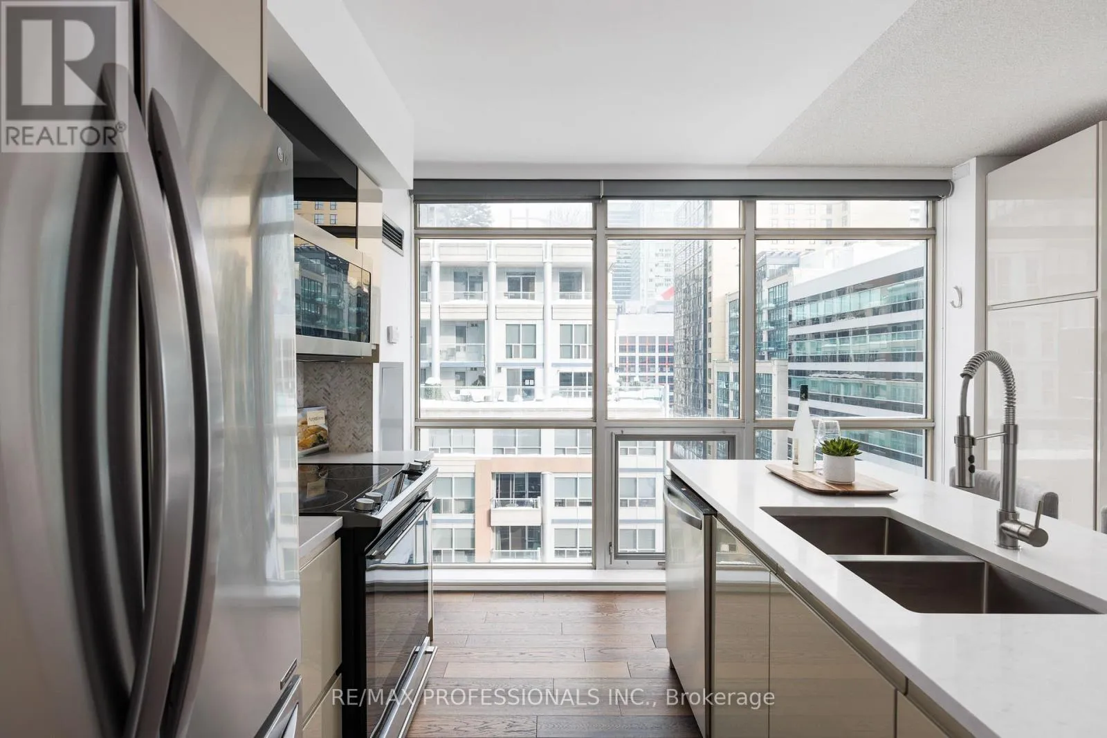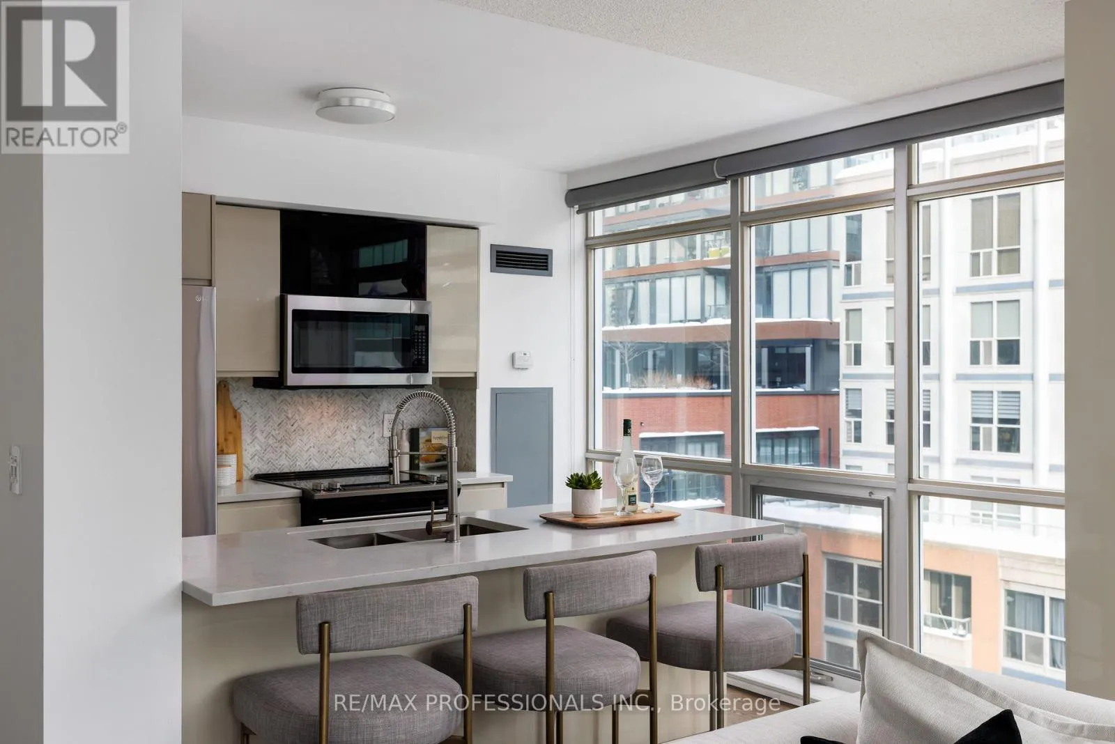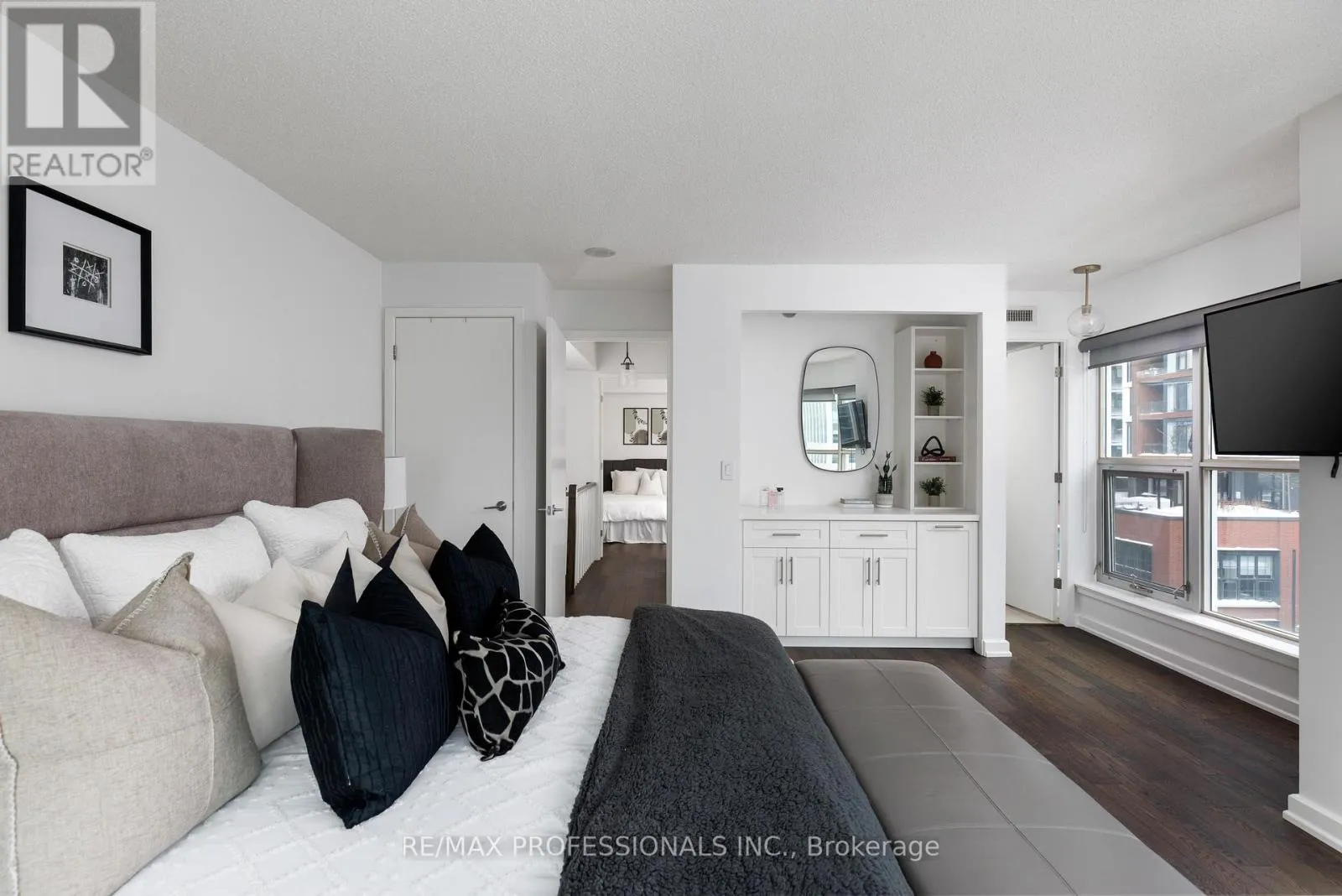 Blue Jays Way and Wellington Welcome to the iconic SoHo Metropolitan Residences, where five-star hotel living meets sophisticated downtown luxury. This stunning two-storey, loft-style corner residence offers over 1,300 sq ft of thoughtfully designed living space, highlighted by expansive floor-to ceiling windows that flood the home with natural light. Southeast exposure from every room showcases breathtaking city views, while warm-toned engineered hardwood flooring and generously proportioned principal rooms create an inviting yet refined atmosphere. The main level is perfectly suited for both everyday living and elegant entertaining, featuring a spacious kitchen with full-size stainless steel appliances, quartz countertops, and custom built-in cabinetry providing exceptional storage. A separate dining area comfortably accommodates hosting, with seamless access to the balcony, an ideal setting for morning coffee or evening relaxation overlooking the city. Upstairs, the serene primary retreat easily accommodates a king-size bed and features custom-built-in cabinetry and a private ensuite. The versatile second bedroom, also with its own ensuite, functions beautifully as a guest suite, home office, or additional living space. Residents enjoy exclusive access to SoHo Metropolitan renowned hotel-style amenities, including a fully equipped fitness center with towel service, indoor pool, sauna and steam rooms, rooftop terrace with BBQs and fire pits, 24-hour concierge. Ideally located in the heart of Toronto's Entertainment District, you are steps to world-class dining, theatres, nightlife, Rogers Centre, CN Tower, TIFF, transit, and the Financial District. With near-perfect walk and transit scores, this is downtown living at its most effortless and refined. One owned parking spot adds to the overall convenience of this property (id:27476)