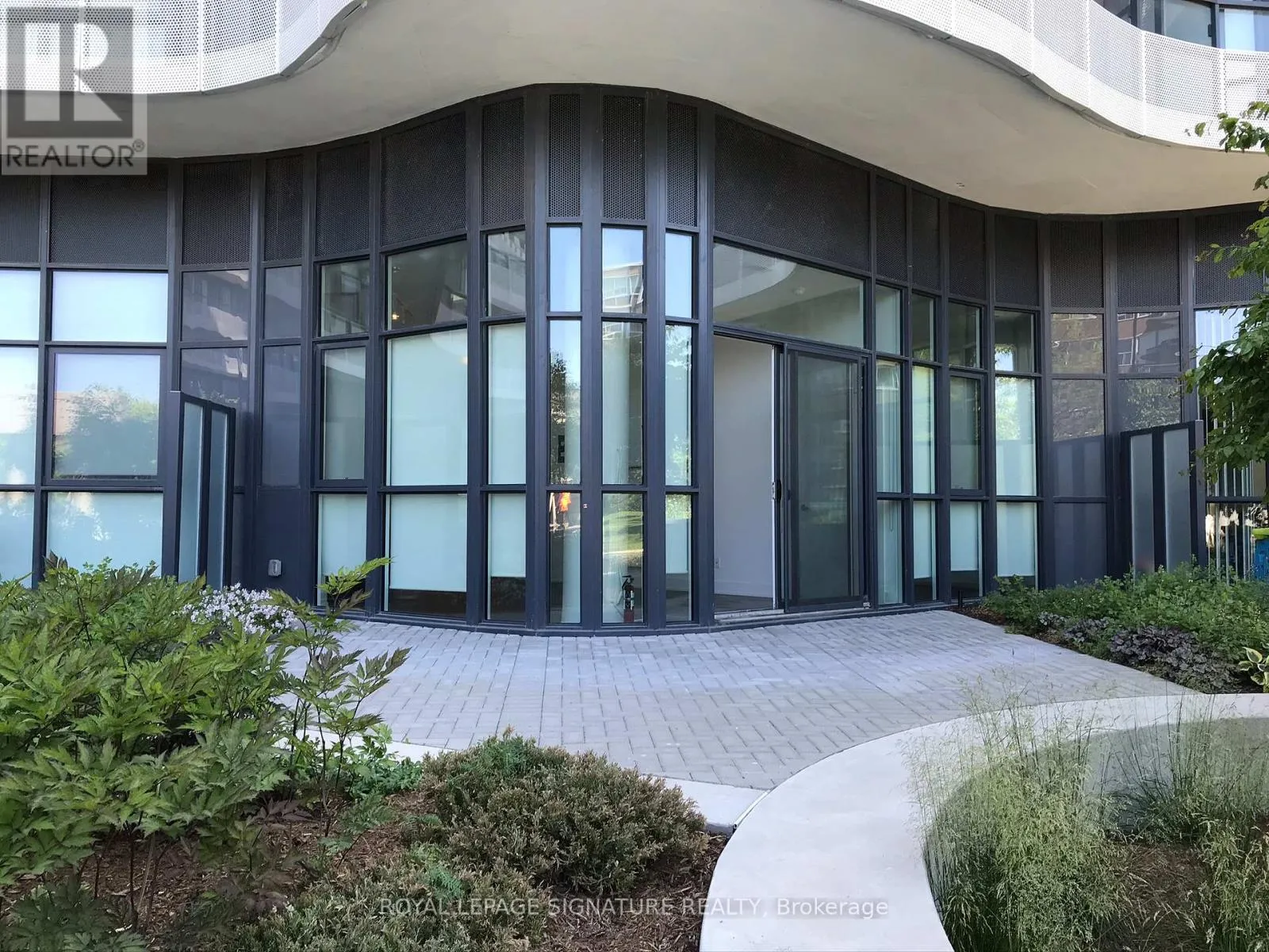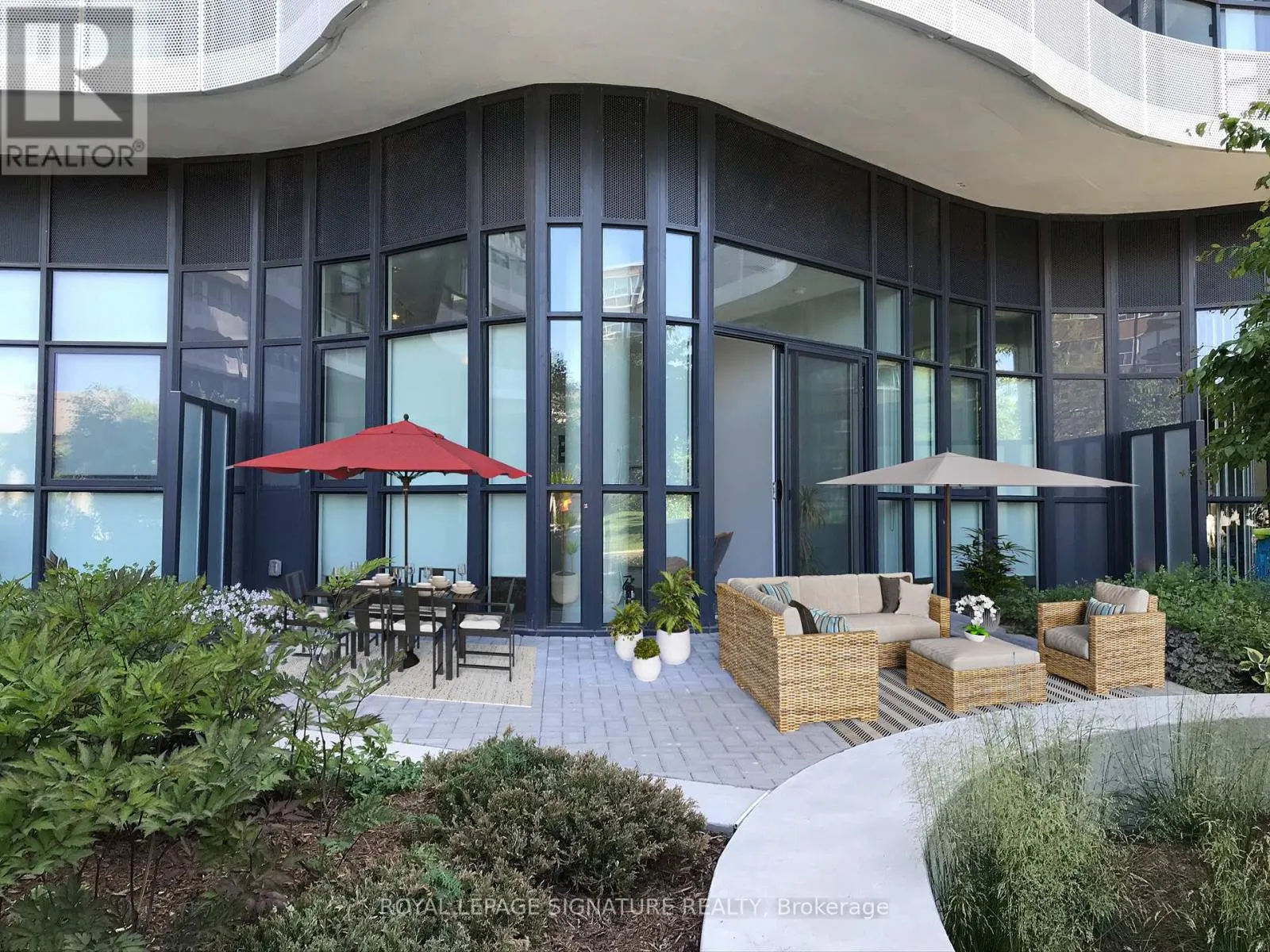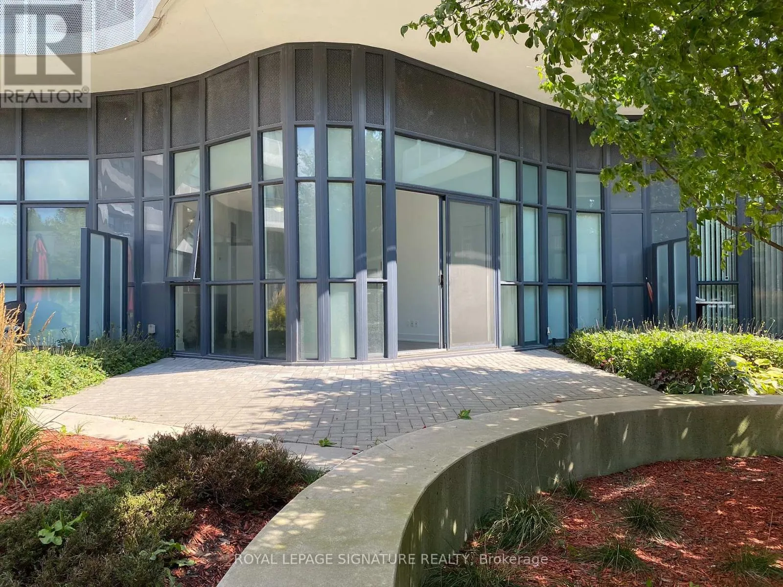 Cross Streets: Don Mills-Lawrence. ** Directions: By The Shops of Don Mills. Beautiful, bright unit on first floor, extra high ceilings, floor-to-ceiling windows, laminate floors. Good-size 1 bdrm, double mirror closets. Office nook. Rare x-large 168s.f. private patio. Wonderful unique home, step out to your own large patio, trees & manicured lawns. Freedom from elevators! Dog-owners, runners, cyclists can just step out and go! Beautiful building with gym, impressive roof-top patio with BBQs & loungers, theatre, party room, dog wash, visitor parking, 24hr concierge & security. Prime location at Shops of Don Mills with restaurants, shops, grocery stores, VIP Theater, Center Square. Bus stop at door, quick access to highways DVP/404, 401 and downtown. Includes 1 Locker, 1 Parking (id:27476)