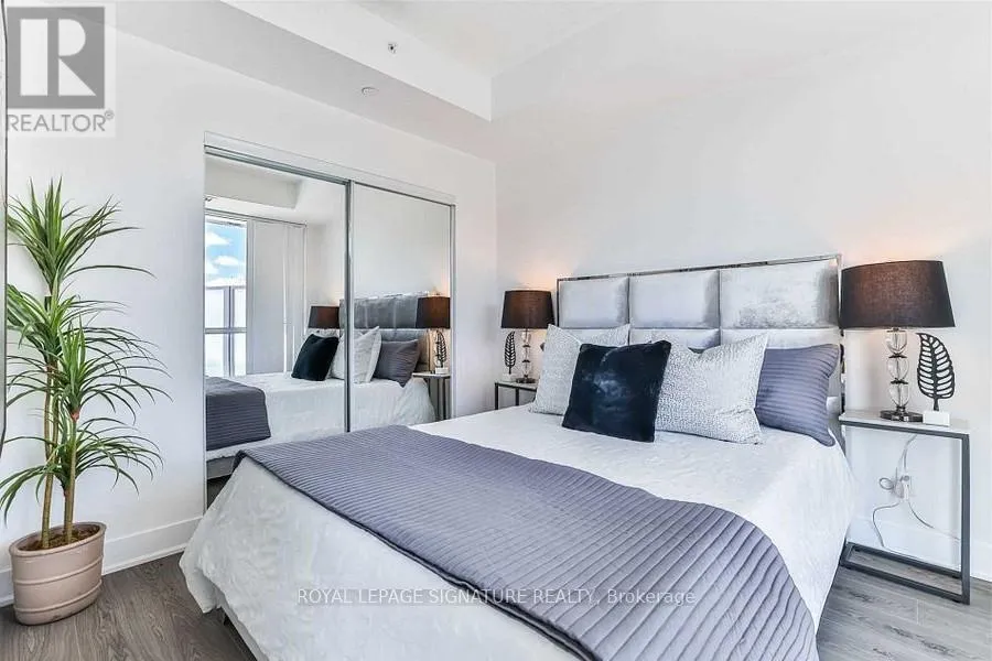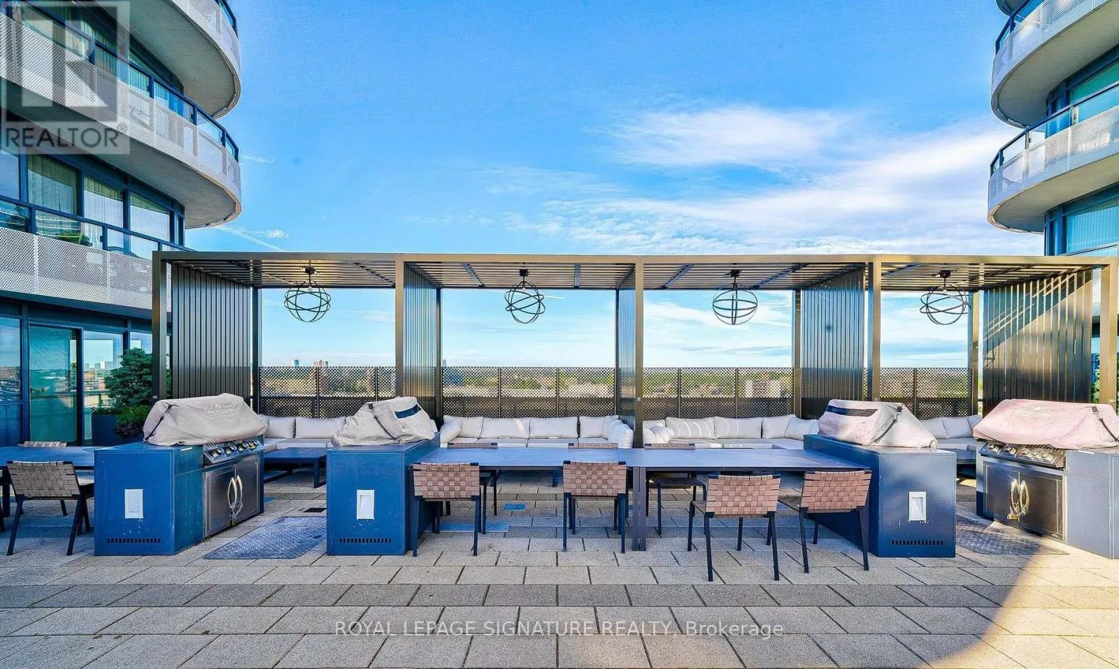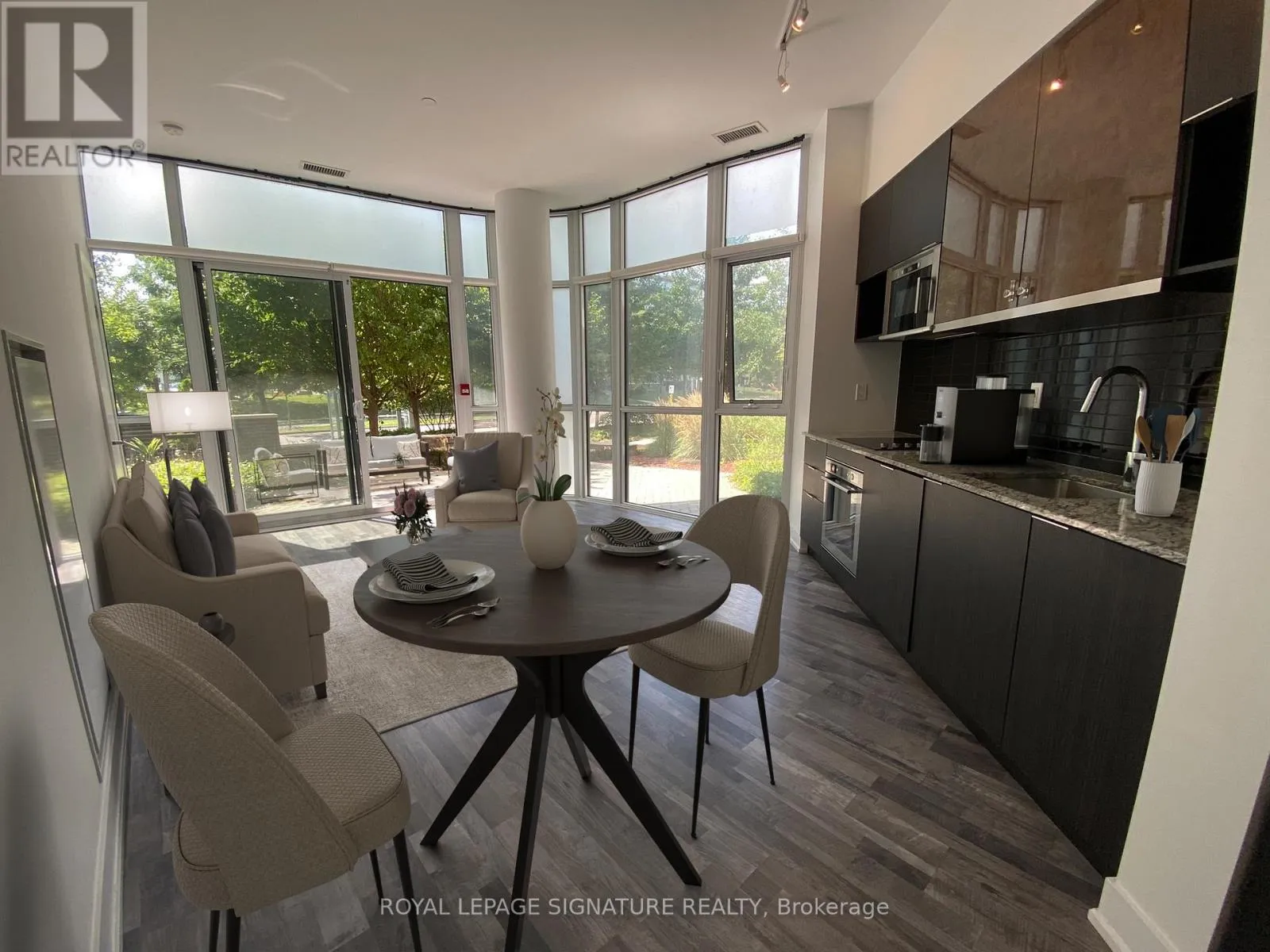 Cross Streets: Don Mills-Lawrence. ** Directions: By The Shops of Don Mills. Beautiful, bright unit on first floor, extra high ceilings, floor-to-ceiling windows, laminate floors. Good-size 1 bdrm, double mirror closets. Office nook. Rare x-large 168s.f. private patio. Wonderful unique home, step out to your own large patio, trees & manicured lawns. Freedom from elevators! Dog-owners, runners, cyclists can just step out and go! Beautiful building with gym, impressive roof-top patio with BBQs & loungers, theatre, party room, dog wash, visitor parking, 24hr concierge & security. Prime location at Shops of Don Mills with restaurants, shops, grocery stores, VIP Theater, Center Square. Bus stop at door, quick access to highways DVP/404, 401 and downtown. Includes 1 Locker, 1 Parking (id:27476)