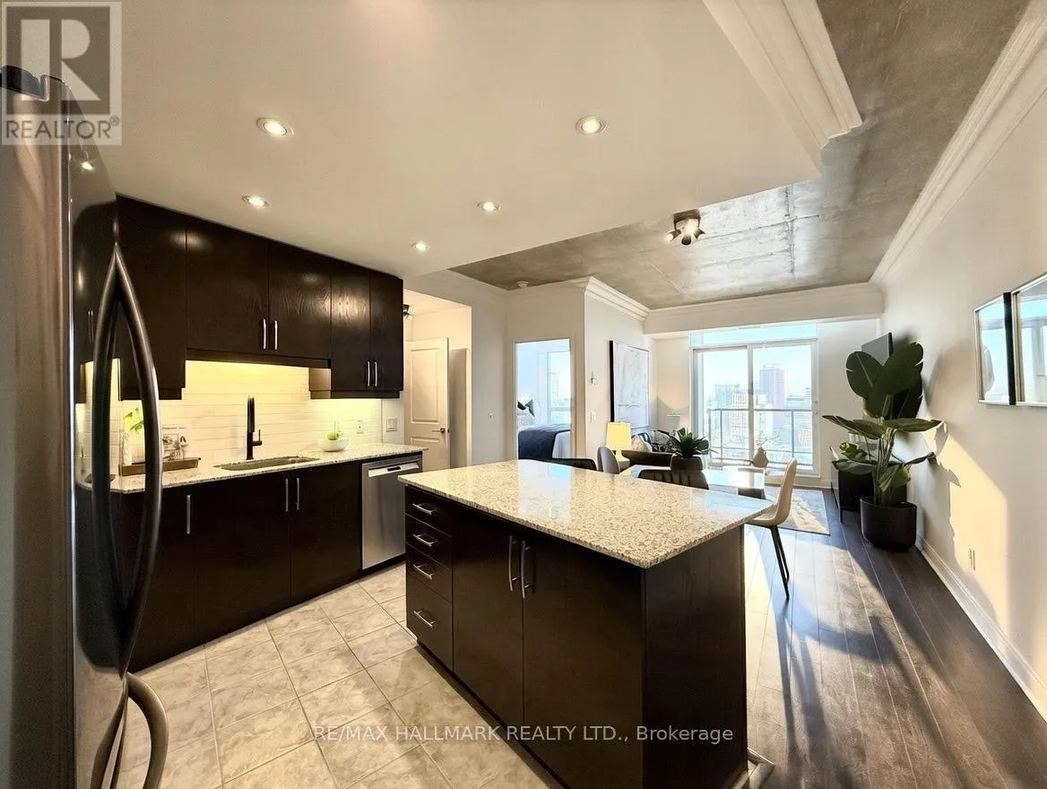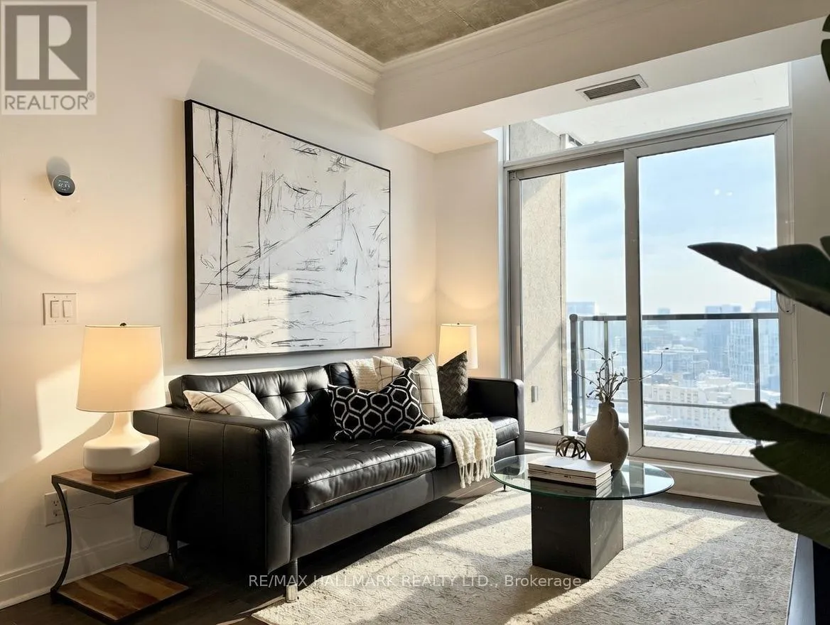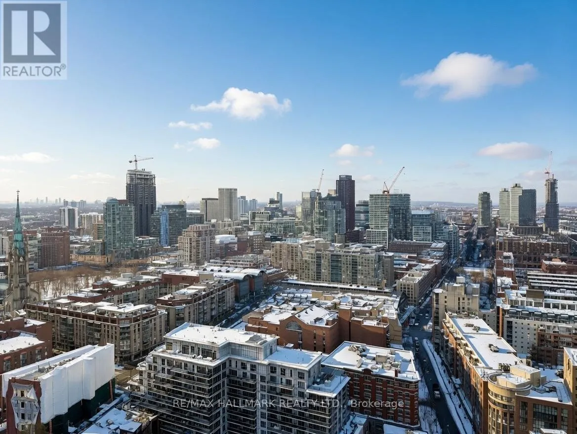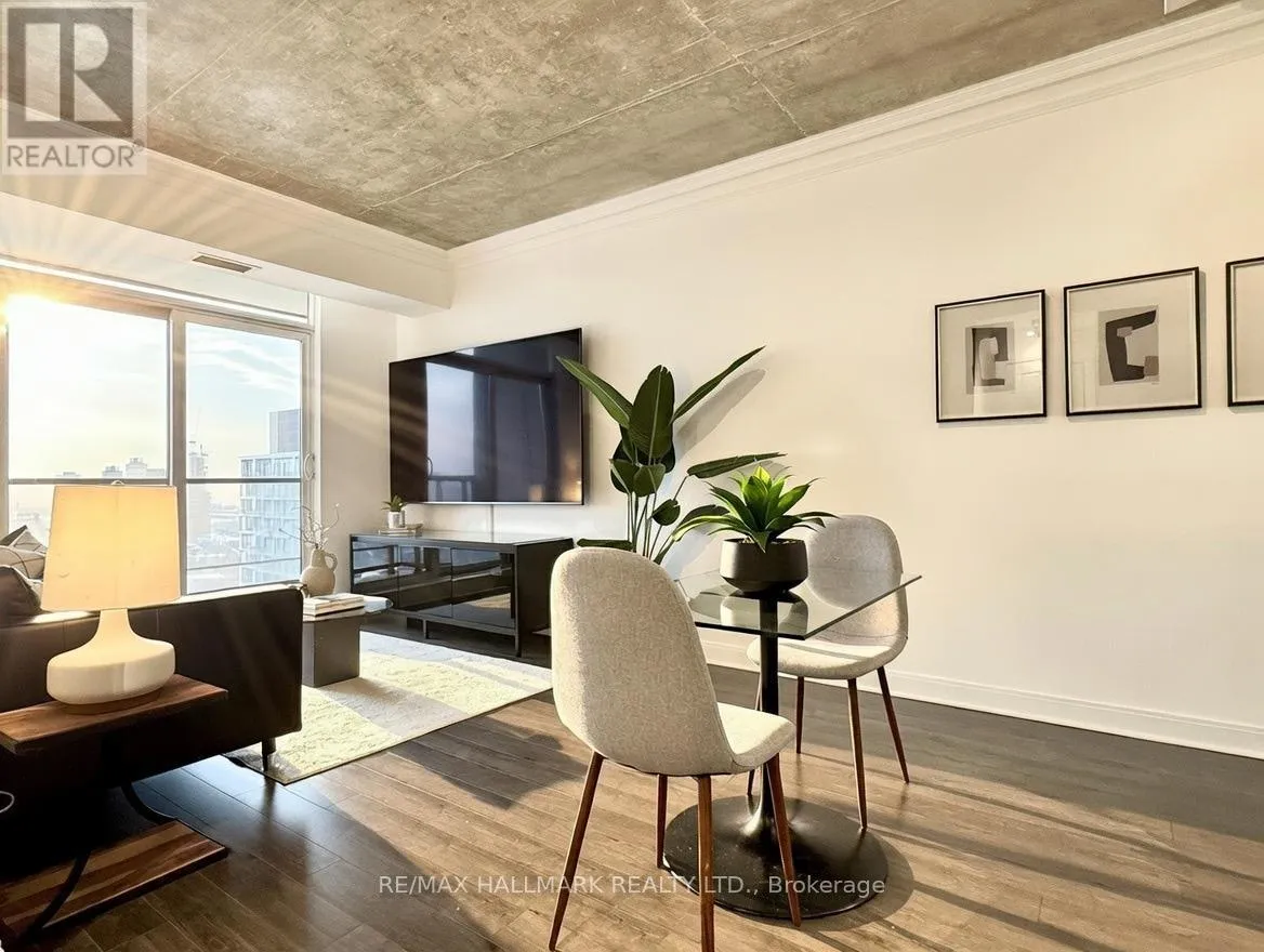 Cross Streets: Yonge/Front. ** Directions: https://share.google/ZOSGWDcMB87iiDPtP. Live on The Esplanade in this bright, high floor, corner 1 bedroom suite offering 615 sq ft of well designed space with beautiful east views of the city and lake. Featuring 9 ft smooth exposed concrete ceilings that add height and character, giving the space a subtle loft inspired feel, along with dark espresso hardwood flooring throughout the living and dining areas. The functional kitchen is equipped with stainless steel appliances, granite countertops, an undermount sink, and a center island that doubles as a breakfast bar. The spacious bedroom is filled with natural light and offers a large closet with California Closet organizers. Marble bathroom, in suite laundry, and thoughtful storage including a custom coat California Closet organizer add to the comfort of the space. All appliances were recently purchased in 2025. This suite is being offered fully furnished with two large LG TVs (75" & 85"), couch, motorized king bed, and an entertainment unit included. Just bring your pillow and sheets. Option to assume a premium rental parking spot located directly by the garage door and close to the elevators for $200 per month, prepaid until June, giving you time to decide if you need it. Located in the iconic London on the Esplanade, tucked between Front Street and the waterfront, steps to the Financial District, St. Lawrence Market, Union Station, The PATH, Sugar Beach, Metro, LCBO, restaurants, shopping, and transit. Walk Score 100. Building amenities include 24 hour concierge, rooftop outdoor pool, full fitness center and spa, party room, theatre room, library, and guest suites. (id:27476)