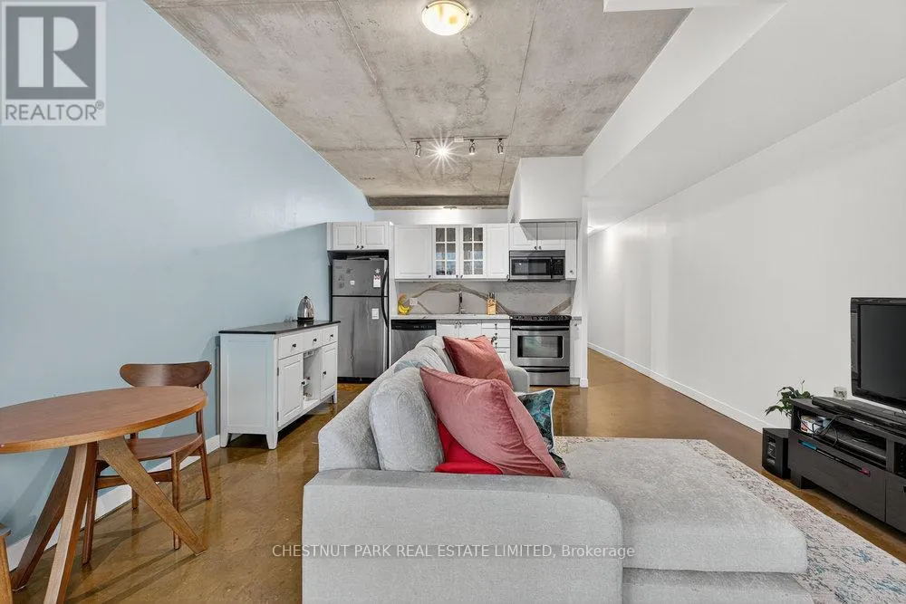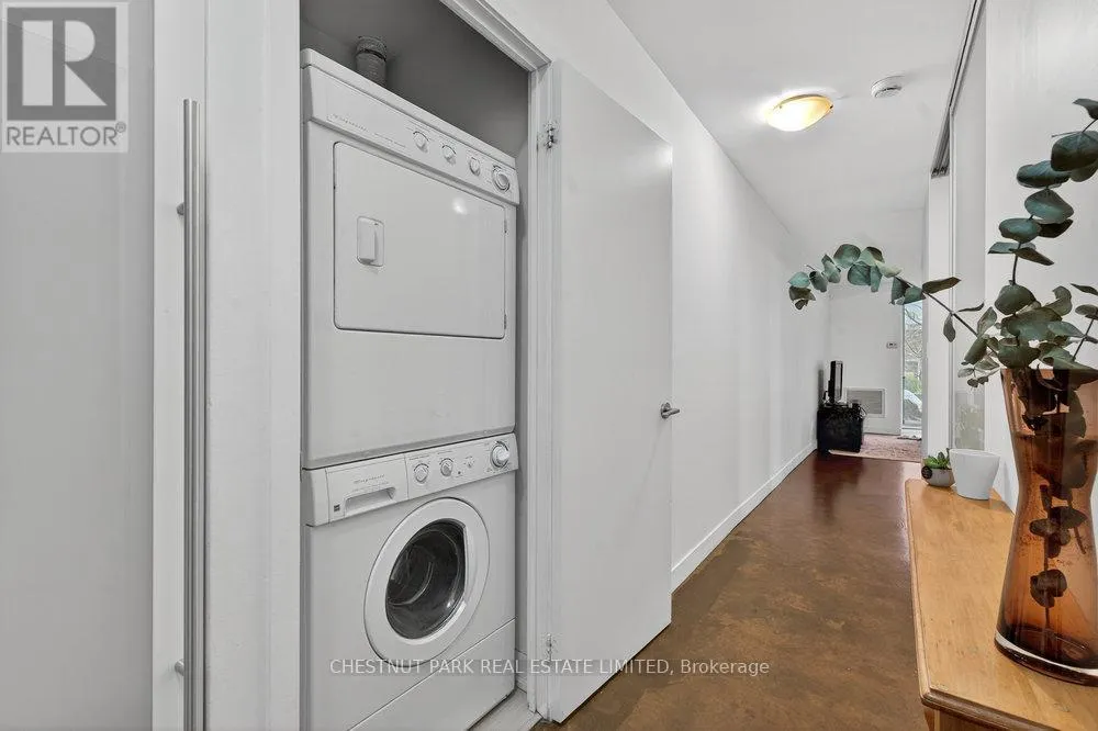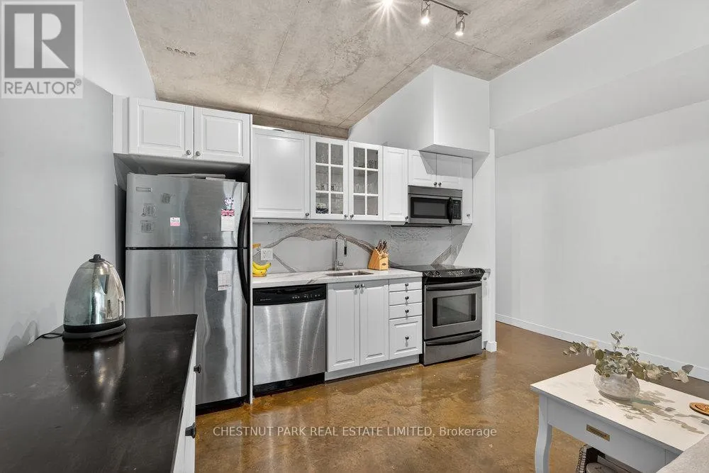 Cross Streets: Queen St E & Carlaw Ave. ** Directions: Carlaw north of Queen. Authentic loft living in the heart of Leslieville at The Printing Factory Lofts. This ground floor suite offers 668 sq.ft. of living with exposed concrete ceilings and polished concrete floors throughout. The updated open concept kitchen features stainless steel appliances. Step outside to an approximately 200 sq.ft. terrace, ideal for BBQs and warm weather entertaining, overlooking a quiet, private courtyard. Leslieville is one of Toronto's most loved east end neighbourhoods, known for its shops, top cafés, standout dining, and an easy, walkable vibe that feels like a community. Weekends are made for brunch, local bakeries, and a stroll through nearby parks, with quick transit options when it is time to head downtown. Tenant responsible for hydro, gas, wifi, cable & internet. (id:27476)