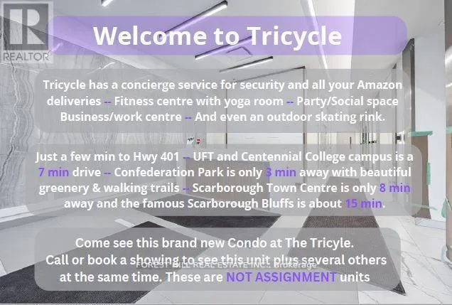 Markham Rd & Ellesmere Beautifully Designed & Laid Out this 3 Bedroom Unit Has 966sf Of Living Space & 13 ft Ceilings With Its Own Private 85sf Terrace. Plank Flooring Throughout, Updated Backsplash And Under Mount Sink. This Unit Is Brand New. The Building Offers A Concierge Service, Party/Rec Room, Fitness Room With Yoga Area And A Business/Work Centre. Few Min To Hwy 401. U Of T Campus And Centennial Campus Is A 7 Min Drive. Ellesmere Junior, North Bendale, Henry Hudson And Churchill Heights Schools Are Within 5 Min. Confederation Park Only 3 Min Away So You Can Enjoy All The Greenery & Walking Trails. Scarborough Town Centre Is Only 8 Min And The Famous Scarborough Bluffs Is About 15 Min. **Take advantage of the New Mortgage rule changes that will help with lower deposits and/or longer amortization. Please Speak to your Banks Mortgage specialist or Mortgage Broker.** **EXTRAS** Brand New Units At The Tricycle Just Released, All With Tarion Warranty. One Parking And 3 Lockers Included. (id:27476)