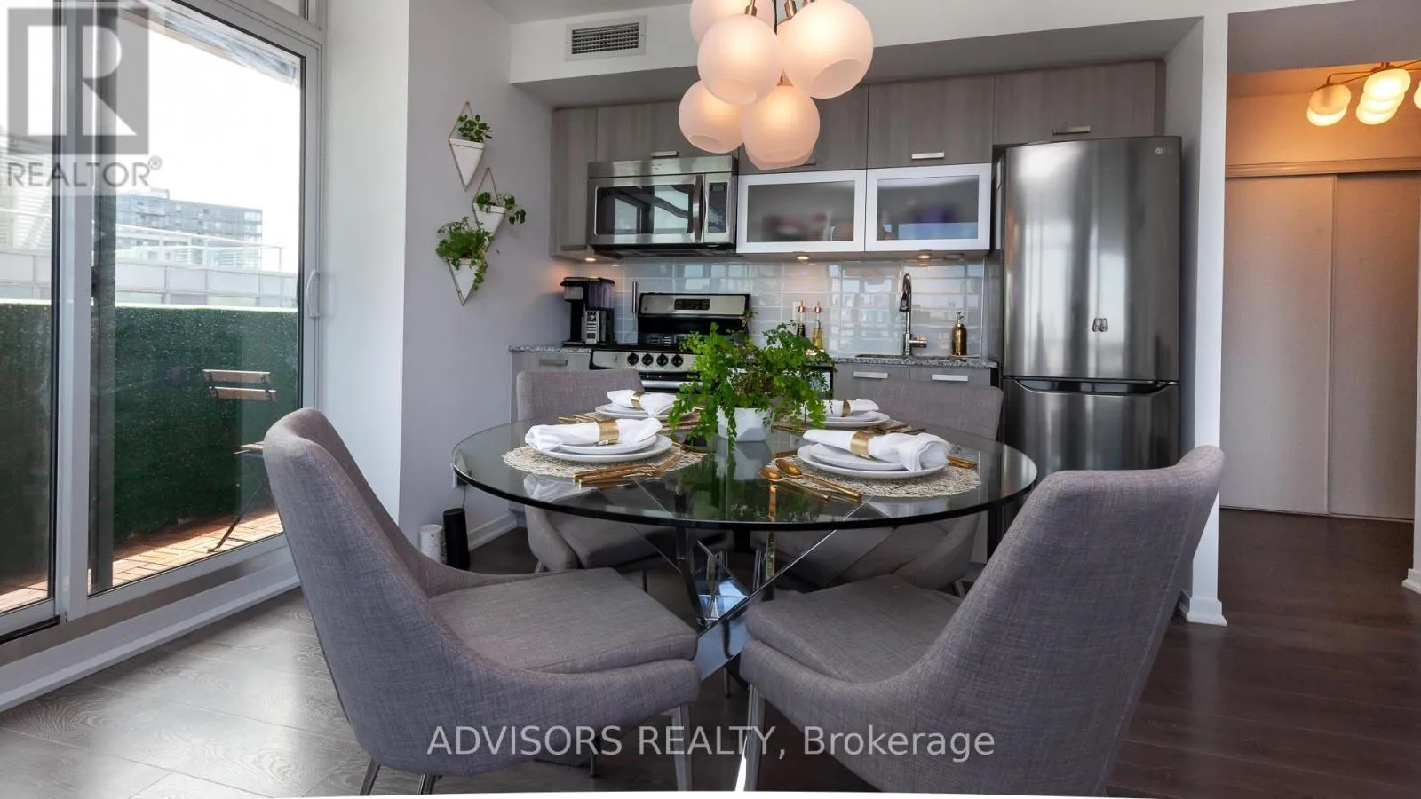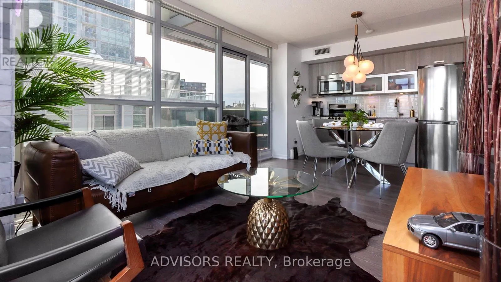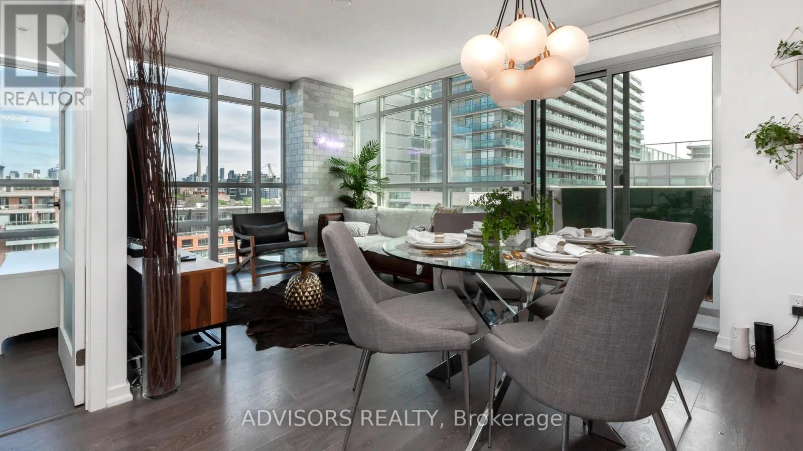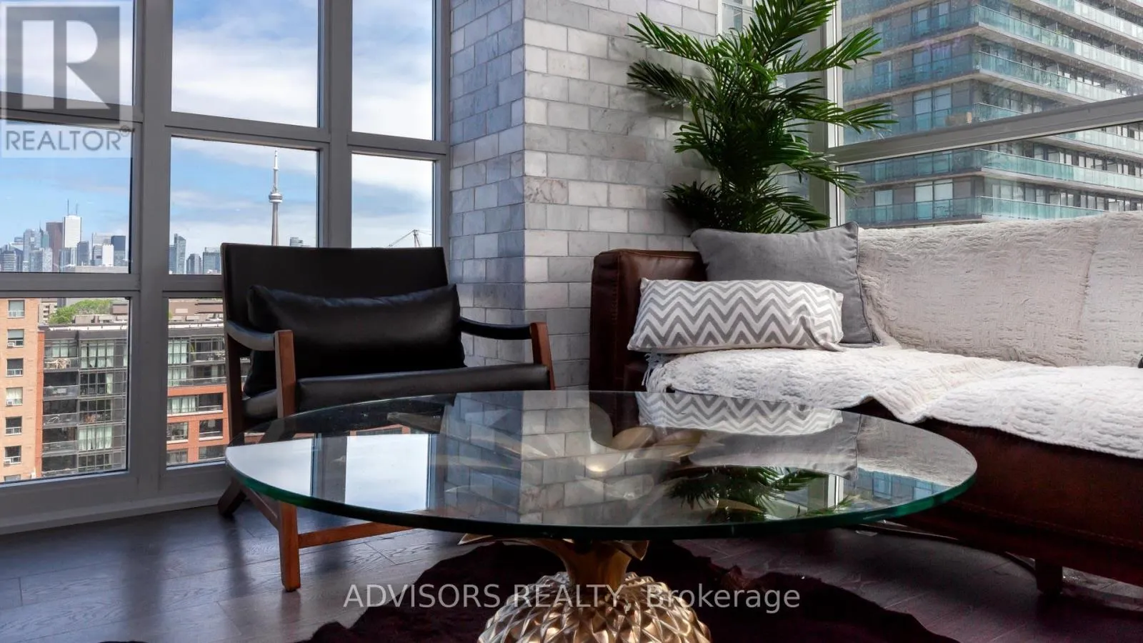Queen/Dufferin Welcome to this fully furnished corner suite at Epic on Triangle Park in the heart of Queen West. Offering approx. 690 sq. ft., this bright and stylish condo features 2 bedrooms, 2 bathrooms, hardwood floors, high ceilings, and floor-to-ceiling windows. The modern kitchen includes stainless steel appliances, granite countertops, ample cabinetry, and a dining area seating four, fully equipped with cookware and tableware. The open-concept living space is tastefully furnished and opens to a private balcony with city views. The primary bedroom offers a king-size bed, the second bedroom a queen-size bed, both with quality finishes and generous storage. Rent includes in-suite laundry, internet, water, hydro, Bell Fibe TV, air conditioning, smart home features, and one parking space; pets not permitted. Residents enjoy premium amenities including a fitness centre, rooftop patio, concierge, security, lounge, party and media rooms, saunas, and guest suites. Exceptional location with a Walk Score of 95 and Transit Score of 100, steps to TTC, dining, shopping, Liberty Village, Ossington Strip, and quick access to the Gardiner. Enjoy the shopping, cafes and dining that Queen West, Liberty Village, Ossington Strip, or Little Italy/Portugal have to offer or venture to the infamous Drake Hotel, The Gladstone Hotel, and some of the best coffee shops, pizza parlors, and even fine dining minutes away. Your monthly rental payment encompasses essential utilities such as electricity, internet services and water usage (caps may apply). Additionally, $295 move-out cleaning fee and building move fees may apply. (id:27476)